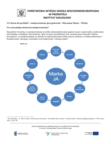 PAŃSTWOWA WYŻSZA SZKOŁA WSCHODNIOEUROPEJSKA W PRZEMYŚLU INSTYTUT SOCJOLOGII 3.9. Karta do portfolio1- Autoprezentacja (przygotowała - Marzanna Mazur - Witek) Na czym polega skuteczna autoprezentacja? Specjaliści twierdzą, że autoprezentacja to próba zakomunikowania poprzez nasze wypowiedzi, zachowania niewerbalne i działania, kim jesteśmy, albo za kogo chcielibyśmy być uważani przez innych9. Można powiedzieć, że autoprezentacja to sposób na zaprezentowanie siebie innym osobom, to sztuka budowania i kształtowania własnego wizerunku czyli budowania "własnej marki". 1 M. Rosalska., A. Wawrzonek, Od marzeń do kariery. Poradnik dla uczniów i absolwentów szkół ponadginazjalnych., Warszawa 2013, s.89- 96 ____________________________________________________________________________________________________________ Studia podyplomowe współfinansowane ze środków Unii Europejskiej w ramach Europejskiego Funduszu Społecznego Zasady kreowania wizerunku w sieci: – pomyśl, kto i w jakim celu będzie oglądał zamieszczone w sieci zdjęcia, zastanów się dwa razy, zanim zamieścisz kolejne zdjęcie z serii „ja na kacu” albo „sexy girl” – zdjęcia zamieszczone w sieci nie muszą być oficjalne i nudne, ważne tylko, aby nie przekraczały granic dobrego smaku – nie używaj wulgarnego słownictwa i nie obrażaj innych, to raczej nie wpłynie pozytywnie na Twój wizerunek – zastanów się, do jakich grup dyskusyjnych lub na jakie fora się zapisać – rekruterzy będą Cię kojarzyli z tymi grupami – zastanów się nad stworzeniem profesjonalnej wizytówki, profilu, gdzie zaprezentujesz istotne informacje na swój temat. Mój profil zawodowy w sieci. Poproś przyjaciół, aby go za ciebie zrobili. 1. Informacje kluczowe .............................................................................................................................................................................. .............................................................................................................................................................................. .............................................................................................................................................................................. .................................................................................. 2. Umiejętności .............................................................................................................................................................................. .............................................................................................................................................................................. .............................................................................................................................................................................. .................................................................................. 3. Cechy charakteru .............................................................................................................................................................................. .............................................................................................................................................................................. .............................................................................................................................................................................. .................................................................................. 4. Zainteresowania ____________________________________________________________________________________________________________ Studia podyplomowe współfinansowane ze środków Unii Europejskiej w ramach Europejskiego Funduszu Społecznego .............................................................................................................................................................................. .............................................................................................................................................................................. .............................................................................................................................................................................. .................................................................................. 5. Ciekawostki .............................................................................................................................................................................. .............................................................................................................................................................................. .............................................................................................................................................................................. .................................................................................. Czy efekty pracy uznasz za zadawalające? ____________________________________________________________________________________________________________ Studia podyplomowe współfinansowane ze środków Unii Europejskiej w ramach Europejskiego Funduszu Społecznego