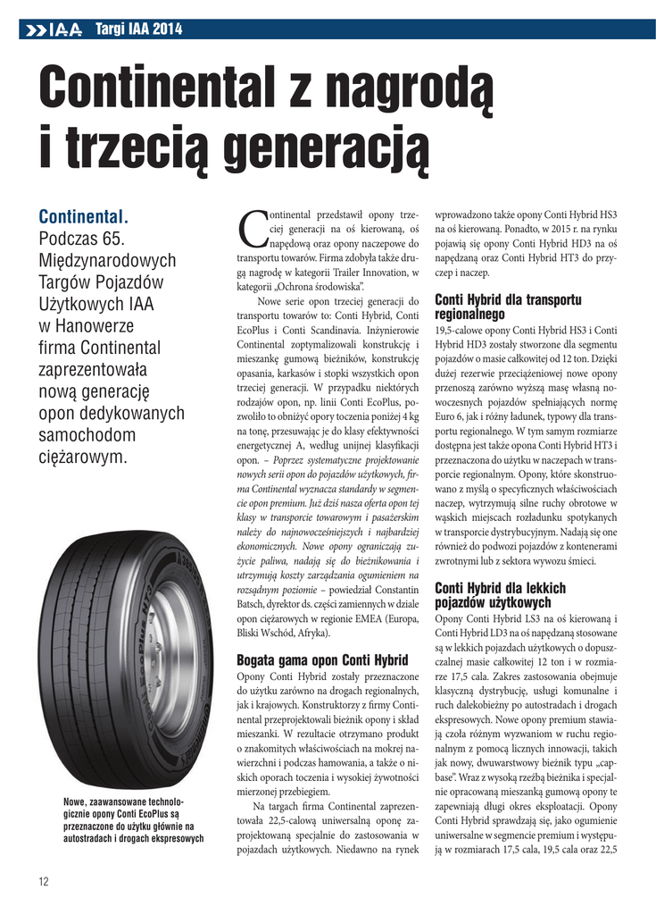 Targi IAA 2014 Continental z nagrodą i trzecią generacją Continental. Podczas 65. Międzynarodowych Targów Pojazdów Użytkowych IAA w Hanowerze firma Continental zaprezentowała nową generację opon dedykowanych samochodom ciężarowym. C ontinental przedstawił opony trzeciej generacji na oś kierowaną, oś napędową oraz opony naczepowe do transportu towarów. Firma zdobyła także drugą nagrodę w kategorii Trailer Innovation, w kategorii „Ochrona środowiska”. Nowe serie opon trzeciej generacji do transportu towarów to: Conti Hybrid, Conti EcoPlus i Conti Scandinavia. Inżynierowie Continental zoptymalizowali konstrukcję i mieszankę gumową bieżników, konstrukcję opasania, karkasów i stopki wszystkich opon trzeciej generacji. W przypadku niektórych rodzajów opon, np. linii Conti EcoPlus, pozwoliło to obniżyć opory toczenia poniżej 4 kg na tonę, przesuwając je do klasy efektywności energetycznej A, według unijnej klasyfikacji opon. – Poprzez systematyczne projektowanie nowych serii opon do pojazdów użytkowych, firma Continental wyznacza standardy w segmencie opon premium. Już dziś nasza oferta opon tej klasy w transporcie towarowym i pasażerskim należy do najnowocześniejszych i najbardziej ekonomicznych. Nowe opony ograniczają zużycie paliwa, nadają się do bieżnikowania i utrzymują koszty zarządzania ogumieniem na rozsądnym poziomie – powiedział Constantin Batsch, dyrektor ds. części zamiennych w dziale opon ciężarowych w regionie EMEA (Europa, Bliski Wschód, Afryka). Bogata gama opon Conti Hybrid Nowe, zaawansowane technologicznie opony Conti EcoPlus są przeznaczone do użytku głównie na autostradach i drogach ekspresowych 12 Opony Conti Hybrid zostały przeznaczone do użytku zarówno na drogach regionalnych, jak i krajowych. Konstruktorzy z firmy Continental przeprojektowali bieżnik opony i skład mieszanki. W rezultacie otrzymano produkt o znakomitych właściwościach na mokrej nawierzchni i podczas hamowania, a także o niskich oporach toczenia i wysokiej żywotności mierzonej przebiegiem. Na targach firma Continental zaprezentowała 22,5-calową uniwersalną oponę zaprojektowaną specjalnie do zastosowania w pojazdach użytkowych. Niedawno na rynek wprowadzono także opony Conti Hybrid HS3 na oś kierowaną. Ponadto, w 2015 r. na rynku pojawią się opony Conti Hybrid HD3 na oś napędzaną oraz Conti Hybrid HT3 do przyczep i naczep. Conti Hybrid dla transportu regionalnego 19,5-calowe opony Conti Hybrid HS3 i Conti Hybrid HD3 zostały stworzone dla segmentu pojazdów o masie całkowitej od 12 ton. Dzięki dużej rezerwie przeciążeniowej nowe opony przenoszą zarówno wyższą masę własną nowoczesnych pojazdów spełniających normę Euro 6, jak i różny ładunek, typowy dla transportu regionalnego. W tym samym rozmiarze dostępna jest także opona Conti Hybrid HT3 i przeznaczona do użytku w naczepach w transporcie regionalnym. Opony, które skonstruowano z myślą o specyficznych właściwościach naczep, wytrzymują silne ruchy obrotowe w wąskich miejscach rozładunku spotykanych w transporcie dystrybucyjnym. Nadają się one również do podwozi pojazdów z kontenerami zwrotnymi lub z sektora wywozu śmieci. Conti Hybrid dla lekkich pojazdów użytkowych Opony Conti Hybrid LS3 na oś kierowaną i Conti Hybrid LD3 na oś napędzaną stosowane są w lekkich pojazdach użytkowych o dopuszczalnej masie całkowitej 12 ton i w rozmiarze 17,5 cala. Zakres zastosowania obejmuje klasyczną dystrybucję, usługi komunalne i ruch dalekobieżny po autostradach i drogach ekspresowych. Nowe opony premium stawiają czoła różnym wyzwaniom w ruchu regionalnym z pomocą licznych innowacji, takich jak nowy, dwuwarstwowy bieżnik typu „capbase”. Wraz z wysoką rzeźbą bieżnika i specjalnie opracowaną mieszanką gumową opony te zapewniają długi okres eksploatacji. Opony Conti Hybrid sprawdzają się, jako ogumienie uniwersalne w segmencie premium i występują w rozmiarach 17,5 cala, 19,5 cala oraz 22,5 cala. Opony na oś kierowaną z nowej serii Conti Hybrid mają etykietę M+S, a opony na oś napędzaną — homologację M+S oraz symbol płatka śniegu na tle gór (3PMSF). gama opon zimowych jest dostępna w najpopularniejszych rozmiarach: 17,5 i 19,5 cala. Redukcja zużycia paliwa z Conti EcoPlus Oferta bieżnikowanych opon z zakładów ContiLifeCycle w Stöcken w Niemczech pomaga oszczędzać zasoby naturalne i zoptymalizować całkowite koszty eksploatacji. W nowoczesnym procesie bieżnikowania na gorąco karkas opony do samochodu ciężarowego otrzymuje drugie życie. Klienci mogą wybierać między asortymentem opon bieżnikowanych na gorąco ContiRe – obecnie poszerzonym o opony 3. generacji – a kompleksową ofertą wzorów bieżnika ContiTread do bieżnikowania na zimno. Ulepszony karkas opon ze sztywniejszym opasaniem poprawia wytrzymałość nowych opon, a jednocześnie ułatwia ich bieżnikowanie. Nowe, zaawansowane technologicznie opony Conti EcoPlus są przeznaczone do użytku głównie na autostradach i drogach ekspresowych. Charakteryzują się niskimi oporami toczenia. Opon można używać na każdej osi samochodu ciężarowego i przyczepy — HS3 na osi kierowanej, HD3 na osi napędzanej, a HT3 na osiach przyczepy. Wysoka jakość wykonania opon sprawia, że mogą się one przyczynić do redukcji poziomu zużycia paliwa nawet o 1,9 litra na 100 kilometrów w porównaniu z poprzednimi generacjami przy zachowaniu jednakowych przebiegów. Wynika to przede wszystkim z zastosowania nowych, polimerowo-gumowych mieszanek bieżnika i ścian bocznych oraz dwuwarstwowej konstrukcji „cap-base” i szczególnej struktury wzoru bieżnika. Conti Scandinavia – idzie zima Gdy robi się zimno, Continental zaleca stosowanie specjalnych opon zimowych – Conti Scandinavia. Opony te spełniają wymagania dla konkretnych osi, np. optymalne kierowanie i prowadzenie poprzeczne na osi przedniej, najlepsza trakcja