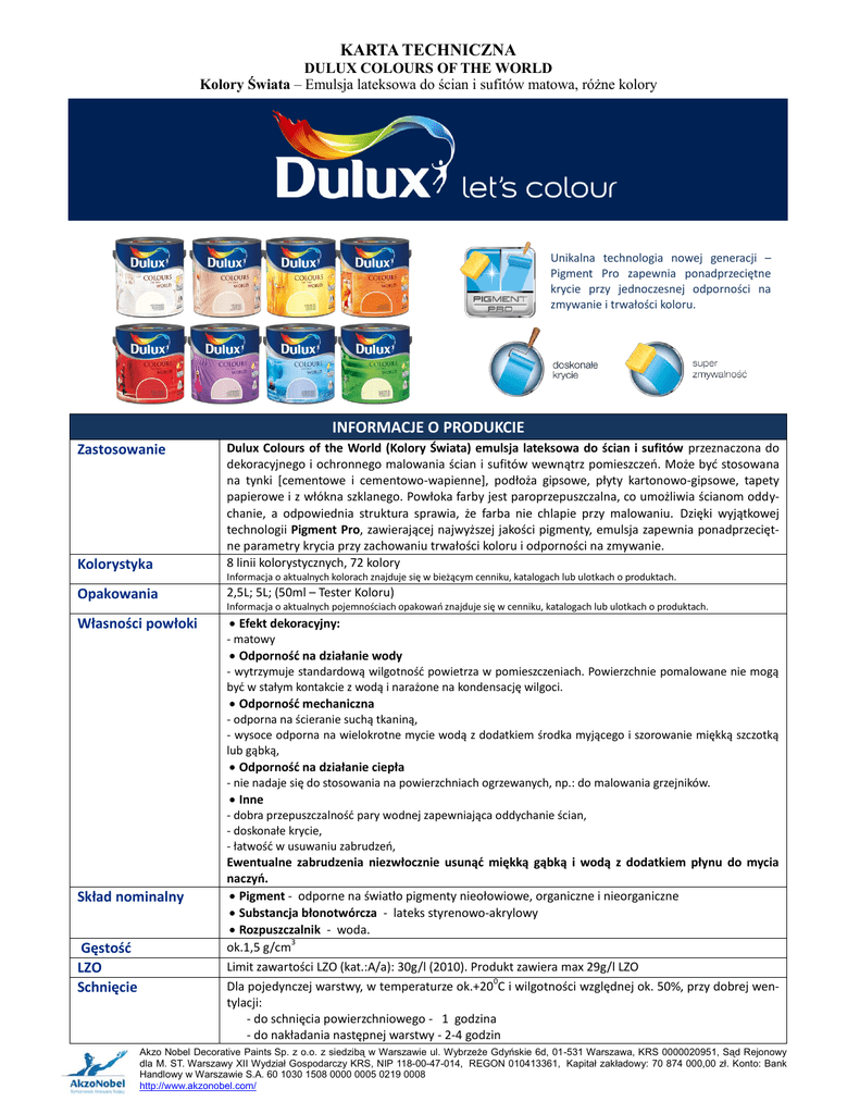 KARTA TECHNICZNA DULUX COLOURS OF THE WORLD Kolory Świata – Emulsja lateksowa do ścian i sufitów matowa, różne kolory Unikalna technologia nowej generacji – Pigment Pro zapewnia ponadprzeciętne krycie przy jednoczesnej odporności na zmywanie i trwałości koloru. INFORMACJE O PRODUKCIE Kolorystyka Dulux Colours of the World (Kolory Świata) emulsja lateksowa do ścian i sufitów przeznaczona do dekoracyjnego i ochronnego malowania ścian i sufitów wewnątrz pomieszczeo. Może byd stosowana na tynki [cementowe i cementowo-wapienne], podłoża gipsowe, płyty kartonowo-gipsowe, tapety papierowe i z włókna szklanego. Powłoka farby jest paroprzepuszczalna, co umożliwia ścianom oddychanie, a odpowiednia struktura sprawia, że farba nie chlapie przy malowaniu. Dzięki wyjątkowej technologii Pigment Pro, zawierającej najwyższej jakości pigmenty, emulsja zapewnia ponadprzeciętne parametry krycia przy zachowaniu trwałości koloru i odporności na zmywanie. 8 linii kolorystycznych, 72 kolory Opakowania 2,5L; 5L; (50ml – Tester Koloru) Zastosowanie Własności powłoki Informacja o aktualnych kolorach znajduje się w bieżącym cenniku, katalogach lub ulotkach o produktach. Informacja o aktualnych pojemnościach opakowao znajduje się w cenniku, katalogach lub ulotkach o produktach. Efekt dekoracyjny: - matowy Odpornośd na działanie wody - wytrzymuje standardową wilgotnośd powietrza w pomieszczeniach. Powierzchnie pomalowane nie mogą byd w stałym kontakcie z wodą i narażone na kondensację wilgoci. Odpornośd mechaniczna - odporna na ścieranie suchą tkaniną, - wysoce odporna na wielokrotne mycie wodą z dodatkiem środka myjącego i szorowanie miękką szczotką lub gąbką, Odpornośd na działanie ciepła - nie nadaje się do stosowania na powierzchniach ogrzewanych, np.: do malowania grzejników. Inne - dobra przepuszczalnośd pary wodnej zapewniająca oddychanie ścian, - doskonałe krycie, - łatwośd w usuwaniu zabrudzeo, Skład nominalny Gęstośd LZO Schnięcie Ewentualne zabrudzenia niezwłocznie usunąd miękką gąbką i wodą z dodatkiem płynu do mycia naczyo. Pigment - odporne na światło pigmenty nieołowiowe, organiczne i nieorganiczne Substancja błonotwórcza - lateks styrenowo-akrylowy Rozpuszczalnik - woda. ok.1,5 g/cm3 Limit zawartości LZO (kat.:A/a): 30g/l (2010). Produkt zawiera max 29g/l LZO Dla pojedynczej warstwy, w temperaturze ok.+200C i wilgotności względnej ok. 50%, przy dobrej wentylacji: - do schnięcia powierzchniowego - 1 godzina - do nakładania następnej warstwy - 2-4 godzin Akzo Nobel Decorative Paints Sp. z o.o. z siedzibą w Warszawie ul. Wybrzeże Gdyńskie 6d, 01-531 Warszawa, KRS 0000020951, Sąd Rejonowy dla M. ST. Warszawy XII Wydział Gospodarczy KRS, NIP 118-00-47-014, REGON 010413361, Kapitał zakładowy: 70 874 000,00 zł. Konto: Bank Handlowy w Warszawie S.A. 60 1030 1508 0000 0005 0219 0008 http://www.akzonobel.com/ KARTA TECHNICZNA DULUX COLOURS OF THE WORLD Kolory Świata – Emulsja lateksowa do ścian i sufitów matowa, różne kolory Obniżenie temperatury i/lub wzrost wilgotności może wydłużyd czas schnięcia. Ilośd warstw Wydajnośd Rozcieoczalnik Okres ważności Certyfikaty 1-2 warstwy Do 14m2/l przy jednokrotnym malowaniu na gładkiej, równej i odpowiednio przygotowanej powierzchni podłoża. Nie stosuje się. Produkt gotowy do użycia Dane identyfikujące wyrób oraz termin upływu ważności wyrobu podawany jest na opakowaniu jednostkowym. Pracujemy zgodnie z systemem zarządzania jakością ISO 9001:2008 STOSOWANIE PRODUKTU Przygotowanie wyrobu Przygotowanie podłoża Nie dodawad obcych składników. Nie rozcieoczad emulsji. Powierzchnie powinny byd zwarte, jednolite, czyste i suche (np. tynki malowad po 3-4 tygodniach sezonowania lub po czasie wskazanym przez producenta danego tynku, gładzi, szpachli). 1. Powłoki farb wapiennych, klejowych oraz słabo przyczepnych należy całkowicie usunąd z podłoża, a następnie powierzchnie przemyj wodą w celu usunięcia pylistych pozostałości i kurzu. Pozostaw do wyschnięcia. 2. Z powierzchni należy usunąd zanieczyszczenia ograniczające przyczepnośd farby. Zanieczyszczenia zmyj wodą ze środkiem myjącym. Pozostawid do wyschnięcia. 3. Powierzchnie zagrzybione oczyśd za pomocą szpachelki, a następnie zastosuj odpowiedni środek grzybobójczy. 4. Nierówności i uszkodzenia powierzchni wypełnij odpowiednią masą szpachlową, a następnie wyrównaj i wygładź. 5. Zagruntuj malowane powierzchnie: Podłoża jednolite, silnie nasiąkliwe, niestabilne, pylące i porowate np. gipsowe zagruntuj preparatem Dulux Grunt. Podłoża niejednolite, silnie nasiąkliwe, niestabilne, pylące i porowate: zagruntuj kolejno: etap 1: preparatem Dulux Grunt (dotyczy głównie miejsc szpachlowanych, spoin płyt gipsowokartonowych, po usunięciu farb klejowych i kredowych), etap 2: emulsją Dulux Acryl Matt rozcieoczoną dodatkiem 20-25% czystej wody (dotyczy całej powierzchni). Inne podłoża od wyżej wymienionych, a wcześniej nie malowanych np. porowate, stabilne, niepylące tynki cementowo-wapienne zagruntuj emulsją Dulux Acryl Matt rozcieoczoną dodatkiem 20-25% czystej wody. Podłoża wcześniej malowane farbami emulsyjnymi, których powierzchnia jest jednolita, dobrze przyczepna, nie jest pyląca lub uszkodzona malowad bez gruntowania. Uwaga! Na podłożach uprzednio malowanych wykonaj na małej powierzchni wymalowanie próbne. Jeżeli po wyschnięciu farby powstanie niepożądany efekt powierzchnie przygotuj zgodnie z powyższymi wskazówkami. Malowanie Warunki malowania: 0 0 - temperatura otoczenia i malowanej powierzchni powinna byd pomiędzy +10 C a +28 C - wilgotnośd względna powietrza powinna byd niższa niż 80% Zalecane metody malowania: - pędzel: najlepszy efekt uzyskasz stosując pędzle z włosia syntetycznego. - wałek: najlepszy efekt uzyskasz stosując wałki z runa naturalnego o długości runa 10-18 mm Nie wyklucza się zastosow