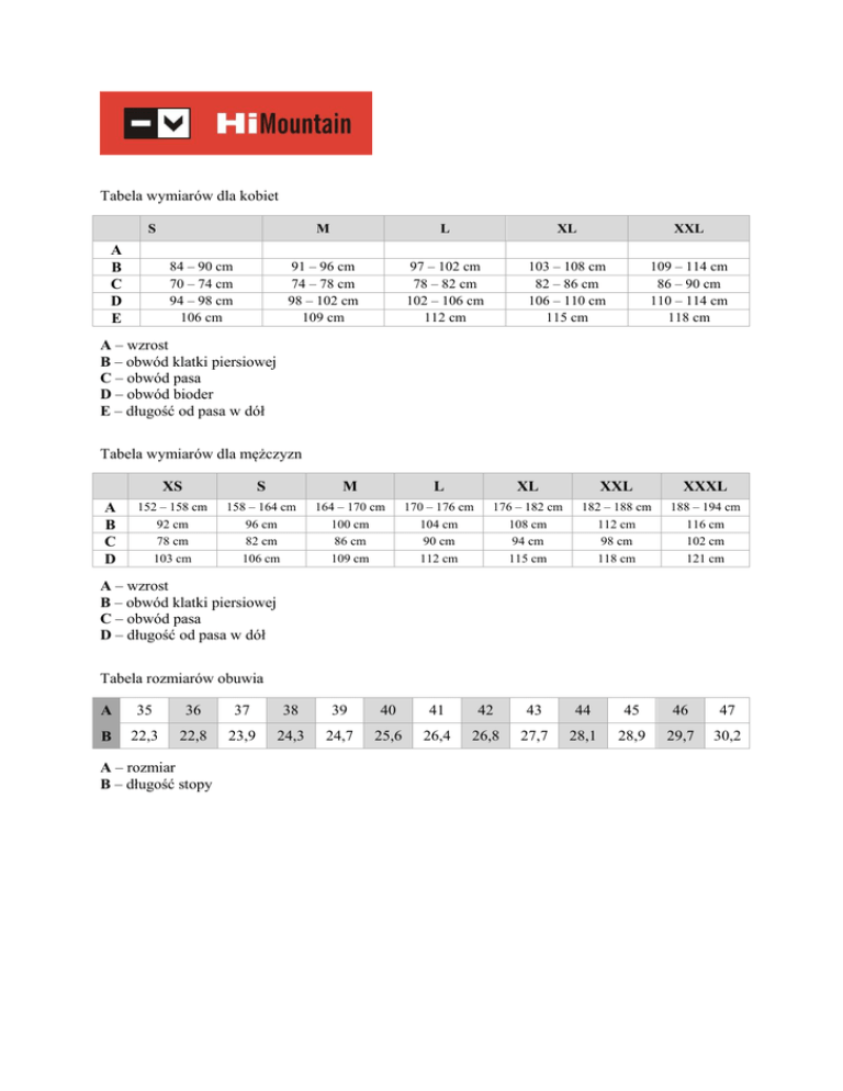 Tabela wymiarów dla kobiet S A B C D E 84 – 90 cm 70 – 74 cm 94 – 98 cm 106 cm M L XL XXL 91 – 96 cm 74 – 78 cm 98 – 102 cm 109 cm 97 – 102 cm 78 – 82 cm 102 – 106 cm 112 cm 103 – 108 cm 82 – 86 cm 106 – 110 cm 115 cm 109 – 114 cm 86 – 90 cm 110 – 114 cm 118 cm A – wzrost B – obwód klatki piersiowej C – obwód pasa D – obwód bioder E – długość od pasa w dół Tabela wymiarów dla mężczyzn A B C D XS S M L XL XXL XXXL 152 – 158 cm 92 cm 78 cm 103 cm 158 – 164 cm 96 cm 82 cm 106 cm 164 – 170 cm 100 cm 86 cm 109 cm 170 – 176 cm 104 cm 90 cm 112 cm 176 – 182 cm 108 cm 94 cm 115 cm 182 – 188 cm 112 cm 98 cm 118 cm 188 – 194 cm 116 cm 102 cm 121 cm A – wzrost B – obwód klatki piersiowej C – obwód pasa D – długość od pasa w dół Tabela rozmiarów obuwia A 35 36 37 38 39 40 41 42 43 44 45 46 47 B 22,3 22,8 23,9 24,3 24,7 25,6 26,4 26,8 27,7 28,1 28,9 29,7 30,2 A – rozmiar B – długość stopy