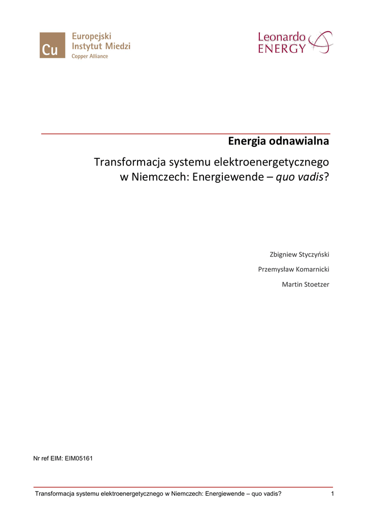 Energia odnawialna Transformacja systemu elektroenergetycznego w Niemczech: Energiewende – quo vadis? Zbigniew Styczyński Przemysław Komarnicki Martin Stoetzer Nr ref EIM: EIM05161 Transformacja systemu elektroenergetycznego w Niemczech: Energiewende – quo vadis? 1 Abstract This article aims to answer the question on how proceeded and proceeds the transformation of the power system in Germany, and whether it will end with the expected success. The authors for many years have been actively participating in the work on the energy system transformation in Germany (some of them for more than 25 years) and share here their personal observations made on the background of the development of regional and global (Germany-wide) transformation known as Energiewende. As such, this study does not pretend, however, to be recognized as a comprehensive study of the Energiewende issues. Transformacja systemu elektroenergetycznego w Niemczech: Energiewende – quo vadis? 2 Prolog Zmierzch energii jądrowej W latach 80. zeszłego wieku zachodnia Europa posiadała stabilne, w zasadzie narodowe rynki energii elektrycznej. Zużycie energii elektrycznej wzrastało proporcjonalnie do wzrostu produktu krajowego brutto prawie we wszystkich krajach zachodniej Europy. Produkcja energii elektrycznej w elektrowniach jądrowych, w kombinacji z wytwarzaniem energii w elektrowniach węglowych, była gwarantem stabilności wytwarzania energii elektrycznej na wiele lat. Natomiast w Chinach, Indiach i innych krajach rozwijających się rynki energii znajdowały się w fazie rozwoju i emisja gazów cieplarnianych nie była w centrum uwagi tych społeczności. Istotny sygnał zakłócenia tego porządku pojawił się 26 kwietnia 1986 roku i związany był z incydentem w elektrowni jądrowej w Czarnobylu. Ten tragiczny w skutkach zarówno dla ludności jak i środowiska incydent uwidocznił niezwykłe ryzyko jakie niesie ze sobą stosowanie energii jądrowej. Również problemy z przechowywaniem odpadów radioaktywnych a następnie wypadek w Fukushimie 12 marca 2011 roku umocniły negatywne nastawienie znacznej części społeczeństwa (szczególnie w Niemczech) do energii jądrowej niezależnie od faktu, że ta technologia wytwarzania energii elektrycznej jest bezemisyjna. Zmiana struktury systemu elektroenergetycznego Już we wczesnych latach 80. poprzedniego wieku można było zaobserwować trend w kierunku modernizacji struktur systemów elektroenergetycznych. Takie kraje jak np. Dania zdecydowały się na rozwój systemu energetycznego bazującego na energii wiatrowej. Rozpoczęto prowadzenie rozległych badań nad rozwojem technologii ogniw fotowoltaicznych (PV), biomasy, geotermii, energii fal morskich czy innych, ale pierwsze wyniki były zniechęcające – nowe technologie wytwarzania energii okazały się bardzo drogie, ich niezawodność działania była dyskusyjna, a współczynnik sprawności niski w porównaniu do innych powszechnie stosowanych technologii, przez co zapotrzebowanie na nie było znikome. Wymagały one dalszego rozwoju i przy braku odpowiednich mechanizmów wsparcia tylko pionierzy tego ruchu byli gotowi inwestować i wykorzystywać te technologie. Równolegle zajęto się również tematem możliwości integracyjnych nowych źródeł wytwarzania energii z siecią elektroenergetyczną. Sieć elektryczna była bowiem planowana i budowana zawsze w koncepcji jednokierunkowego przepływu energii (top-down) od elektrowni jako źródeł energii do użytkowników czyli odbiorców energii. Należało zmienić tę zasadę w planowaniu nowych sieci elektroenergetycznych by umożliwić optymalną integrację nowych źródeł zlokalizowanych głównie w sieci rozdzielczej. Pierwsze praktyczne próby budowy zoptymalizowanych sieci rozpoczęły się we wczesnych latach 90. XX wieku. Do pewnej, nieznacznej, części sieci były już podłączone ogniwa fotowoltaiczne, małe generatory wiatrowe jak również zasobniki energii (w tym wypadku baterie typu NAS). Jednak technika owych czasów była niestety dalej zawodna. Pierwsze praktyczne eksperymenty zakończyły się fiaskiem, a niektóre przedsiębiorstwa poniosły nawet znaczne straty finansowe. Te negatywne wyniki utwierdziły konserwatywnie nastawionych do zmian operatorów sieciowych w potrzebie kontynuacji kursu rozwoju zcentralizowanego systemu energetycznego. Właściwego rozpędu nabrały zmiany w systemie energetycznym dopiero po uchwaleniu odpowiednich ustaw. W roku 1991 w Niemczech uchwalono obowiązkowy odbiór energii elektrycznej wyprodukowanej z odnawialnych źródeł energii (OZE). Zgodnie z tym prawem zakłady energetyczne zostały zobligowane do przyłączenia odnawialnych źródeł energii i pokrycia kosztów tego przyłączenia. Nieznaczna stała subwencja była też przewidziana i wypłacana w ramach tego rozporządzenia wytwórcom energii elektrycznej ze źródeł odnawialnych. Energiewende od lat 90. na przykładzie kraju związkowego Saksonia-Anhalt W roku 1997 Uniwersytet w Magdeburgu imienia Ottona-von-Guericke utworzył nową katedrę Integracji sieciowej odnawialnych źródeł energii. Była to jedna z pierwszych dedykowana temu tematowi badawczemu katedra w Niemczech. Katedra została obsadzona i rozpoczęła pracę w roku 1999. Wtedy jeszcze przyszłość OZE nie była ostatecznie jasna. Transformacja systemu elektroenergetycznego w Niemczech: Energiewende – quo vadis? 3 Sytuacja ta uległa drastycznej zmianie wraz z ustanowieniem w roku 2001 prawa o odnawialnych źródłach energii, zwanego w skrócie EEG (Erneuerbaren Energie Gesetz). W prawie tym i jego kolejnych nowelach zawarty został mechanizm transferu kosztów opłat za energię na wsparcie rozwoju odnawialnych źródeł energii. Przewidziane kwoty wsparcia pozwalały na pokrycie rzeczywistych kosztów drogiej wówczas energii odnawialnej i wynosiły 50,6 €cent/kWh dla PV i pomiędzy 6,19 a 10,23 €cent/kWh dla energii wiatrowej, biomasy i energii wodnej. Wprow