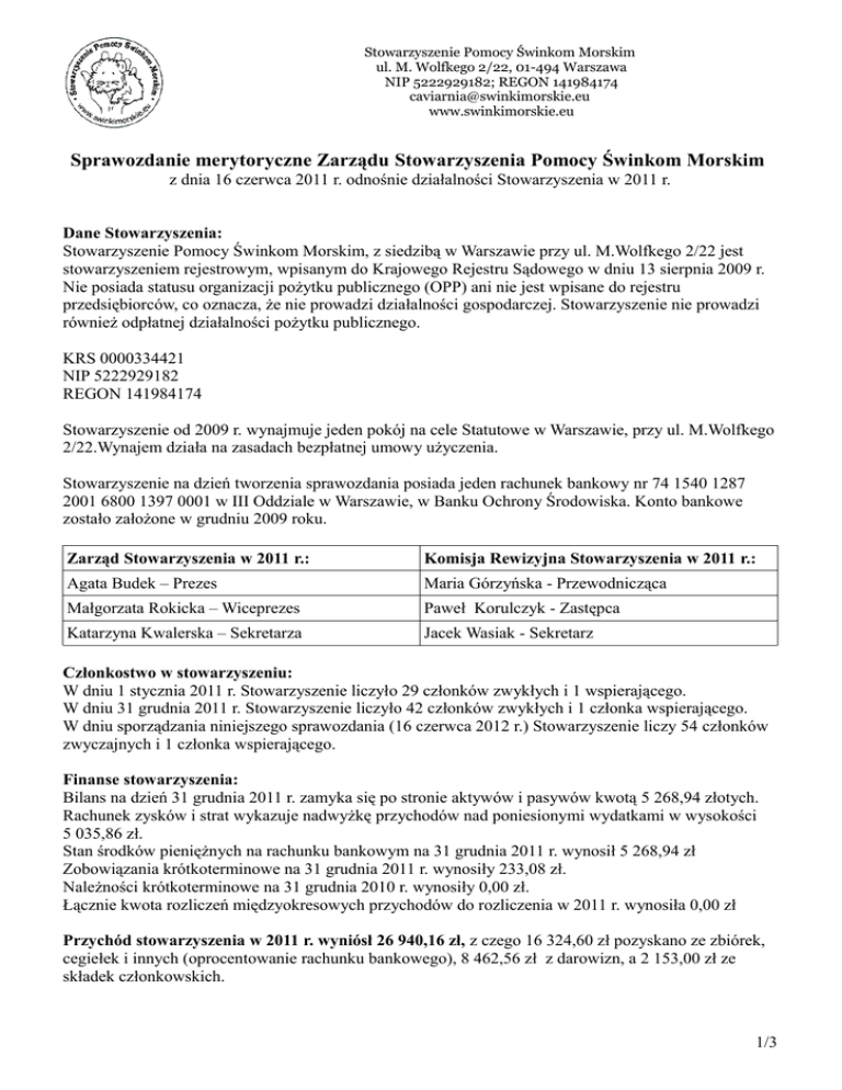 _ Stowarzyszenie Pomocy Świnkom Morskim ul. M. Wolfkego 2/22, 01-494 Warszawa NIP 5222929182; REGON 141984174 [email protected] www.swinkimorskie.eu Sprawozdanie merytoryczne Zarządu Stowarzyszenia Pomocy Świnkom Morskim z dnia 16 czerwca 2011 r. odnośnie działalności Stowarzyszenia w 2011 r. Dane Stowarzyszenia: Stowarzyszenie Pomocy Świnkom Morskim, z siedzibą w Warszawie przy ul. M.Wolfkego 2/22 jest stowarzyszeniem rejestrowym, wpisanym do Krajowego Rejestru Sądowego w dniu 13 sierpnia 2009 r. Nie posiada statusu organizacji pożytku publicznego (OPP) ani nie jest wpisane do rejestru przedsiębiorców, co oznacza, że nie prowadzi działalności gospodarczej. Stowarzyszenie nie prowadzi również odpłatnej działalności pożytku publicznego. KRS 0000334421 NIP 5222929182 REGON 141984174 Stowarzyszenie od 2009 r. wynajmuje jeden pokój na cele Statutowe w Warszawie, przy ul. M.Wolfkego 2/22.Wynajem działa na zasadach bezpłatnej umowy użyczenia. Stowarzyszenie na dzień tworzenia sprawozdania posiada jeden rachunek bankowy nr 74 1540 1287 2001 6800 1397 0001 w III Oddziale w Warszawie, w Banku Ochrony Środowiska. Konto bankowe zostało założone w grudniu 2009 roku. Zarząd Stowarzyszenia w 2011 r.: Komisja Rewizyjna Stowarzyszenia w 2011 r.: Agata Budek – Prezes Maria Górzyńska - Przewodnicząca Małgorzata Rokicka – Wiceprezes Paweł Korulczyk - Zastępca Katarzyna Kwalerska – Sekretarza Jacek Wasiak - Sekretarz Członkostwo w stowarzyszeniu: W dniu 1 stycznia 2011 r. Stowarzyszenie liczyło 29 członków zwykłych i 1 wspierającego. W dniu 31 grudnia 2011 r. Stowarzyszenie liczyło 42 członków zwykłych i 1 członka wspierającego. W dniu sporządzania niniejszego sprawozdania (16 czerwca 2012 r.) Stowarzyszenie liczy 54 członków zwyczajnych i 1 członka wspierającego. Finanse stowarzyszenia: Bilans na dzień 31 grudnia 2011 r. zamyka się po stronie aktywów i pasywów kwotą 5 268,94 złotych. Rachunek zysków i strat wykazuje nadwyżkę przychodów nad poniesionymi wydatkami w wysokości 5 035,86 zł. Stan środków pieniężnych na rachunku bankowym na 31 grudnia 2011 r. wynosił 5 268,94 zł Zobowiązania krótkoterminowe na 31 grudnia 2011 r. wynosiły 233,08 zł. Należności krótkoterminowe na 31 grudnia 2010 r. wynosiły 0,00 zł. Łącznie kwota rozliczeń międzyokresowych przychodów do rozliczenia w 2011 r. wynosiła 0,00 zł Przychód stowarzyszenia w 2011 r. wyniósł 26 940,16 zł, z czego 16 324,60 zł pozyskano ze zbiórek, cegiełek i innych (oprocentowanie rachunku bankowego), 8 462,56 zł z darowizn, a 2 153,00 zł ze składek członkowskich. 1/3 _ Stowarzyszenie Pomocy Świnkom Morskim ul. M. Wolfkego 2/22, 01-494 Warszawa NIP 5222929182; REGON 141984174 [email protected] www.swinkimorskie.eu Stowarzyszenie: nie prowadziło działalności gospodarczej ani odpłatnej działalności pożytku publicznego, nie zatrudniało pracowników, nie udzielało pożyczek, nie posiadało lokat na kontach bankowych, nie nabyło obligacji, udziałów ani akcji, nie nabyło nieruchomości. W roku 2011 Stowarzyszenie podpisało umowę współpracy ze schroniskiem na Paluchu w Warszawie. Przychody Stowarzyszenia w 2011 r. były wydawane na: - bezpośrednią pomoc świnkom morskim: leczenie i operacje, zakup karm i akcesoriów (klatki, żwirek, poidełka, miseczki, paśniki), - transport świnek morskich, karm i akcesoriów (klatki, transportery), - materiały edukacyjne, plakaty i ulotki, roll – upy oraz organizację stoiska na festynach oraz transport z tym związany - utrzymanie serwera i domeny, doładowanie telefonów, znaczki pocztowe, przesyłki, - prowadzenie konta, opłaty za wyciągi i przelewy, obsługa księgowa, Działalność Stowarzyszenia w roku 2011: Stowarzyszenie rozpoczęło akcję „Nie kupuj! Adoptuj!” Dzięki powołanej Grupie Interwencyjnej, Stowarzyszenie prowadziło w 2011 r. interwencje, również telefonicznie i mailowo. Większe interwencje miały miejsce w: Warszawie (Bielany/Podleśna), Wrocławiu i Ciechocinku. Rozpoczęliśmy naszą pierwszą sprawę sądową – smutna historia Miluni z Mikołowa. Kontynuowaliśmy współpracę z Komisją Dialogu Społecznego przy Biurze Ochrony Środowiska, Wydziałem ds. Zwierząt przy Urzędzie miasta st. Warszawy. Rozbudowaliśmy system adopcyjny, tworząc nowy wzór umowy, umowę przekazania i umowę wolontaryjną. Powstała Grupa Adopcyjna, która zainicjonowała funkcjonowanie maila adopcyjnego, telefonu adopcyjnego oraz usprawniła proces adopcyjny. Stowarzyszenie wzięło udział w okresie letnim 2011 roku w kilku wydarzeniach: Pet Awards Na Wolę po Zdrowie Mazowieckie Dni Wolontariatu Dni Ursusa Avangarda 007 Piknik Organizacji Pozarządowych Symfonia Serc Wywiady i obecność stowarzyszenia w mediach: Superstacja – udział Agaty Budek w programie na temat zwierząt laboratoryjnych Zwierciadło – wzmianka o działalności naszej organizacji 2/3 _ Stowarzyszenie Pomocy Świnkom Morskim ul. M. Wolfkego 2/22, 01-494 Warszawa NIP 5222929182; REGON 141984174 [email protected] www.swinkimorskie.eu Stowarzyszenie, wraz z wieloma innymi organizacjami uczestniczyło w ogólnopolskim proteście przeciwko okrucieństwu zwierząt - Marsz (Nie)Milczenia przeciw okrucieństwu zwierząt Kontynuowaliśmy współpracę z innymi organizacjami pomagającymi zwierzętom, jak np. Fundacja Międzynarodowy Ruch na Rzecz Zwierząt Viva!, Towarzystwo Opieki nad Zwierzętami w Polsce, Stowarzyszenie Przyjaciół Fretek i Stowarzyszenie Pomocy Królikom. Powstał profil SPŚM na facebook'u. Zaprojektowano nowe wzory ulotek, plakatów, banerów i broszur w związku z powstaniem nowych kampanii oraz rozbudową dotychczasowych. Jak co roku, zorganizowaliśmy konkurs na Kalendarz Świnkowy, który cieszył się dużym powodzeniem. Zainicjonowaliśmy również Loterię „Daj Piątaka na Świniaka”, która odbywa się średnio raz na miesiąc. W imieniu Zarządu, raport sporządziła Agata Bude