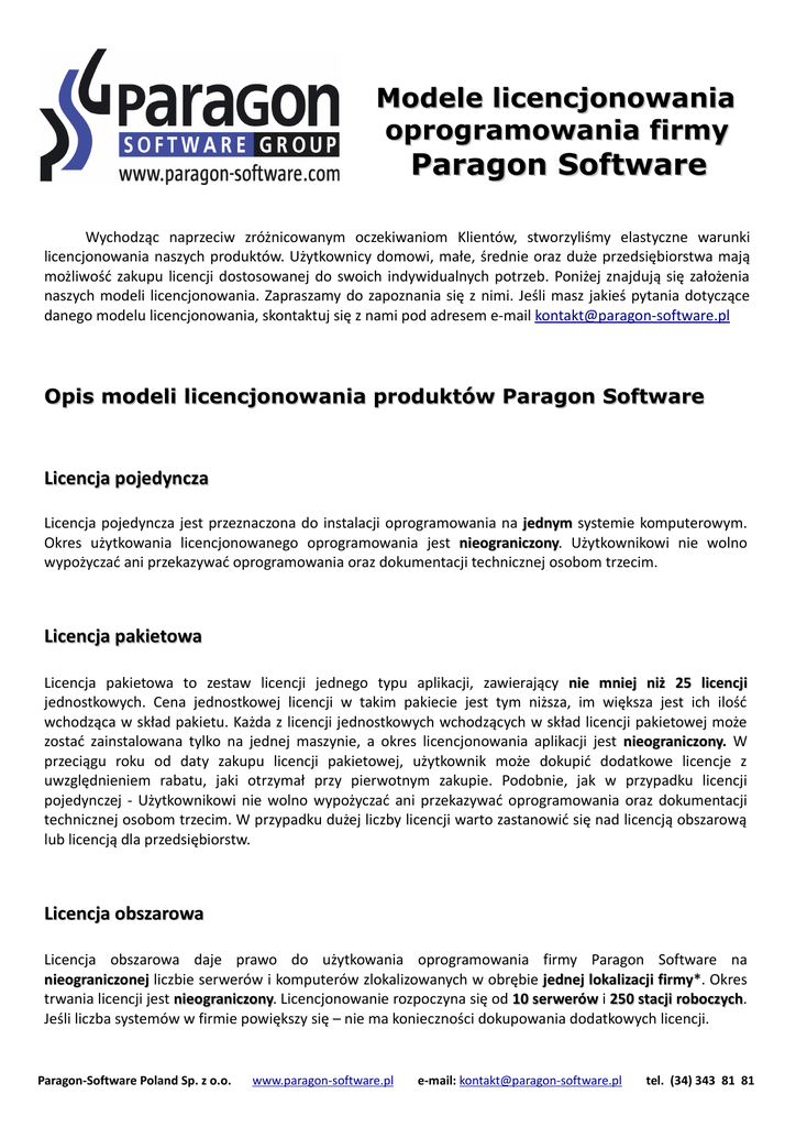 Modele licencjonowania oprogramowania firmy Paragon Software Wychodząc naprzeciw zróżnicowanym oczekiwaniom Klientów, stworzyliśmy elastyczne warunki licencjonowania naszych produktów. Użytkownicy domowi, małe, średnie oraz duże przedsiębiorstwa mają możliwość zakupu licencji dostosowanej do swoich indywidualnych potrzeb. Poniżej znajdują się założenia naszych modeli licencjonowania. Zapraszamy do zapoznania się z nimi. Jeśli masz jakieś pytania dotyczące danego modelu licencjonowania, skontaktuj się z nami pod adresem e-mail [email protected] Opis modeli licencjonowania produktów Paragon Software Licencja pojedyncza Licencja pojedyncza jest przeznaczona do instalacji oprogramowania na jednym systemie komputerowym. Okres użytkowania licencjonowanego oprogramowania jest nieograniczony. nieograniczony Użytkownikowi nie wolno wypożyczać ani przekazywać oprogramowania oraz dokumentacji technicznej osobom trzecim. Licencja pakietowa Licencja pakietowa to zestaw licencji jednego typu aplikacji, zawierający nie mniej niż 25 licencji jednostkowych. Cena jednostkowej licencji w takim pakiecie jest tym niższa, im większa jest ich ilość wchodząca w skład pakietu. Każda z licencji jednostkowych wchodzących w skład licencji pakietowej może zostać zainstalowana tylko na jednej maszynie, a okres licencjonowania aplikacji jest nieograniczony. nieograniczony W przeciągu roku od daty zakupu licencji pakietowej, użytkownik może dokupić dodatkowe licencje z uwzględnieniem rabatu, jaki otrzymał przy pierwotnym zakupie. Podobnie, jak w przypadku licencji pojedynczej - Użytkownikowi nie wolno wypożyczać ani przekazywać oprogramowania oraz dokumentacji technicznej osobom trzecim. W przypadku dużej liczby licencji warto zastanowić się nad licencją obszarową lub licencją dla przedsiębiorstw. Licencja obszarowa Licencja obszarowa daje prawo do użytkowania oprogramowania firmy Paragon Software na nieograniczonej liczbie serwerów i komputerów zlokalizowanych w obrębie jednej lokalizacji firmy*. Okres trwania licencji jest nieograniczony. nieograniczony Licencjonowanie rozpoczyna się od 10 serwerów i 250 stacji roboczych. roboczych Jeśli liczba systemów w firmie powiększy się – nie ma konieczności dokupowania dodatkowych licencji. Paragon-Software Poland Sp. z o.o. www.paragon-software.pl e-mail: [email protected] tel. (34) 343 81 81 Licencja obszarowa zapewnia 1 rok bezpłatnej aktualizacji do nowszej wersji produktu. Cena licencji obszarowej obliczana jest na życzenie Klienta, w zależności od ilości systemów w danej lokalizacji firmy. Użytkownikowi nie wolno wypożyczać ani przekazywać oprogramowania oraz dokumentacji technicznej osobom trzecim. • Jedna lokalizacja firmy = obszar o zasięgu maksymalnie 8 km, na którym znajduje się jeden lub więcej budynków tej samej firmy Licencja dla przedsiębiorstw Licencja dla przedsiębiorstw gwarantuje prawo do używania oprogramowania firmy Paragon Software niezależnie od lokalizacji, lokalizacji w każdej siedzibie danego przedsiębiorstwa. Licencjonowany produkt może być zainstalowany na nieograniczonej liczbie maszyn. Okres trwania licencji jest nieograniczony. nieograniczony Licencjonowanie rozpoczyna się od 20 serwerów i 250 stacji roboczych. roboczych Jeśli liczba systemów w firmie powiększy się - nie trzeba nabywać nowych licencji. Licencja dla przedsiębiorstw zapewnia 1 rok bezpłatnej aktualizacji do nowej wersji produktu. Cena licencji dla przedsiębiorstw obliczana jest na życzenie Klienta, w zależności od ilości systemów w firmie. Użytkownikowi nie wolno wypożyczać ani przekazywać oprogramowania oraz dokumentacji technicznej osobom trzecim. Licencja zaawansowana Licencja zaawansowana to model kierowany do dużych korporacji, oferujący możliwość nieograniczonego czasowo używania oprogramowania firmy Paragon Software na co najmniej 200 serwerach i 1000 stacjach roboczych, roboczych niezależnie od miejsca, miejsca w którym się znajdują. Jeśli liczba systemów w się powiększy - nie trzeba nabywać nowych licencji. Licencja zaawansowana zapewnia 1 rok bezpłatnej aktualizacji do nowej wersji produktu. Cena licencji zaawansowanej obliczana jest na życzenie Klienta, w zależności od ilości systemów na jakich ma być używana. Ponadto licencja zaawansowana zapewnia dodatkowy rabat na zakup innych rozwiązań firmy Paragon Software. Użytkownikowi nie wolno wypożyczać ani przekazywać oprogramowania oraz dokumentacji technicznej osobom trzecim. Licencja Technika Licencja technika upoważnia konkretną osobę do używania określonego oprogramowania firmy Paragon Software na zdefiniowanej liczbie maszyn, w jednej lub więcej lokalizacjach firmy* (warunki używania programu - w zależności od typu licencji technika. Rodzaje Licencji Technika znajdziesz TUTAJ. Licencja Technika występuje w subskrypcji jednorocznej, jednorocznej dwuletniej i trzyletniej. trzyletniej UWAGA! Licencjonowanie oprogramowanie nie może być używane na dwóch systemach komputerowych jednocześnie. jednocześnie Gdy oprogramowanie jest już zainstalowane na stałe na jednym systemie, nie może być używane na innym, bez nabycia dodatkowej, pojedynczej licencji. Licencja technika, w odróżnieniu od innych typów licencji, nie jest przypisana do danego systemu komputerowego, a do konkretnego specjalisty. specjalisty Użytkownikowi nie wolno wypożyczać ani przekazywać oprogramowania oraz dokumentacji technicznej osobom trzecim. • Jedna lokalizacja firmy = obszar o zasięgu maksymalnie 8 km, na którym znajduje się jeden lub więcej budynków tej samej firmy Paragon-Software Poland Sp. z o.o. www.paragon-software.pl e-mail: [email protected] tel. (34) 343 81 81 Licencja edukacyjna Model licencji edukacyjnej został stworzony specjalnie dla sektora edukacyjnego. Gwarantuje dostępność rozwiązań firmy Paragon Software po bardzo przystępnej cenie dla uczniów, nauczyc