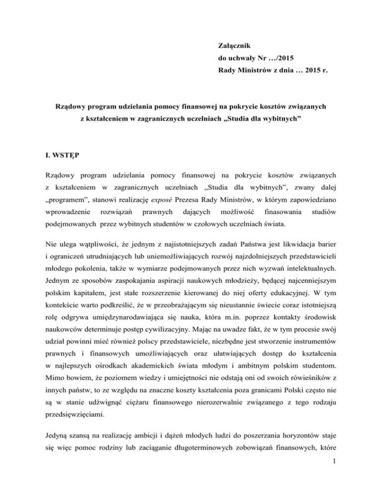 Załącznik do uchwały Nr …/2015 Rady Ministrów z dnia … 2015 r. Rządowy program udzielania pomocy finansowej na pokrycie kosztów związanych z kształceniem w zagranicznych uczelniach „Studia dla wybitnych” I. WSTĘP Rządowy program udzielania pomocy finansowej na pokrycie kosztów związanych z kształceniem w zagranicznych uczelniach „Studia dla wybitnych”, zwany dalej „programem”, stanowi realizację exposé Prezesa Rady Ministrów, w którym zapowiedziano wprowadzenie rozwiązań prawnych dających możliwość finasowania studiów podejmowanych przez wybitnych studentów w czołowych uczelniach świata. Nie ulega wątpliwości, że jednym z najistotniejszych zadań Państwa jest likwidacja barier i ograniczeń utrudniających lub uniemożliwiających rozwój najzdolniejszych przedstawicieli młodego pokolenia, także w wymiarze podejmowanych przez nich wyzwań intelektualnych. Jednym ze sposobów zaspokajania aspiracji naukowych młodzieży, będącej najcenniejszym polskim kapitałem, jest stałe rozszerzenie kierowanej do niej oferty edukacyjnej. W tym kontekście warto podkreślić, że w przeobrażającym się nieustannie świecie coraz istotniejszą rolę odgrywa umiędzynarodawiająca się nauka, która m.in. poprzez kontakty środowisk naukowców determinuje postęp cywilizacyjny. Mając na uwadze fakt, że w tym procesie swój udział powinni mieć również polscy przedstawiciele, niezbędne jest stworzenie instrumentów prawnych i finansowych umożliwiających oraz ułatwiających dostęp do kształcenia w najlepszych ośrodkach akademickich świata młodym i ambitnym polskim studentom. Mimo bowiem, że poziomem wiedzy i umiejętności nie odstają oni od swoich rówieśników z innych państw, to ze względu na znaczne koszty kształcenia poza granicami Polski często nie są w stanie udźwignąć ciężaru finansowego nierozerwalnie związanego z tego rodzaju przedsięwzięciami. Jedyną szansą na realizację ambicji i dążeń młodych ludzi do poszerzania horyzontów staje się więc pomoc rodziny lub zaciąganie długoterminowych zobowiązań finansowych, które 1 jednak obciążająco wpływają na ich dalsze życiowe plany i decyzje. Świadomość tych konsekwencji niejednokrotnie skutecznie powstrzymuje młodych i zdolnych ludzi od podjęcia studiów w najlepszych zagranicznych uczelniach. Dotychczas regulacje prawne nie przewidywały możliwości pokrywania kosztów kształcenia w zagranicznych uczelniach ze środków budżetu państwa. Ustanowienie programu zmieni ten stan rzeczy i umożliwi udzielanie pomocy finansowej wybitnym studentom, zamierzającym podjąć studia magisterskie w renomowanych zagranicznych uczelniach. II. PODSTAWA PRAWNA Podstawę prawną programu stanowi art. 42a ust. 1 ustawy z dnia 27 lipca 2005 r. – Prawo o szkolnictwie wyższym (Dz. U. z 2012 r. poz. 572, z późn. zm.), zwanej dalej „uPSW”. Program będzie ponadto realizowany w oparciu o: 1) art. 42a ust. 2–11 uPSW; 2) art. 21 ust. 1 pkt 40d ustawy z dnia 26 lipca 1991 r. o podatku dochodowym od osób fizycznych (Dz. U. z 2012 r. poz. 361, z późn. zm.); 3) rozporządzenie Rady Ministrów, do wydania którego upoważnia art. 42a ust. 12 uPSW. Program nawiązuje do celów strategicznych określonych w Strategii Rozwoju Kapitału Ludzkiego 2020, przyjętej uchwałą Rady Ministrów z dnia 18 czerwca 2013 r. (Cel szczegółowy 5: Podniesienie poziomu kompetencji oraz kwalifikacji obywateli; działania przewidziane w pkt 6.3. Edukacja na poziomie wyższym – w zakresie zwiększania mobilności studentów). III. CEL PROGRAMU Celem programu jest umożliwienie udzielania ze środków budżetu państwa pomocy finansowej wybitnym studentom zakwalifikowanym na studia magisterskie w renomowanych zagranicznych uczelniach. 2 IV. CZAS TRWANIA PROGRAMU Pomoc finansowa w ramach programu będzie udzielana w latach 2016–2025. V. BENEFICJENCI PROGRAMU Beneficjentami programu mogą być obywatele polscy lub obywatele Unii Europejskiej i członkowie ich rodzin w rozumieniu ustawy z dnia 14 lipca 2006 r. o wjeździe na terytorium Rzeczypospolitej Polskiej, pobycie oraz wyjeździe z tego terytorium obywateli państw członkowskich Unii Europejskiej i członków ich rodzin (Dz. U. z 2014 r. poz. 1525), którym przysługuje prawo pobytu na terytorium Rzeczypospolitej Polskiej przez okres dłuższy niż trzy miesiące w rozumieniu tej ustawy, oraz osoby posiadające status rezydenta długoterminowego na terytorium Rzeczypospolitej Polskiej, będący: 1) absolwentami studiów pierwszego stopnia, którzy ukończyli studia nie wcześniej niż w roku poprzedzającym zgłoszenie do udziału w programie, 2) studentami, którzy nie wcześniej niż w roku poprzedzającym zgłoszenie do udziału w programie ukończyli trzeci rok jednolitych studiów magisterskich – nieposiadający tytułu zawodowego magistra lub równorzędnego i zakwalifikowani na studia magisterskie w jednej z zagranicznych uczelni, których lista jest ustalana w sposób określony w przepisach wydanych na podstawie art. 42a ust. 12 uPSW. Przewiduje się, że w latach 2016–2025 z programu skorzysta około 700 studentów. Liczba ta wynika z przyjętego założenia, że w latach 2016–2022 do programu będzie przystępowało do 100 studentów rocznie. Trzy ostatnie lata realizacji programu, to okres kiedy nie będą przyjmowani nowi uczestnicy. Wypłata pomocy finansowej będzie realizowana wyłącznie wobec uczestników programu kontynuujących studia w zagranicznych uczelniach. Ogłoszenie pierwszego naboru planuje się w roku 2015, celem wyłonienia uczestników programu na rok akademicki 2016/2017. Liczba osób zakwalifikowanych do programu w każdym roku będzie zależała od wysokości kosztów studiów w zagranicznej uczelni podejmowanych przez uczestników programu. Pomoc finansowa będzie przyznawana uczestnikom według ich pozycji na liście rankingowej, do wysokości środków przeznaczonych na realizac