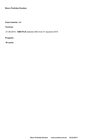 Biuro Podróży Exodus Czas trwania: dni Terminy: 21.06.2015 5999 PLN zaliczka 500 zł do 31 stycznia 2015 Program: W cenie: Biuro Podróży Exodus www.exodus.com.pl 02.03.2017