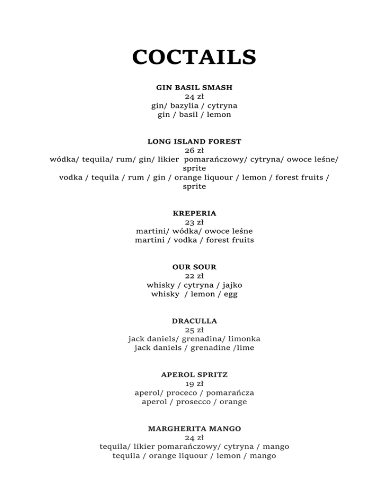 COCTAILS GIN BASIL SMASH 24 zł gin/ bazylia / cytryna gin / basil / lemon LONG ISLAND FOREST 26 zł wódka/ tequila/ rum/ gin/ likier pomarańczowy/ cytryna/ owoce leśne/ sprite vodka / tequila / rum / gin / orange liquour / lemon / forest fruits / sprite KREPERIA 23 zł martini/ wódka/ owoce leśne martini / vodka / forest fruits OUR SOUR 22 zł whisky / cytryna / jajko whisky / lemon / egg DRACULLA 25 zł jack daniels/ grenadina/ limonka jack daniels / grenadine /lime APEROL SPRITZ 19 zł aperol/ proceco / pomarańcza aperol / prosecco / orange MARGHERITA MANGO 24 zł tequila/ likier pomarańczowy/ cytryna / mango tequila / orange liquour / lemon / mango