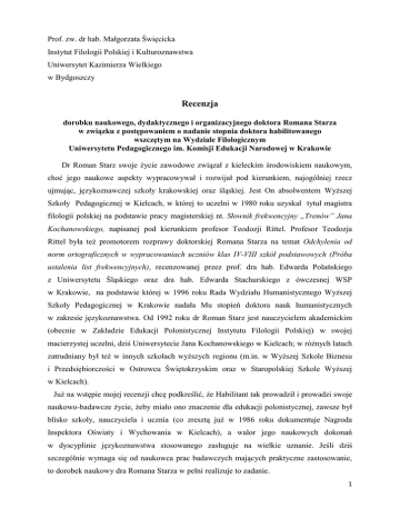 Prof. zw. dr hab. Małgorzata Święcicka Instytut Filologii Polskiej i Kulturoznawstwa Uniwersytet Kazimierza Wielkiego w Bydgoszczy Recenzja dorobku naukowego, dydaktycznego i organizacyjnego doktora Romana Starza w związku z postępowaniem o nadanie stopnia doktora habilitowanego wszczętym na Wydziale Filologicznym Uniwersytetu Pedagogicznego im. Komisji Edukacji Narodowej w Krakowie Dr Roman Starz swoje życie zawodowe związał z kieleckim środowiskiem naukowym, choć jego naukowe aspekty wypracowywał i rozwijał pod kierunkiem, najogólniej rzecz ujmując, językoznawczej szkoły krakowskiej oraz śląskiej. Jest On absolwentem Wyższej Szkoły Pedagogicznej w Kielcach, w której to uczelni w 1980 roku uzyskał tytuł magistra filologii polskiej na podstawie pracy magisterskiej nt. Słownik frekwencyjny „Trenów” Jana Kochanowskiego, napisanej pod kierunkiem profesor Teodozji Rittel. Profesor Teodozja Rittel była też promotorem rozprawy doktorskiej Romana Starza na temat Odchylenia od norm ortograficznych w wypracowaniach uczniów klas IV-VIII szkół podstawowych (Próba ustalenia list frekwencyjnych), recenzowanej przez prof. dra hab. Edwarda Polańskiego z Uniwersytetu Śląskiego oraz dra hab. Edwarda Stachurskiego z ówczesnej WSP w Krakowie, na podstawie której w 1996 roku Rada Wydziału Humanistycznego Wyższej Szkoły Pedagogicznej w Krakowie nadała Mu stopień doktora nauk humanistycznych w zakresie językoznawstwa. Od 1992 roku dr Roman Starz jest nauczycielem akademickim (obecnie w Zakładzie Edukacji Polonistycznej Instytutu Filologii Polskiej) w swojej macierzystej uczelni, dziś Uniwersytecie Jana Kochanowskiego w Kielcach; w różnych latach zatrudniany był też w innych szkołach wyższych regionu (m.in. w Wyższej Szkole Biznesu i Przedsiębiorczości w Ostrowcu Świętokrzyskim oraz w Staropolskiej Szkole Wyższej w Kielcach). Już na wstępie mojej recenzji chcę podkreślić, że Habilitant tak prowadził i prowadzi swoje naukowo-badawcze życie, żeby miało ono znaczenie dla edukacji polonistycznej, zawsze był blisko szkoły, nauczyciela i ucznia (co zresztą już w 1986 roku dokumentuje Nagroda Inspektora Oświaty i Wychowania w Kielcach), a walor jego naukowych dokonań w dyscyplinie językoznawstwa stosowanego zasługuje na wielkie uznanie. Jeśli dziś szczególnie wymaga się od naukowca prac badawczych mających praktyczne zastosowanie, to dorobek naukowy dra Romana Starza w pełni realizuje to zadanie. 1 Osiągnięcia naukowe Dorobek naukowy dra Romana Starza sytuuje się w nurcie badawczym lingwistyki edukacyjnej, na co niewątpliwy wpływ miała Jego Mistrzyni – Profesor Teodozja Rittel – autorka założeń teoretyczno-metodologicznych wymienionego działu lingwistyki stosowanej. Habilitant należy do tego pokolenia językoznawców, dla którego relacja mistrz – uczeń jest niezwykle ważna. Twórczo inspirując do naukowego rozwoju, pozwala ona bowiem wyrosnąć, a tak zdecydowanie dzieje się w przypadku dra Romana Starza, na badacza samodzielnego, dojrzałego i uznanego. Te walory swojego warsztatu naukowego buduje Habilitant przez lata, w sposób zarówno wartościowy jakościowo (zwłaszcza w zakresie podstaw teoretyczno-metodologicznych prac, celów badawczych, materiału językowego), jak i reprezentatywny statystycznie. Choć charakterystyka ilościowa nie jest tak istotna, warto – dla zilustrowania systematycznego powiększania dorobku publikacyjnego – przywołać dane liczbowe: przed doktoratem dr Roman Starz opublikował 1 książkę współautorską oraz 4 artykuły, natomiast Jego dorobek po doktoracie obejmuje: 2 monografie autorskie oraz 33 artykuły, w tym 25 autorskich, 8 zaś współautorskich (w języku angielskim, z różnym udziałem procentowym – od 10% do 80% – Habilitanta), w sumie więc 38 prac opublikowanych; opublikowanych dodajmy od razu w czasopismach krajowych (1 z listy ERIH), zagranicznych, w liczących się krajowych lub międzynarodowych pracach zbiorowych, seriach wydawniczych, studiach (por. np. warszawskie Studia Pragmalingwistyczne, krakowskie Studia Logopedyczne, Prace Naukowe Uniwersytetu Śląskiego czy Sprawności językowe, Wartościowanie w dyskursie edukacyjnym, Societal Factors Shaping Wellness in Disability). Tak więc dr Roman Starz jest autorem publikowanym nie tylko w macierzystym kieleckim wydawnictwie, ale też, a to istotne, w licznych innych wydawnictwach w takich chociażby ośrodkach naukowych, jak: Warszawa, Kraków, Lublin, Katowice, Rzeszów, Łódź, Bydgoszcz. Habilitant – przedstawiciel lingwistyki edukacyjnej dał się przede wszystkim poznać jako niestrudzony badacz sprawności ortograficznej uczniów. Ważny naukowo i dydaktycznie wątek badawczy – ortografia pojawia się w pierwszych publikacjach dra Romana Starza w 1986 roku i jest kontynuowany systematycznie do roku 2003. Habilitant wiele szczegółowych problemów badawczych (m.in. rola list frekwencyjnych w nauczaniu ortografii, zróżnicowanie uczniowskich błędów ortograficznych, rola szkoły w zapobieganiu błędom ortograficznym) rozstrzyga zarówno w cyklu kilkunastu artykułów (szczególnie interesujące w mojej ocenie to: Odchylenia od norm ortograficznych a wyrazy synchronicznie 2 obce w wypracowaniach uczniów klas IV-VIII czy Odchylenia od norm ortograficznych w różnych częściach mowy), jak i w monografii autorskiej pt. Odchylenia od norm ortograficznych w wypracowaniach uczniów w wieku 10-14 lat, AŚ Kielce 2000, ss. 345. Publikacje dra Romana Starza sytuujące się w nurcie badania uczniowskiej kompetencji ortograficznej oceniam bardzo wysoko. Oparte na solidnej podstawie materiałowej (2 500 wypracowań), rejestrujące ponad 10 000 odchyleń od normy ortograficznej, pozwalają ich autorowi formułować ważkie poznawczo i naukowo wnioski (m.in. na temat relacji ortografia a system języka, nauki pisania jako nauki języka obcego, przyczyn odchyleń od normy ortograficznej, indywi