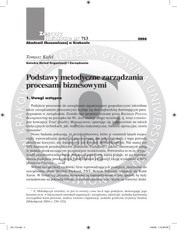 Zeszyty Naukowe nr 713 Akademii Ekonomicznej w Krakowie 2006 Tomasz Kafel Katedra Metod Organizacji i Zarządzania Podstawy metodyczne zarządzania procesami biznesowymi 1. Uwagi wstępne Podejście procesowe do zarządzania organizacjami gospodarczymi (określane także zarządzaniem procesowym) wydaje się dziś najbardziej dominującym paradygmatem w zarządzaniu. Zostało ono spopularyzowane przez Business Process Reengineering na początku lat 90., lecz istnieje długo wcześniej, tj. wraz z rozwojem koncepcji Total Quality Management, opierając się jednocześnie na takich tradycyjnych technikach, jak: statystyka matematyczna, badania operacyjne, teoria systemów. Nowe badania pokazują, że przedsiębiorstwa, które w ostatnich latach rozpoczęły wprowadzanie podejścia procesowego, nie tylko uzyskały z tego powodu określone korzyści, ale dostarczyły ich również swoim klientom. Nie mniej niż 95% badanych przedsiębiorstw podniosło wydajność i jakość oferowanych usług w stopniu przekraczającym wcześniejsze oczekiwania. Potwierdza to m.in. wypowiedź przedstawicielki firmy Allianz, Karen Forte, która podaje, że po wprowadzeniu podejścia procesowego Dział Zażaleń zwiększył swoją wydajność o 80% [Business Process…, s. 7]. Wśród europejskiej czołówki firm wprowadzających podejście procesowe do zarządzania, obok Hewlett Packard, TNT, British Telecom, znajduje się Rank Xerox. W firmie tej „procesy biznesowe są zaprojektowane w taki sposób, by były zorientowane na potrzeby klienta, transfunkcjonalne oraz oparte na wartości doda Z. Mikołajczyk twierdzi, że jest to swoisty come back tego podejścia, dostrzegając jego korzenie m.in. w klasycznych metodach organizacji i zarządzania, takich jak: technika kartowania (szczególnie karta procesu), analiza wartości organizacji, techniki graficzne (wykresy Gantta) [Mikołajczyk 2004, s. 230–232]. ZN_713.indb 5 1/30/08 1:10:39 PM Tomasz Kafel nej. Tworzą one wiedzę, eliminują zbędne działania i zapobiegają nieproduktywnej pracy, czego efektem jest światowej klasy produktywność oraz wyższy postrzegany poziom usług” [Pritchard, Armistead 1999, cyt. za: Kopera 2000, s. 155]. Główne czynniki, które przyczyniły się do rozwoju procesowego podejścia do zarządzania, to przede wszystkim: – rosnąca turbulencja otoczenia i wnętrza firmy, – wzrost złożoności procesów wewnętrznych i zewnętrznych, – deregulacja systemu konkurencji rynkowej, – indywidualizacja potrzeb i oczekiwań klienta, – wzrost znaczenia zasobów niematerialnych, – możliwości komunikowania stwarzane przez nowe technologie, – wymogi nowego marketingu (w tym szczególnie bezpośredni kontakt z klientem), – krótszy cykl życia produktów [Perechuda 1997, s. 34–35]. Głównym celem zarządzania procesowego jest „poprawa efektywności działań w przedsiębiorstwie poprzez strukturalizację czynności pod kątem kreowania wartości dodanej ze szczególnym zwróceniem uwagi na preferencje i potrzeby klienta oraz właściwe opisanie i skonfigurowanie procesów w przedsiębiorstwie zgodnie z kryteriami czasu i przestrzeni” [Kopera 2000, s. 137, cyt. za: Ljungberg, Zeng 2003]. Realizacja tego celu wymaga: – poznania, a następnie integracji czynności, decyzji i przepływu informacji w dynamiczne procesy, – usytuowania przebiegu każdego procesu w strukturze organizacyjnej, – wyznaczenia osób odpowiedzialnych za kolejne etapy. Opracowanie zorientowanej na procesy struktury organizacyjnej jest tylko jednym z elementów zarządzania procesowego. Wydaje się, że kluczowym jego celem jest klasyfikowanie i weryfikowanie procesów pod względem następujących kryteriów: – redukcji czasu przebiegu procesów, – podwyższenia jakości procesów, – ograniczenia liczby dróg, po których przebiegają procesy decyzyjne i wykonawcze, – zmniejszenia liczby osób zaangażowanych w obsługę procesów, – racjonalizacji procesów, – redukcji zaangażowanych w procesy zasobów finansowych i rzeczowych [Pokusa 2004, s. 141]. ZN_713.indb 6 1/30/08 1:10:39 PM Podstawy metodyczne zarządzania procesami biznesowymi 2. Istota procesowego podejścia do zarządzania organizacjami gospodarczymi Zarządzanie procesowe – zdaniem M. Trockiego – charakteryzuje się „eksponowaniem aspektu dynamicznego zarządzania, koncentracją uwagi na zjawiskach dynamicznych, a dopiero w drugiej kolejności na zjawiskach statycznych zarządzania, kładąc jednocześnie nacisk na zaspokojenie potrzeb klientów. Nie zastępuje, lecz uzupełnia zarządzanie strukturalne” [Leksykon…, 2004, s. 670]. Z kolei S. Borkowski oraz K. Siekański definiują zarządzanie procesowe jako „zestaw działań polegających na sterowaniu procesami i powiązaniami między nimi dla uzyskania wymaganych właściwości materiałów i wyrobów oraz zaspokojenia wymagań kolejnych klientów w łańcuchu procesów, a także na zbieraniu informacji dla potrzeb zarządzania” [Borkowski, Siekański 2004, s. 27]. W zarządzaniu procesowym ważne jest zatem nie wykonywanie powierzonych zadań, lecz szukanie powiązań między kolejnymi czynnościami tego samego rodzaju (np.: przepływy materiałowe, planowanie, działania dystrybucyjne) w taki sposób, by wypełnić wymagania klienta nadrzędnego (zewnętrznego) i wewnętrznego dla danego procesu czy ciągu procesów. Odbywa się to przez łączenie działań poszczególnych – poprzednio odrębnych – części przedsiębiorstwa w logiczne przepływy i transformacje. Oznacza to nadanie znacznych zakresów odpowiedzialności oraz dużych uprawnień decyzyjnych stanowiskom organizacyjnym. Zatem kluczowa w podejściu procesowym jest zmiana optyki postrzegania organizacji – z klasycznej, opartej na logice specjalizacji i grupowaniu podobnych funkcji celem tworzenia większych jednostek, na nową, zorientowaną na przebiegi organizacyjne gromadzące zasoby z różnych dziedzin wokół budowani