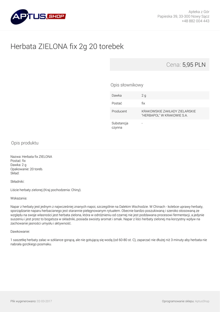 Apteka z Gór Papieska 39, 33-300 Nowy Sącz +48 882 004 443 Herbata ZIELONA fix 2g 20 torebek Cena: 5,95 PLN Opis słownikowy Dawka 2g Postać fix Producent KRAKOWSKIE ZAKŁADY ZIELARSKIE "HERBAPOL" W KRAKOWIE S.A. Substancja czynna - Opis produktu Nazwa: Herbata fix ZIELONA Postać: fix Dawka: 2 g Opakowanie: 20 toreb. Skład: Składniki: Liście herbaty zielonej (Kraj pochodzenia: Chiny). Wskazania: Napar z herbaty jest jednym z najwcześniej znanych napoi, szczególnie na Dalekim Wschodzie. W Chinach - kolebce uprawy herbaty, sporządzanie naparu herbacianego jest starannie pielęgnowanym rytuałem. Obecnie bardzo poszukiwaną i szeroko stosowaną ze względu na swoje własności jest herbata zielona, która w odróżnieniu od czarnej nie jest poddawana procesowi fermentacji, a jedynie suszeniu i jest przez to bogatsza w składniki, posiada swoisty aromat i smak. Napar z liści herbaty zielonej ma korzystny wpływ na zachowanie jasności umysłu i aktywność. Dawkowanie: 1 saszetkę herbaty zalac w szklance gorącą, ale nie gotującą się wodą (od 60-80 st. C), zaparzać nie dłużej niż 3 minuty aby herbata nie nabrała gorzkiego posmaku. Plik wygenerowano: 02-03-2017 Powered by TCPDF (www.tcpdf.org) Oprogramowanie sklepu: AptusShop