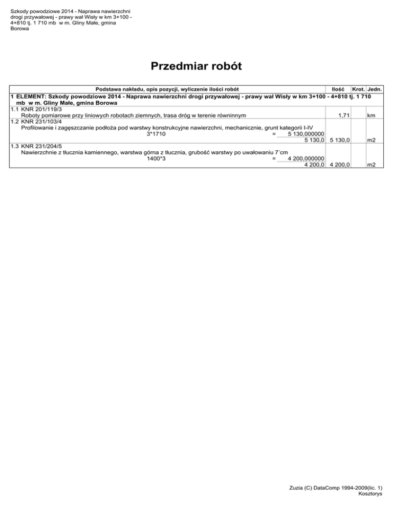 Szkody powodziowe 2014 - Naprawa nawierzchni drogi przywałowej - prawy wał Wisły w km 3+100 4+810 tj. 1 710 mb w m. Gliny Małe, gmina Borowa Przedmiar robót Podstawa nakładu, opis pozycji, wyliczenie ilości robót Ilość Krot. Jedn. 1 ELEMENT: Szkody powodziowe 2014 - Naprawa nawierzchni drogi przywałowej - prawy wał Wisły w km 3+100 - 4+810 tj. 1 710 mb w m. Gliny Małe, gmina Borowa 1.1 KNR 201/119/3 Roboty pomiarowe przy liniowych robotach ziemnych, trasa dróg w terenie równinnym 1,71 km 1.2 KNR 231/103/4 Profilowanie i zagęszczanie podłoża pod warstwy konstrukcyjne nawierzchni, mechanicznie, grunt kategorii I-IV 3*1710 = 5 130,000000 5 130,0 5 130,0 m2 1.3 KNR 231/204/5 Nawierzchnie z tłucznia kamiennego, warstwa górna z tłucznia, grubość warstwy po uwałowaniu 7˙cm 1400*3 = 4 200,000000 4 200,0 4 200,0 m2 Zuzia (C) DataComp 1994-2009(lic. 1) Kosztorys