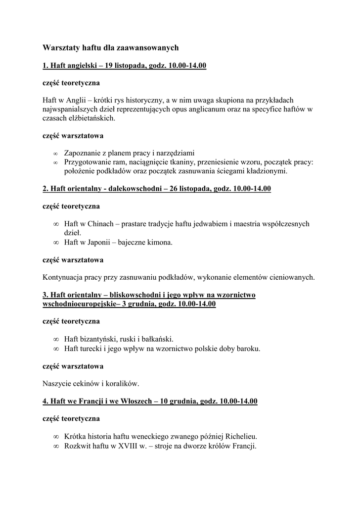 Warsztaty haftu dla zaawansowanych 1. Haft angielski – 19 listopada, godz. 10.00-14.00 część teoretyczna Haft w Anglii – krótki rys historyczny, a w nim uwaga skupiona na przykładach najwspanialszych dzieł reprezentujących opus anglicanum oraz na specyfice haftów w czasach elżbietańskich. część warsztatowa • • Zapoznanie z planem pracy i narzędziami Przygotowanie ram, naciągnięcie tkaniny, przeniesienie wzoru, początek pracy: położenie podkładów oraz początek zasnuwania ściegami kładzionymi. 2. Haft orientalny - dalekowschodni – 26 listopada, godz. 10.00-14.00 część teoretyczna • Haft w Chinach – prastare tradycje haftu jedwabiem i maestria współczesnych dzieł. • Haft w Japonii – bajeczne kimona. część warsztatowa Kontynuacja pracy przy zasnuwaniu podkładów, wykonanie elementów cieniowanych. 3. Haft orientalny – bliskowschodni i jego wpływ na wzornictwo wschodnioeuropejskie– 3 grudnia, godz. 10.00-14.00 część teoretyczna • Haft bizantyński, ruski i bałkański. • Haft turecki i jego wpływ na wzornictwo polskie doby baroku. część warsztatowa Naszycie cekinów i koralików. 4. Haft we Francji i we Włoszech – 10 grudnia, godz. 10.00-14.00 część teoretyczna • Krótka historia haftu weneckiego zwanego później Richelieu. • Rozkwit haftu w XVIII w. – stroje na dworze królów Francji. część warsztatowa Ścieg satynowy wykonywany nićmi satynowymi oraz ściek kładziony jedwabny. Wykończenie pracy. Warsztaty odbywają się w pałacu w Sypialni Pani. Koszt udziału w całym cyklu: 150 zł. Rezerwacja: tel. 22 842 07 95 lub e-mail: [email protected]