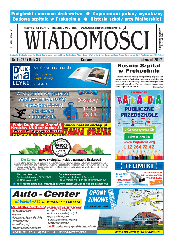 tradycja od 1995 r. nakład 9 000 egz. + www.wiadomoscipodgorze.pl Egzemplarz bezpłatny Przekaż dalej! PL ISSN 1507-6105 Podgórskie muzeum drukarstwa Zapomniani polscy wynalazcy Budowa szpitala w Prokocimiu Historia szkoły przy Malborskiej WIADOMOŚCI Bieżanów, Bieżanów Nowy, Kozłówek, Kurdwanów, Łagiewniki, os. Cegielniana, Piaski Nowe i Wielkie, Prokocim, Prokocim Nowy, Rżąka, Swoszowice, Wola Duchacka Wschód i Zachód Nr 1 (252) Rok XXII Kraków styczeń 2017 Rośnie Szpital w Prokocimiu Sztuka dobrego druku uku ULOTKIPLAKATY KSIKIKATALOGI Prace na terenie budowy nowej siedziby Szpitala Uniwersyteckiego w Prokocimiu postępują zgodnie z planem. W 2016 r. wyłoniły się z ziemi konstrukcje niemal wszystkich budynków. Wartość wykonanych prac wyceniono na ponad 150 mln zł. Cd. na str. 3 XXXMFZLPQM TŁUMIKI 12 657 23 75 513 096 771 HAKI HOLOWNICZE MECHANIKA OGÓLNA WULKANIZACJA ZMIANA ADRESU! PIOMAR, Wola Duchacka, ul.Dauna 95A (wjazd od Nowosądeckiej) ul. Wielicka 250 OPONY ZIMOWE tel. 12 288 04 10 i 12 288 05 00 SERWIS WSZYSTKICH MAREK • serwis pogwarancyjny • naprawa • komputerowa diagnostyka silnika • serwis ogumienia • serwis klimatyzacji • naprawy blacharsko-lakiernicze PRZEGLĄDY REJESTRACYJNE H DLA STAŁYC RABATY KLIENTÓW WYMIANA I SPRZEDAŻ pn . – pt . 7 – 21, sob. 8 – 14 • motocykle – samochody do 3,5 T • pojazdy zasilane gazem • pojazdy sprowadzone z zagranicy • badania powypadkowe SKLEP: części zamienne, oryginały i tańsze zamienniki Czynne: pn. – pt.: 8 – 18, sob.: 8 – 14 www.autocenter.com.pl BIURA DO WYNAJĘCIA: 600 880 870 2 WIADOMOŚCI Lokalne Forum email: [email protected] Lokalne Forum email: [email protected] POWTÓRKA Z HISTORII Uwagi po przeczytaniu Historia szkoły na Woli Duchackiej przy ulicy Malborskiej 98 sięga ubiegłego wieku. 24 lipca 1901 roku zostało wydane pozwolenie na utworzenie szkoły o nazwie Szkoła Ludowa Pospolita. Lekcje odbywały się w domu pani Katarzyny Talarkowej, który znajdował się przy obecnej ulicy Trybuny Ludów, naukę wtedy pobierało 36 uczniów. Po przeczytaniu „Wiadomości” zwróciłem uwagę w „Sygnałach” na temat właścicieli lokali usługowych przy Nowosądeckiej. Mianowicie byłem świadkiem wykorzystania nowego chodnika do dojazdu samochodów osobowych i parkowaniu pod lokalem, chociaż mają parking z drugiej strony budynku. Drugi temat to kratki burzowe. Od trzech lat interweniuję w Zikicie na niedrożne kratki na pętli autobusowej 164, między sklepem Słoneczko a kioskiem z gazetami. Kierownicy się zmieniają, a sprawa pozostaje, jawne granie na nosie? [imię i nazwisko do wiadomości redakcji] Od redakcji: Pierwszy budynek szkoły 1901 rok Nr 1 styczeń 2017 Lokalne Forum email: [email protected] PARKI KRAKOWIAN Po kilku latach szkołę musiano przenieść do drewnianego domu należącego do państwa Lisowskich na ulicy Radłowej. Była to już dwuklasowa Publiczna Szkoła Powszechna, która w tym budynku działała do 1927 roku. Latem tegoż roku gmina oddała do użytku Dom Ludowy przy ulicy Malborskiej, gdzie tymczasowo przeniesiono szkołę, którą kierował Franciszek Sikora. W 1931 roku nowym kierownikiem został nauczyciel Henryk Bolniak, który wraz z władzami gminy i mieszkańcami Woli Duchackiej podjęli starania o wykup gruntów pod budowę szkoły. Budowę szkoły przy ulicy Malborskiej 98 zakończono w sierpniu 1939 roku. Niestety w wyniku wybuchu drugiej wojny światowej dzieci wolskie nie mogły rozpocząć nauki w nowej szkole. Władze niemieckie utworzyły tu uczelnię dla dzieci volksdeutschów oraz koszary wojskowe. Natomiast polscy uczniowie pobierali nauki w konspiracji. Dom Ludowy w budowie Dopiero po wyzwoleniu w styczniu 1945 roku dzieci z Woli Duchackiej mogły rozpocząć naukę w swojej nowej szkole. W latach 60. społeczność Woli Duchackiej znacznie się zwiększyła, a co za tym idzie przybyło dzieci w wieku szkolnym. Dlatego należało rozbudować budynek szkolny. Do stojącego gmachu szkoły dobudowano dwa skrzydła, które do użytku oddano w roku 1968, a w następnych latach powstało boisko wraz z zapleczem sportowym. O kontrowersjach związanych z najeżdżaniem na chodnik przy ul. Nowosądeckiej przez samochody dostawcze i osobowe pisaliśmy w Sygnałach w listopadowym nr. „W”. Mieszkanka zgłaszała ten problem na policję i Straż Miejską. Część właścicieli lokali usługowych deklarowała, że wykonają podjazdy we własnym zakresie po porozumieniu z ZIKiT. Niestety efektu nie widać, z kolei parking po drugiej stronie budynku, od strony ul. Białoruskiej (na zdjęciu), też pozostawia wiele do życzenia Pozbawianie możliwości wyboru Niedawno poprzez aplikację, z której korzystam przy zakupie biletów MPK otrzymałem informację, że od 1.01.2017 nastąpią zmiany w sprzedaży biletów poprzez platformy komórkowe. Potwierdzenie znalazłem na stronach ZIKIT. W przetargu ma być wyłoniony jeden operator, z którego użytkownicy MPK będą mogli korzystać kupując bilety przez komórkę. Do tej pory użytkownik wybierał usługodawcę. Aplikacja jednego z nich jest bardzo intuicyjna, łatwa w obsłudze. Inny oferuje szybkie, wygodne przelewy, w kolejnej aplikacji mogę również zapłacić za postój w strefie płatnego parkowania. Mogę więc wybrać aplikację, w zależności od potrzeb (lub od tego, że dana aplikacja po prostu bardziej mi się podoba). Jeśli klient wybiera usługodawcę, każdy z operatorów w ramach zdrowej konkurencji stara się udoskonalać swój produkt i my, klienci zyskujemy na tym. Zyskuje też ZIKIT i MPK notując wyższe dochody ze sprzedaży biletów. Przetarg wyłoni jedną firmę na np. 4 lata wyłączając inne podmioty z rynku. Czy pozbawianie klientów wyboru i eliminowanie innych podmiotów z rynku to dobry i konieczny pomysł? Czy w innych miastach też jest jeden operator sprzedaży biletów „elektronicznych”? P.K. Podkopywanie starego dębu Wysy
