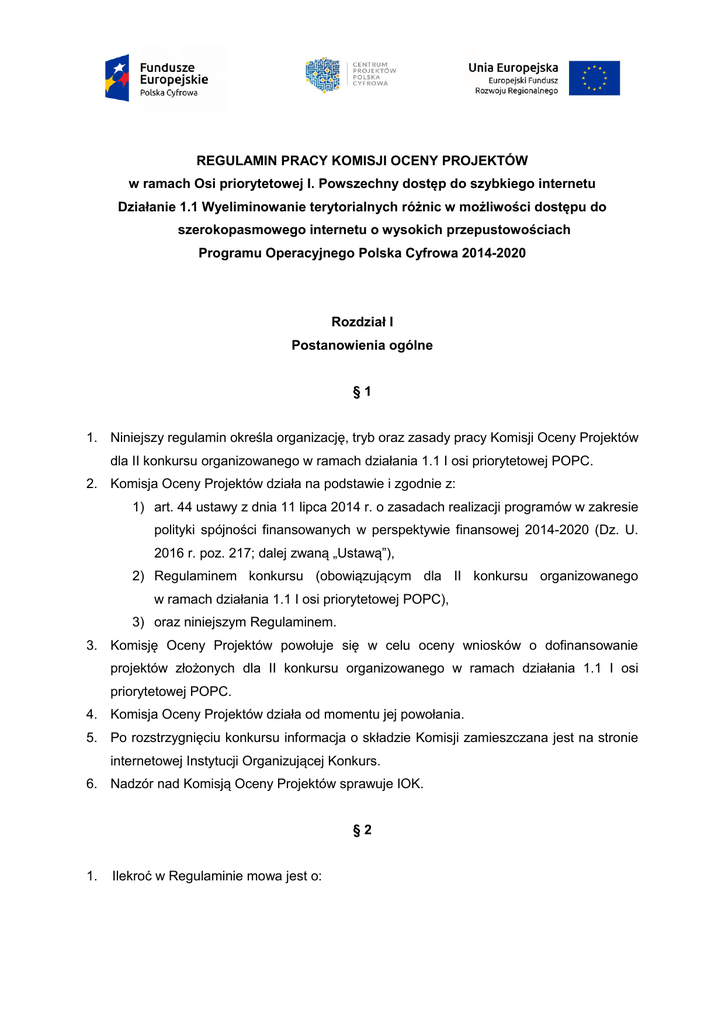 REGULAMIN PRACY KOMISJI OCENY PROJEKTÓW w ramach Osi priorytetowej I. Powszechny dostęp do szybkiego internetu Działanie 1.1 Wyeliminowanie terytorialnych różnic w możliwości dostępu do szerokopasmowego internetu o wysokich przepustowościach Programu Operacyjnego Polska Cyfrowa 2014-2020 Rozdział I Postanowienia ogólne §1 1. Niniejszy regulamin określa organizację, tryb oraz zasady pracy Komisji Oceny Projektów dla II konkursu organizowanego w ramach działania 1.1 I osi priorytetowej POPC. 2. Komisja Oceny Projektów działa na podstawie i zgodnie z: 1) art. 44 ustawy z dnia 11 lipca 2014 r. o zasadach realizacji programów w zakresie polityki spójności finansowanych w perspektywie finansowej 2014-2020 (Dz. U. 2016 r. poz. 217; dalej zwaną „Ustawą”), 2) Regulaminem konkursu (obowiązującym dla II konkursu organizowanego w ramach działania 1.1 I osi priorytetowej POPC), 3) oraz niniejszym Regulaminem. 3. Komisję Oceny Projektów powołuje się w celu oceny wniosków o dofinansowanie projektów złożonych dla II konkursu organizowanego w ramach działania 1.1 I osi priorytetowej POPC. 4. Komisja Oceny Projektów działa od momentu jej powołania. 5. Po rozstrzygnięciu konkursu informacja o składzie Komisji zamieszczana jest na stronie internetowej Instytucji Organizującej Konkurs. 6. Nadzór nad Komisją Oceny Projektów sprawuje IOK. §2 1. Ilekroć w Regulaminie mowa jest o: a) POPC - rozumie się przez to Program Operacyjny Polska Cyfrowa na lata 20142020, zatwierdzony decyzją wykonawczą Komisji Europejskiej z dnia 5 grudnia 2014 r., b) Ustawie - rozumie się przez to ustawę z dnia 11 lipca 2014 r. o zasadach realizacji programów w zakresie polityki spójności finansowanych w perspektywie finansowej 2014-2020 (Dz. U. z 2016 r. poz. 217, t.j. ze zm.), c) CPPC – rozumie się przez to Centrum Projektów Polska Cyfrowa, d) KOP – rozumie się przez to Komisję Oceny Projektów dokonującą formalnej i merytorycznej oceny wniosków, e) IOK – rozumie się przez to Instytucję Organizującą Konkurs, tj. CPPC, f) IZ POPC – rozumie się przez to Instytucję Zarządzającą POPC tj. Ministerstwo Rozwoju, g) IP POPC – rozumie się przez to Instytucję Pośredniczącą w zarządzaniu POPC tj. CPPC, h) Ministrze – rozumie się przez to Ministra Cyfryzacji, i) Ekspertach – rozumie się przez to ekspertów, o których mowa w art. 44 Ustawy, j) Wnioskodawcy – rozumie się przez to podmiot uprawniony do aplikowania w ramach konkursu, k) Wniosku o dofinansowanie wraz z załącznikami – rozumie się przez to wniosek o dofinansowanie złożony w ramach niniejszego konkursu, l) SL2014 – rozumie się przez to aplikację główną Centralnego Systemu Teleinformatycznego, zapewniającą komunikację między Beneficjentem a instytucją udzielającą wsparcia oraz mającą na celu między innymi wsparcie bieżącego procesu zarządzania, monitorowania i oceny programów współfinansowanych z funduszy strukturalnych, m) Portalu – rozumie się przez to portal internetowy, o którym mowa w art. 115 ust. 1 lit. b rozporządzenia Parlamentu Europejskiego i Rady nr 1303/2013 z dnia 17 grudnia 2013 r. ustanawiającego wspólne przepisy dotyczące Europejskiego Funduszu Rozwoju Regionalnego, Europejskiego Funduszu Społecznego, Funduszu Spójności, Europejskiego Funduszu Rolnego na rzecz Rozwoju Obszarów Wiejskich oraz Europejskiego Funduszu Morskiego i Rybackiego oraz ustanawiającego przepisy ogólne dotyczące Europejskiego Funduszu Rozwoju Regionalnego, Europejskiego Funduszu Społecznego, Funduszu Spójności i Europejskiego Funduszu Morskiego i Rybackiego oraz uchylającego rozporządzenie Rady (WE) nr 1083/2006 (Dz. Urz. UE L 347 z 20 grudnia 2013 r.), 2 Rozdział II Zasady i tryb działania Komisji Oceny Projektów §3 Skład Komisji Oceny Projektów 1. Członków KOP powołuje i odwołuje Dyrektor Centrum Projektów Polska Cyfrowa. 2. W skład KOP wchodzą: 1) Przewodniczący i jego zastępcy (jeśli występują); 2) Sekretarz i jego zastępcy (jeśli występują); 3) Członkowie oceniający: a) pracownicy IOK; b) eksperci, o których mowa w art. 49 Ustawy. 3. Liczba Członków oceniających powinna być adekwatna do liczby wniosków podlegających ocenie tak, aby czas trwania oceny był jak najkrótszy. 4. Przewodniczącego i jego zastępców, Sekretarza i jego zastępców oraz Członków oceniających wyznacza się spośród pracowników IOK i kandydatów na ekspertów, spełniających kryteria, o których mowa w art. 49 Ustawy. 5. Członków oceniających w ramach KOP powołuje się spośród ekspertów w rozumieniu art. 49 Ustawy, wybranych przez IOK w drodze naboru według jawnych kryteriów, jak również spośród Ekspertów wskazanych przez Ministra. 6. W pracach KOP mogą uczestniczyć przedstawiciele IZ POPC jako nieoceniający obserwatorzy. 7. Zasady wynagradzania członków oceniających KOP określone są w umowach zawartych z Ekspertami lub odrębnych porozumieniach. 8. Pracownicy IOK uczestniczą w pracach KOP w ramach obowiązków służbowych bez prawa do dodatkowego wynagrodzenia. §4 Zwoływanie posiedzeń 1. Posiedzenia KOP zwoływane są przez Przewodniczącego lub jego zastępcę. 2. Posiedzenia KOP mogą odbywać się na każdym etapie trwania oceny: 1) za pośrednictwem elektronicznej platformy usług administracji publicznej ePUAP, 2) z wykorzystaniem dostępnych środków komunikacji elektronicznej lub, 3 3) stacjonarnie w siedzibie IOK lub w innym miejscu wskazanym przez Przewodniczącego. §5 Zadania Komisji Oceny Projektów 1. Do zadań KOP należy: 1) ocena braków formalnych oraz oczywistych omyłek wniosków składanych w ramach I osi POPC; 2) ocena formalna wniosków składanych w ramach I osi POPC zgodnie z kryteriami wyboru projektów zatwierdzonymi przez Komitet Monitorujący dla POPC; 3) ocena merytoryczna wniosków składanych w ramach I osi POPC zgodnie z kryteriami wyboru projektów zatwierdzonymi przez Komitet 