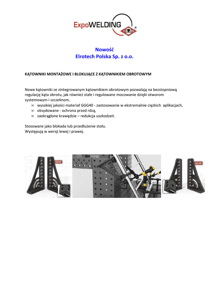 Nowość Elrotech Polska Sp. z o.o. KĄTOWNIKI MONTAŻOWE I BLOKUJĄCE Z KĄTOWNIKIEM OBROTOWYM Nowe kątowniki ze zintegrowanym kątownikiem obrotowym pozwalają na bezstopniową regulację kąta obrotu, jak również stałe i regulowane mocowanie dzięki otworom systemowym i szczelinom. • wysokiej jakości materiał GGG40 - zastosowanie w ekstremalnie ciężkich aplikacjach, • oksydowane - ochrona przed rdzą, • zaokrąglone krawędzie – redukcja uszkodzeń. Stosowane jako blokada lub przedłużenie stołu. Występują w wersji lewej i prawej.
