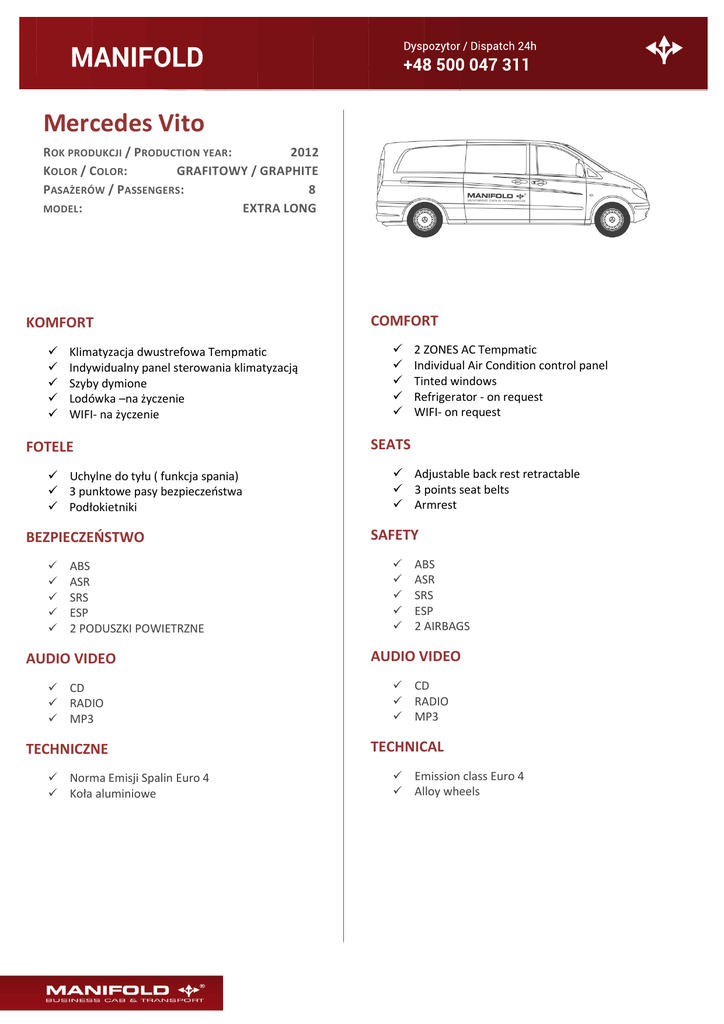 Mercedes Vito ROK PRODUKCJI / PRODUCTION YEAR: 2012 KOLOR / COLOR: GRAFITOWY / GRAPHITE PASAŻERÓW / PASSENGERS: 8 MODEL : EXTRA LONG KOMFORT Klimatyzacja dwustrefowa Tempmatic Indywidualny panel sterowania klimatyzacją Szyby dymione Lodówka –na życzenie WIFI- na życzenie FOTELE Uchylne do tyłu ( funkcja spania) 3 punktowe pasy bezpieczeństwa Podłokietniki BEZPIECZEŃSTWO ABS ASR SRS ESP 2 PODUSZKI POWIETRZNE AUDIO VIDEO CD RADIO MP3 TECHNICZNE Norma Emisji Spalin Euro 4 Koła aluminiowe COMFORT 2 ZONES AC Tempmatic Individual Air Condition control panel Tinted windows Refrigerator - on request WIFI- on request SEATS Adjustable back rest retractable 3 points seat belts Armrest SAFETY ABS ASR SRS ESP 2 AIRBAGS AUDIO VIDEO CD RADIO MP3 TECHNICAL Emission class Euro 4 Alloy wheels