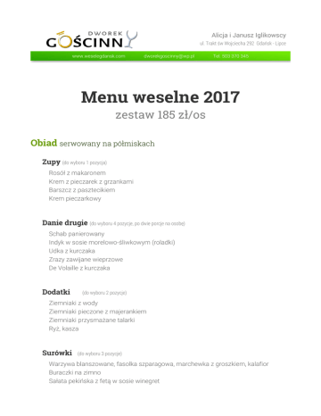 Alicja i Janusz Iglikowscy ul. Trakt św Wojciecha 292 Gdańsk - Lipce www.weselegdansk.com [email protected] Tel. 503 370 345 Menu weselne 2017 zestaw 185 zł/os Obiad serwowany na półmiskach Zupy (do wyboru 1 pozycja) Rosół z makaronem Krem z pieczarek z grzankami Barszcz z pasztecikiem Krem pieczarkowy Danie drugie (do wyboru 4 pozycje, po dwie porcje na osobę) Schab panierowany Indyk w sosie morelowo-śliwkowym (roladki) Udka z kurczaka Zrazy zawijane wieprzowe De Volaille z kurczaka Dodatki (do wyboru 2 pozycje) Ziemniaki z wody Ziemniaki pieczone z majerankiem Ziemniaki przysmażane talarki Ryż, kasza Surówki (do wyboru 3 pozycje) Warzywa blanszowane, fasolka szparagowa, marchewka z groszkiem, kalafior Buraczki na zimno Sałata pekińska z fetą w sosie winegret Alicja i Janusz Iglikowscy ul. Trakt św Wojciecha 292 Gdańsk - Lipce www.weselegdansk.com [email protected] Tel. 503 370 345 Kapusta biała Mizeria Surówka z pomidorów, ogórków z cebulką w sosie śmietanowym Seler z rodzynkami Deser (do wyboru 1 pozycja) Lody z owocami Koktajl owocowy z bitą śmietaną Zakąski serwowane na półmiskach (do wyboru 10 pozycji) Ryba w galarecie (pstrąg) Dorsz po Grecku Śledź w oleju Sałatka z tuńczyka Sałatka ryżowa z kurczakiem gotowanym Sałatka gyros Jajko w majonezie lub sosie tatarskim Sałatka warzywna Galaretka wieprzowa lub drobiowa Pieczeń z karkówki z dipem chrzanowym Schab w galarecie z ananasem lub ze śliwką Rolada serowo-mięsna ze szpinakiem Pulpeciki hiszpańskie z brokułą Półmisek wędlin (szynka sopocka, salami, ser) Sałatka krabowa Kalafior z brokułami w sosie koperkowo-czosnkowym przekładane jajkiem, ogórkiem i pomidorem Marynaty mix (grzybki, ogórki, cebula, papryka) Masło, pieczywo, kawa, herbata Alicja i Janusz Iglikowscy ul. Trakt św Wojciecha 292 Gdańsk - Lipce www.weselegdansk.com Dania na ciepło w nocy [email protected] Tel. 503 370 345 (do wyboru 2 pozycje, serwowane na półmiskach w różnych godzinach) Strogonow Piersi z kurczaka z pieczarkami w sosie cebulowym Udka z kurczaka Kuleczki mielone w ziołach przysmażane z pieczarkami Bigos staropolski Barszcz z pasztecikiem Żurek z białą kiełbasą Kawa i herbata w formie bufetu szwedzkiego Porządek uroczystości Obiad - Deser - Zakąski na zimno - Danie na ciepło o 22:00 - Tort o 23:15 Oczepiny o północy - Danie na ciepło o 2:00 Poprawiny Serwowane potrawy i zakąski weselne. W godzinach 13:00-20:00 w cenie 1200 zł bez limitu gości. Inne godziny możliwe do uzgodnienia. Serdecznie zapraszamy