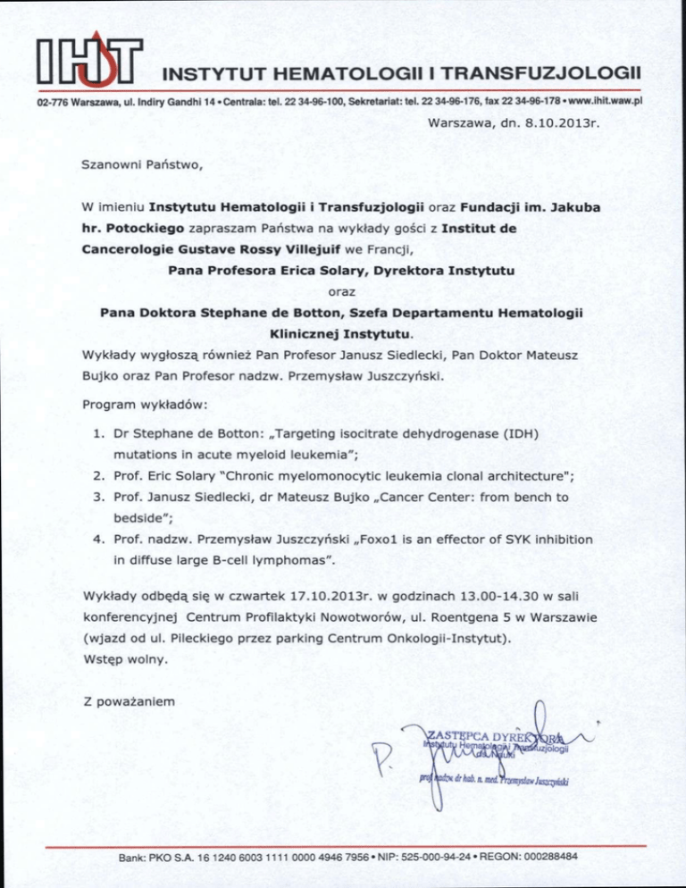 INSTYTUT HEMATOLOGII I TRANSFUZJOLOGII 02-776 Warszawa, ul. Indiry Gandhi 14 -Centrala: tel. 22 34-96-100, Sekretariat: tel. 22 34-96-176, fax 22 34-96-178 •www.ihit.waw.pl Warszawa, d n . 8 . 1 0 . 2 0 1 3 r . Szanowni Państwo, W Imieniu I n s t y t u t u H e m a t o l o g i i i T r a n s f u z j o l o g i i oraz F u n d a c j i i m . J a k u b a h r . P o t o c k i e g o zapraszam Państwa na wykłady gości z I n s t i t u t d e C a n c e r o l o g i e G u s t a v e R o s s y V i l l e j u i f w e Francji, Pana Profesora Erica Solary, Dyrektora Instytutu oraz P a n a Doktora S t e p h a n e de Botton, Szefa Departamentu Hematologii Klinicznej Instytutu. Wykłady wygłoszą również Pan Profesor Janusz Siedlecki, Pan D o k t o r Mateusz B u j k o oraz Pan Profesor nadzw. Przemysław Jaszczyński. Program wykładów: 1 . D r Stephane de B o t t o n : „Targeting isocitrate delnydrogenase ( I D H ) m u t a t i o n s in acute m y e l o i d l e u k e m i a " ; 2. Prof. Erie Solary "Chronić m y e l o m o n o c y t i c leukemia clonal a r c h i t e c t u r e " ; 3. Prof. Janusz Siedlecki, d r Mateusz B u j k o „Cancer Center: f r o m bench t o bedside"; 4. Prof. nadzw. Przemysław Juszczyński „ F o x o l is an effector of SYK inhibition in diffuse large B-cell l y m p h o m a s " . Wykłady odbędą się w czwartek 1 7 . 1 0 . 2 0 1 3 r . w godzinach 1 3 . 0 0 - 1 4 . 3 0 w sali k o n f e r e n c y j n e j C e n t r u m Profilaktyki Nowotworów, u l . Roentgena 5 w Warszawie ( w j a z d od u l . Pileckiego przez p a r k i n g C e n t r u m O n k o l o g i i - I n s t y t u t ) . Wstęp w o l n y . Z poważaniem Bank: PKO S A 16 1240 6003 1111 0000 4946 7956'NIP: 525-000-94-24 • REGON: 000288484