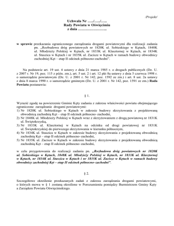 /Projekt/ Uchwała Nr …../…../….. Rady Powiatu w Oświęcimiu z dnia ………………….. w sprawie przekazania ograniczonego zarządzania drogami powiatowymi dla realizacji zadania pn. „Rozbudowa dróg powiatowych nr 1820K ul. Sobieskiego w Kętach, 1848K ul. Młodzieży Polskiej w Kętach, nr 1833K ul. Klasztornej w Kętach, nr 1834K ul. Staszica w Kętach i nr 1835K ul. Zacisze w Kętach w ramach budowy obwodnicy zachodniej Kęt – etap II odcinek północno-zachodni”. Na podstawie art. 19 ust. 4 ustawy z dnia 21 marca 1985 r. o drogach publicznych (Dz. U. z 2007 r. Nr 19, poz. 115 z późn. zm.), art. 5 ust. 2 i art. 12 pkt 8a ustawy z dnia 5 czerwca 1998 r. o samorządzie powiatowym (Dz. U. z 2001 r. Nr 142, poz. 1592 ze zm.) i art. 8 ust. 2a ustawy z dnia 8 marca 1990 r. o samorządzie gminnym (Dz. U. z 2001 r. Nr 142, poz. 1591 ze zm.) Rada Powiatu postanawia: § 1. Wyrazić zgodę na powierzenie Gminie Kęty zadania z zakresu właściwości powiatu obejmującego ograniczone zarządzanie drogami powiatowymi: 1) Nr 1820K ul. Sobieskiego w Kętach w zakresie budowy skrzyżowania z projektowaną obwodnicą zachodnią Kęt – etap II odcinek północno–zachodni, 2) Nr 1848K ul. Młodzieży Polskiej w Kętach wraz z skrzyżowaniem z drogą powiatową nr 1831K ul. Świętokrzyską, 3) Nr 1833K ul. Klasztornej w Kętach na odcinku od drogi powiatowej nr 1831K ul. Świętokrzyskiej do pierwszego skrzyżowania w kierunku północnym, 4) Nr 1834K ul. Staszica w Kętach w zakresie budowy skrzyżowania z projektowaną obwodnicą zachodnią Kęt – etap II odcinek północno–zachodni, 5) Nr 1835K ul. Zacisze w Kętach w zakresie budowy skrzyżowania z projektowaną obwodnicą zachodnią Kęt – etap II odcinek północno–zachodni, w celu przygotowania do realizacji zadania pn. „Rozbudowa dróg powiatowych nr 1820K ul. Sobieskiego w Kętach, 1848K ul. Młodzieży Polskiej w Kętach, nr 1833K ul. Klasztornej w Kętach, nr 1834K ul. Staszica w Kętach i nr 1835K ul. Zacisze w Kętach w ramach budowy obwodnicy zachodniej Kęt – etap II odcinek północno–zachodni”. § 2. Szczegółowe określenie przekazanych zadań z zakresu zarządzania drogami powiatowymi, o których mowa w § 1 zostaną określone w Porozumieniu pomiędzy Burmistrzem Gminy Kęty a Zarządem Powiatu Oświęcimskiego. § 3. Wykonanie uchwały powierza się Zarządowi Powiatu w Oświęcimiu. § 4. Uchwała wchodzi w życie z dniem podjęcia. Uzasadnienie Przyjęcie uchwały w sprawie przekazania Gminie Kęty ograniczonego zarządzania drogami powiatowymi: 1) Nr 1820K ul. Sobieskiego w Kętach w zakresie budowy skrzyżowania z projektowaną obwodnicą zachodnią Kęt – etap II odcinek północno–zachodni, 2) Nr 1848K ul. Młodzieży Polskiej w Kętach wraz z skrzyżowaniem z drogą powiatową nr 1831K ul. Świętokrzyską, 3) Nr 1833K ul. Klasztornej w Kętach na odcinku od drogi powiatowej nr 1831K ul. Świętokrzyskiej do pierwszego skrzyżowania w kierunku północnym, 4) Nr 1834K ul. Staszica w Kętach w zakresie budowy skrzyżowania z projektowaną obwodnicą zachodnią Kęt – etap II odcinek północno–zachodni, 5) Nr 1835K ul. Zacisze w Kętach w zakresie budowy skrzyżowania z projektowaną obwodnicą zachodnią Kęt – etap II odcinek północno–zachodni, pozwoli na opracowanie dokumentacji projektowej wraz z uzyskaniem wszystkich niezbędnych uzgodnień, w tym decyzji zezwalającej na realizację inwestycji drogowej, pozyskanie działek pod poszerzenie pasa drogowego, oraz realizację inwestycji pn. „Rozbudowa dróg powiatowych nr 1820K ul. Sobieskiego w Kętach, 1848K ul. Młodzieży Polskiej w Kętach, nr 1833K ul. Klasztornej w Kętach, nr 1834K ul. Staszica w Kętach i nr 1835K ul. Zacisze w Kętach w ramach budowy obwodnicy zachodniej Kęt – etap II odcinek północno–zachodni”.