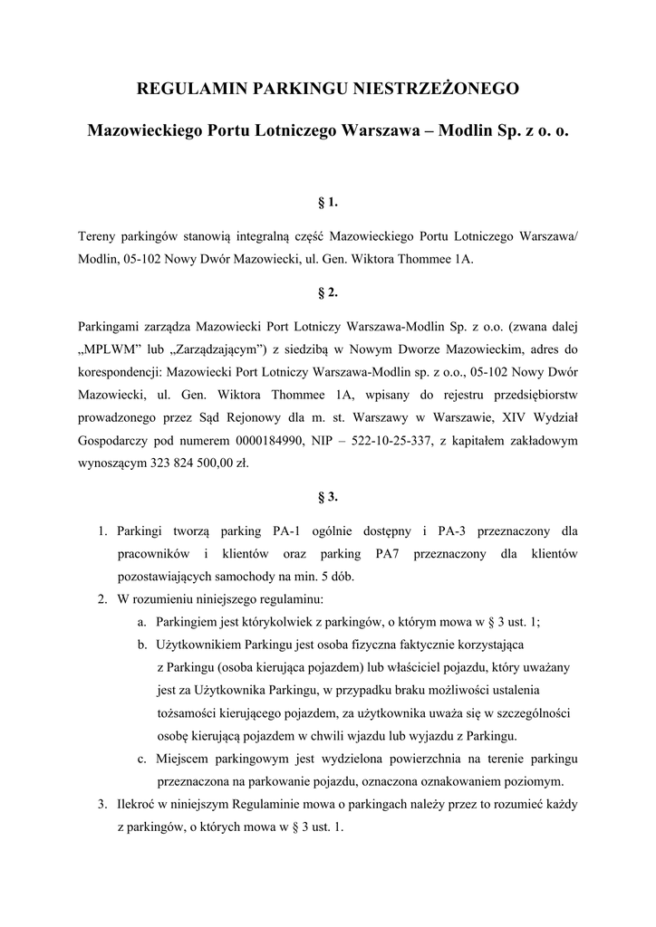 REGULAMIN PARKINGU NIESTRZEŻONEGO Mazowieckiego Portu Lotniczego Warszawa – Modlin Sp. z o. o. § 1. Tereny parkingów stanowią integralną część Mazowieckiego Portu Lotniczego Warszawa/ Modlin, 05-102 Nowy Dwór Mazowiecki, ul. Gen. Wiktora Thommee 1A. § 2. Parkingami zarządza Mazowiecki Port Lotniczy Warszawa-Modlin Sp. z o.o. (zwana dalej „MPLWM” lub „Zarządzającym”) z siedzibą w Nowym Dworze Mazowieckim, adres do korespondencji: Mazowiecki Port Lotniczy Warszawa-Modlin sp. z o.o., 05-102 Nowy Dwór Mazowiecki, ul. Gen. Wiktora Thommee 1A, wpisany do rejestru przedsiębiorstw prowadzonego przez Sąd Rejonowy dla m. st. Warszawy w Warszawie, XIV Wydział Gospodarczy pod numerem 0000184990, NIP – 522-10-25-337, z kapitałem zakładowym wynoszącym 323 824 500,00 zł. § 3. 1. Parkingi tworzą parking PA-1 ogólnie dostępny i PA-3 przeznaczony dla pracowników i klientów oraz parking PA7 przeznaczony dla klientów pozostawiających samochody na min. 5 dób. 2. W rozumieniu niniejszego regulaminu: a. Parkingiem jest którykolwiek z parkingów, o którym mowa w § 3 ust. 1; b. Użytkownikiem Parkingu jest osoba fizyczna faktycznie korzystająca z Parkingu (osoba kierująca pojazdem) lub właściciel pojazdu, który uważany jest za Użytkownika Parkingu, w przypadku braku możliwości ustalenia tożsamości kierującego pojazdem, za użytkownika uważa się w szczególności osobę kierującą pojazdem w chwili wjazdu lub wyjazdu z Parkingu. c. Miejscem parkingowym jest wydzielona powierzchnia na terenie parkingu przeznaczona na parkowanie pojazdu, oznaczona oznakowaniem poziomym. 3. Ilekroć w niniejszym Regulaminie mowa o parkingach należy przez to rozumieć każdy z parkingów, o których mowa w § 3 ust. 1. 4. Parkingi należące do MPLWM są niestrzeżone i płatne. 5. Poprzez wjazd na teren Parkingu następuje zawarcie przez Użytkownika z Zarządzającym, umowy najmu miejsca parkingowego na warunkach określonych w niniejszym Regulaminie. 6. Każdy użytkownik pojazdu poprzez wjazd na teren Parkingu wyraża zgodę na warunki niniejszego Regulaminu i zobowiązuje się do ścisłego przestrzegania jego postanowień. 7. Umowa najmu miejsca parkingowego wygasa z chwilą wyjazdu użytkownika z Parkingu lub w czasie nie funkcjonowania Parkingu. 8. W przypadku korzystania z parkingu długoterminowego PA7 MPLWM nie ponosi odpowiedzialności za ewentualne spóźnienia klientów parkingu na samolot. Planując podróż należy uwzględnić czas oczekiwania i transferu z parkingu PA7 do terminala. § 4. 1. MPLWM nie ponosi odpowiedzialności za utratę lub uszkodzenie znajdujących się na terenie parkingów pojazdów mechanicznych lub rzeczy stanowiących ich wyposażenie, jak również nie odpowiada za rzeczy pozostawione w tych pojazdach oraz inne przedmioty pozostawione na parkingu. 2. Pojazd po ustawieniu na miejscu parkingowym powinien być unieruchomiony, mieć wyłączony zapłon, światła. Użytkownik zobowiązany jest do wyłączenia pozostawionych w pojeździe urządzeń radiofonicznych (jeśli Użytkownik opuszcza samochód). 3. Pojazd pozostawiony na parkingu powinien być skutecznie zabezpieczony przed samoczynnym przemieszczeniem się (przed staczaniem się). Ryzyko skutków w tym zakresie ponosi w pełni Użytkownik Parkingu, także w stosunku do osób trzecich. 4. Za przedmioty pozostawione w pojeździe całkowitą odpowiedzialność ponosi Użytkownik Parkingu. 5. Zaparkowany pojazd powinien mieć szczelnie zamknięte szyby i wszystkie zamki tak, aby dostęp do wnętrza był niemożliwy. 6. Stan techniczny pojazdu nie powinien zagrażać otoczeniu. Ryzyko strat powstałych wskutek niesprawności technicznej pojazdu na terenie parkingu ponosi Użytkownik Parkingu. Zabrania się wykonywania rozruchu pojazdu za pomocą holowania (zaciągania). 7. Bezwzględnie zakazane jest używanie ognia otwartego na terenie całego parkingu. 8. W przypadku korzystania z parkingu długoterminowego PA7 MPLWM nie ponosi odpowiedzialności za ewentualne spóźnienia klientów na samolot. Planując podróż należy uwzględnić czas oczekiwania i transferu z parkingu PA7 do terminala. § 5. 1. Parkingi są czynne 24 h/ dobę, przez wszystkie dni w roku. 2. Parking jest przeznaczony dla samochodów osobowych, dostawczych i pojazdów jednośladowych. 3. Zarządzający jest uprawniony do zamknięcia i otwarcia Parkingu w terminach przez siebie ustalonych, jak również do podjęcia decyzji o okresowym wyłączeniu Parkingu z użytkowania lub zmianie czasu otwarcia Parkingu. 4. Na parkingach obowiązuje bezwzględny zakaz wjazdu pojazdów przewożących materiały niebezpieczne, w szczególności łatwopalne, żrące, wybuchowe oraz inne, jeżeli znajdujący się w nich niebezpieczny materiał nie jest zabezpieczony zgodnie z obowiązującymi przepisami. 5. Na parkingu obowiązuje zakaz wjazdu pojazdów z przyczepami. 6. Na parkingach obowiązuje zakaz prowadzenia działalności gospodarczej - handlowej lub reklamowej, za działalność reklamową uważa się również parkowanie pojazdów oznakowanych nazwą lub/i logo osób i podmiotów prowadzących działalność gospodarczą (za wyjątkiem sytuacji, gdy taka działalność jest prowadzona za zgodą i wiedzą MPWLM). § 6. 1. Na terenie parkingów, dróg dojazdowych i wewnętrznych, obowiązują przepisy ustawy Prawo o Ruchu Drogowym (Dz. U. z 2005r. nr 108 poz. 908 z późniejszymi zmianami) oraz maksymalna prędkość poruszania się pojazdów 10 km/h. 2. Kierowcy pojazdów korzystający z parkingu zobowiązani są do przestrzegania znaków drogowych pionowych i poziomych, poleceń obsługi parkingu oraz innych osób posiadających uprawnienia w tym zakresie (Służba Ochrony Lotniska, Policja, Straż Graniczna, Straż Miejska). § 7. Wjeżdżając na parking należy obowiązkowo: 1. Zatrzymać się przed zaporą przy automacie biletowym lub czytniku kart magnetycznych. 2. Uruchomić zaporę przez pobranie biletu parking