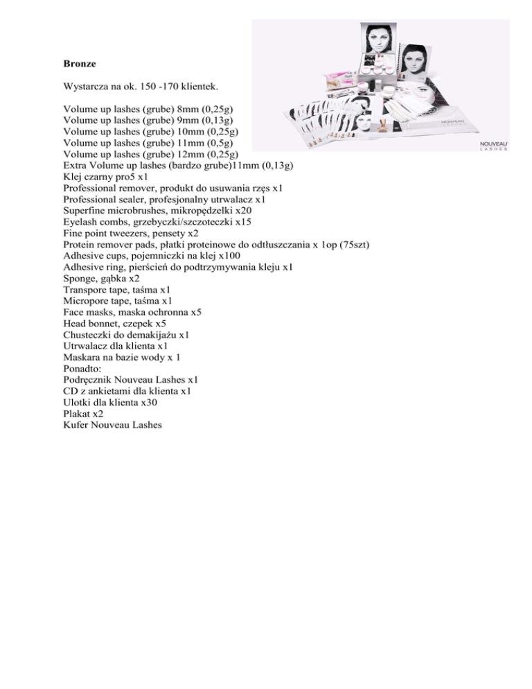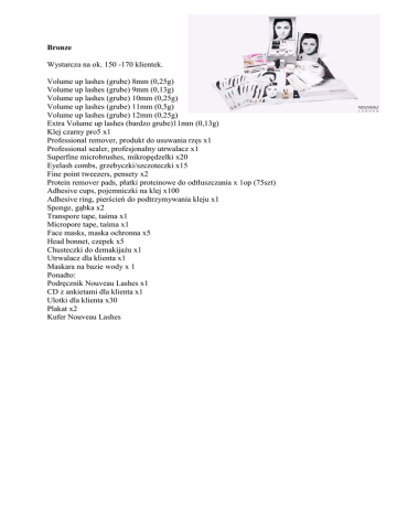 Bronze Wystarcza na ok. 150 -170 klientek. Volume up lashes (grube) 8mm (0,25g) Volume up lashes (grube) 9mm (0,13g) Volume up lashes (grube) 10mm (0,25g) Volume up lashes (grube) 11mm (0,5g) Volume up lashes (grube) 12mm (0,25g) Extra Volume up lashes (bardzo grube)11mm (0,13g) Klej czarny pro5 x1 Professional remover, produkt do usuwania rzęs x1 Professional sealer, profesjonalny utrwalacz x1 Superfine microbrushes, mikropędzelki x20 Eyelash combs, grzebyczki/szczoteczki x15 Fine point tweezers, pensety x2 Protein remover pads, płatki proteinowe do odtłuszczania x 1op (75szt) Adhesive cups, pojemniczki na klej x100 Adhesive ring, pierścień do podtrzymywania kleju x1 Sponge, gąbka x2 Transpore tape, taśma x1 Micropore tape, taśma x1 Face masks, maska ochronna x5 Head bonnet, czepek x5 Chusteczki do demakijażu x1 Utrwalacz dla klienta x1 Maskara na bazie wody x 1 Ponadto: Podręcznik Nouveau Lashes x1 CD z ankietami dla klienta x1 Ulotki dla klienta x30 Plakat x2 Kufer Nouveau Lashes Silver Wystarcza na ok. 225 -250 klientów Volume up lashes (grube) 8mm (0,25g) Volume up lashes (grube) 9mm (0,13g) Volume up lashes (grube) 10mm (0,25g) Volume up lashes (grube) 11mm (0,5g) Volume up lashes (grube) 12mm (0,25g) Extra Volume up lashes (bardzo grube) 8mm (0,13g) Extra Volume up lashes (bardzo grube) 11mm (o,13g) Extra Volume up lashes C(bardzo grube) 12mm (0,13g) Klej czarny pro5 x1 Professional remover, produkt do usuwania rzęs x1 Professional sealer, profesjonalny utrwalacz x1 Superfine microbrushes, mikropędzelki x40 Eyelash combs, grzebyczki/szczoteczki x10 Gel patches, płatki przeciwzmarszczkowe x10/5 aplikacji Fine point tweezers, pęsety x2 Protein remover pads, płatki proteinowe do odtłuszczania x 1op (75szt) Adhesive cups, pojemniczki na klej x50 Adhesive ring, pierścień do podtrzymywania kleju x2 Sponge, gąbka x2 Transpore tape, taśma x1 Micropore tape, taśma x1 Face masks, maska ochronna x5 Head bonnet, czepek x5 Chusteczki do demakijażu x1 Utrwalacz dla klienta x1 Maskara NOIR Nouveau Lashes na bazie wody x1 Maskara na bazie wody x1 Podręcznik Nouveau Lashes x 1 CD z ankietami dla klienta x 1 Ulotki dla klienta x 30 Plakat x2 Kufer Nouveau Lashes Gold Wystarcza na ok. 350-400 klientów Volume up lashes (grube) 8mm (0,5g) Volume up lashes (grube) 9mm ( 0,13g) Volume up lashes (grube) 10mm (0,5g) Volume up lashes (grube) 11mm (0,5g) Volume up lashes (grube) 12mm (0,5g) Extra Volume up lashes (bardzo grube) 8mm (0,5g) Extra Volume up lashes (bardzo grube) 10mm (0,5g) Extra Volume up lashes ( bardzo grube) 11mm (0,13g) Extra Volume up lashes (bardzo grube) 13mm (0,5g) Extra Volyme up lashes C (bardzo grube) 12mm (0,13g) Klej czarny pro5 x1 Klej czarny pro10 x1 Adhesive remover, produkt do usuwania rzęs x1 Professional sealer, profesjonalny utrwalacz x 1 Superfine microbrushes, pędzelki x40 Eyelash combs, szczoteczki x25 Gel patches, żelowe płatki x20/10 aplikacji Fine point tweezers, pęsety x2 Protein remover pads, płatki proteinowe do odtłuszczania x 1op (75szt) Adhesive cups, pojemniczki na klej x100 Adhesive cup holder ring, pierścień na klej x2 Sponge, gąbka x2 Transpore tape, taśma x1 Micropore tape, taśma x1 Saline solution x2 Face masks, maski x5 Head bonnets, czepki x5 Chusteczki do demakijażu x1 Utrwalacz dla klienta x1 Maskara NOIR Nouveau Lashes x1 Maskara na bazie wody x2 Podręcznik Nouveau Lashes x1 CD z ankietami dla klienta x1 Ulotki dla klienta x50 Plakat x2 Kufer Nouveau Lashes Platinum Wystarcza na ok 550 aplikacji Volume up lashes (grube) 8mm (0,5g) Volume up lashes (grube) 9mm (0,13g) Volume up lashes (grube) 10mm (0,5g) Volume up lashes (grube) 11mm (0,5g) Volume up lashes (grube) 12mm (0,5g) Volume up lashes (grube) 13mm (0,13g) Extra Volume up lashes (bardzo grube) 8mm (0,5g) Extra Volume up lashes (bardzo grube) 10mm (0,5g) Extra Volume up lashes (bardzo grube) 11mm (0,13g) Extra Volume up lashes (bardzo grube) 13mm (0,5g) Extra Volume up lashes C (bardzo grube) 12mm (0,13g) Sleeker lashes (cienkie)7mm (0,5g) Volume up lashes (grube) granatowe 13mm (0,13g) Klej czarny pro5 x1 Klej czarny pro10 x1 Adhesive remover, produkt do usuwania rzęs x1 Professional sealer, profesjonalny utrwalacz x1 Superfine microbrushes, pędzelki x1 op. (100szt) Eyelash combs, szczoteczki x25 Gel patches, żelowe płatki x20/10 aplikacji Fine point tweezers, pensety x2 Protein remover pads, płatki proteinowe do odtłuszczania x1op (75szt) Disinfectant wipes, chusteczki do dezynfekcji x1 op. Saline solution x2 Adhesive cups, pojemniczki na klej x100 Adhesive cup holder ring, pierścień na klej x2 Sponge, gąbka x2 Podkładka silikonowa x1 Transpore tape, taśma x1 Micropore tape, taśma x1 Face masks, maski x5 Head bonnets, czepki x5 Chusteczki do demakijażu x1 Utrwalacz dla klienta x1 Maskara NOIR Nouveau Lashes x1 Maskara na bazie wody x1 Podręcznik Nouveau Lashes x1 CD z ankietami dla klienta x1 Ulotki dla klienta x50 Plakat x2 Kufer Nouveau Lashes