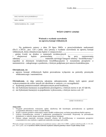 Liszki, dnia .................................. .......................................................... (imię i nazwisko, nazwa przedsiębiorcy) ......................................................... (adres, siedziba) ......................................................... (telefon kontaktowy, fax. , e-mail) WÓJT GMINY LISZKI Wniosek o wydanie zezwolenia na uprawę konopi włóknistych Na podstawie ustawy z dnia 29 lipca 2005r. o przeciwdziałaniu narkomanii (Dz.U. z 2012r., poz. 124 z późn. zm.) proszę o wydanie zezwolenia na uprawę konopi włóknistych, która zlokalizowana będzie w miejscowości .......................................................... – gmina Liszki na działce o numerach ewidencyjnych ................................................ i obejmować będzie powierzchnię ............... ha przy zastosowaniu odmiany ............................................ materiału siewnego kategorii elitarny / kwalifikowany(*) (zgodnie ze złożonym świadectwem kwalifikacyjnym) w rozumieniu przepisów o nasiennictwie - zakupionego u podmiotu, z którym podpisana jest umowa kontraktacyjna. Oświadczam, że: uprawa konopi włóknistych będzie prowadzona wyłącznie na potrzeby przemysłu włókienniczego i nasiennictwa a) Oświadczam, że daję należytą rękojmię zabezpieczenia zbioru tych upraw przed wykorzystaniem do celów innych niż określone w ustawie, a w szczególności a) dysponuję pomieszczeniem zabezpieczonym przed kradzieżą , b) nie byłem(am) karany(a) za popełnienie przestępstwa, o którym mowa w art. 63 lub 64, c) nie byłem(am) karany(a) za popełnienie wykroczenia, o którym mowa a art. 65 ........................................... (podpis wnioskodawcy) Załączniki: 1. Oryginał potwierdzenia wniesienia opłaty skarbowej lub kserokopia poświadczona za zgodność z oryginałem dokonana w kasie Urzędu Miasta. 2. Wypis z rejestru gruntów oznaczający numer działki ewidencyjnej, na której prowadzona będzie uprawa. 3. Umowa kontraktacyjna zawarta z podmiotem posiadającym zezwolenie Wojewody na prowadzenie działalności w zakresie skupu materiału siewnego/słomy konopnej. 4. Faktura zakupu materiału siewnego kategorii elitarny lub kwalifikowany w rozumieniu przepisów o nasiennictwie oraz etykieta z opakowań materiału siewnego tych roślin. Wniosek wymaga wniesienia opłaty skarbowej na podstawie ustawy z dnia 16.11.2006r. o opłacie skarbowej (Dz. U. Nr 225, poz. 1635 z późn. zm) w wysokości 30,00 zł (słownie trzydzieści złotych) gotówką w kasie Urzędu Gminy Liszki.