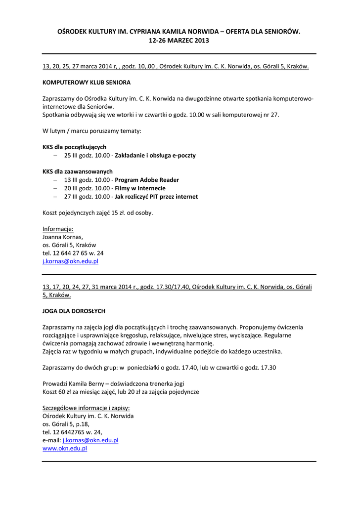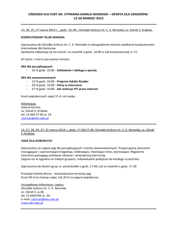OŚRODEK KULTURY IM. CYPRIANA KAMILA NORWIDA – OFERTA DLA SENIORÓW. 12-26 MARZEC 2013 13, 20, 25, 27 marca 2014 r, , godz. 10,.00 , Ośrodek Kultury im. C. K. Norwida, os. Górali 5, Kraków. KOMPUTEROWY KLUB SENIORA Zapraszamy do Ośrodka Kultury im. C. K. Norwida na dwugodzinne otwarte spotkania komputerowointernetowe dla Seniorów. Spotkania odbywają się we wtorki i w czwartki o godz. 10.00 w sali komputerowej nr 27. W lutym / marcu poruszamy tematy: KKS dla początkujących − 25 III godz. 10.00 - Zakładanie i obsługa e-poczty KKS dla zaawansowanych − 13 III godz. 10.00 - Program Adobe Reader − 20 III godz. 10.00 - Filmy w Internecie − 27 III godz. 10.00 - Jak rozliczyć PIT przez internet Koszt pojedynczych zajęć 15 zł. od osoby. Informacje: Joanna Kornas, os. Górali 5, Kraków tel. 12 644 27 65 w. 24 [email protected] 13, 17, 20, 24, 27, 31 marca 2014 r., godz. 17.30/17.40, Ośrodek Kultury im. C. K. Norwida, os. Górali 5, Kraków. JOGA DLA DOROSŁYCH Zapraszamy na zajęcia jogi dla początkujących i trochę zaawansowanych. Proponujemy ćwiczenia rozciągające i usprawniające kręgosłup, relaksujące, niwelujące stres, wyciszające. Regularne ćwiczenia pomagają zachować zdrowie i wewnętrzną harmonię. Zajęcia raz w tygodniu w małych grupach, indywidualne podejście do każdego uczestnika. Zapraszamy do dwóch grup: w poniedziałki o godz. 17.40, lub w czwartki o godz. 17.30 Prowadzi Kamila Berny – doświadczona trenerka jogi Koszt 60 zł za miesiąc zajęć, lub 20 zł za zajęcia pojedyncze Szczegółowe informacje i zapisy: Ośrodek Kultury im. C. K. Norwida os. Górali 5, p.18, tel. 12 6442765 w. 24, e-mail: [email protected] www.okn.edu.pl 13 marca 2014 r., godz. 18.00, Klub Kuźnia Ośrodka Kultury im. C. K. Norwida, os. Złotego Wieku 14, Kraków. SPOTKANIE GRUPY LITERACKIEJ SYLABA. Grupa literacka SYLABA w Ośrodku Kultury im.C.K.Norwida prowadzi działalność od prawie 30 lat. Tworzą ją osoby różnych zawodów i zainteresowań, w wieku 17 – 75 lat, które piszą wiersze, literacką prozę i spotykają się systematycznie by słuchać i czytać poezję, dyskutować o własnych wierszach oraz zjawiskach, fascynacjach i wydarzeniach literackich. Warsztaty „Sylaby” prowadzi znana krakowska poetka Elżbieta Zechenter-Spławińska, życzliwa i jednocześnie wymagająca, często pierwsza recenzentka utworów czytanych podczas warsztatów przez autorów. Opiekunem grupy jest Wiesława Wykurz – polonistka. Gośćmi „Sylaby” byli krakowscy poeci: Ewa Lipska, Józef Baran, Henryk Cyganik. Zapraszamy w każdy 2.czwartek miesiąca o godz.18.00. Dojazd: Tramwaj nr 9, Autobusy nr 128, 178, 123 – przystanek Plac Targowy Mistrzejowice Szczegółowa Informacja: Klub Kuźnia Ośrodka Kultury im. C. K. Norwida Os. Złotego Wieku 14, Kraków 12 648 08 86 [email protected] www.kuznia.edu.pl 13 marca 2014 r., godz. 18.00, Galeria „m” Klubu Kuźnia Ośrodka Kultury im. C. K. Norwida, os. Złotego Wieku 14, Kraków. „ALEJE JEROZOLIMSKIE - IZRAEL”. WERNISAŻ WYSTAWY FOTOGRAFII ANDRZEJA KALINOWSKIEGO. Serdecznie zapraszamy do Galerii „m” Klubu Kuźnia Ośrodka Kultury im. C. K. Norwida na wernisaż fotografii Andrzeja Kalinowskiego, który odbędzie się 13 marca o godz. 18.00. Wstęp wolny. Informacje: Klub Kuźnia Ośrodka Kultury im. C. K. Norwida Os. Złotego Wieku 14 12 648 08 86 [email protected] www.kuznia.edu.pl 14 marca 2014 r., godz. 17.00, ARTzona Ośrodka Kultury im. C. K. Norwida, os. Górali 4, Kraków. WIERZBOWA STREFA RODZINNA. WARSZTATY WIKLINOWO-WIERZBOWE DLA RODZIN. Zapraszamy na cykl warsztatów rodzinnych w nowohuckiej ARTzonie Ośrodka Kultury im. C. K. Norwida. Będziemy uczyć rodziny jak wspólnie (mama i córka, tata i dzieci, dzieci i babcia, brat i brat, dziadek, tata i wnuk...) wykonać wyjątkowe, piękne i przydatne w domu przedmioty z wikliny. Na warsztatach będzie można poznać różne rodzaje tradycyjnych plecionek, dowiedzieć się jak bardzo wierzba, wiklina oraz plecionkarstwo są splecione z polską i światową obrzędowością i tradycją literacką. Inspiracją warsztatów są zwyczaje polskie, europejskie i ... dalekowschodnie. Pokażemy jak wykorzystać je może, także w zupełnie nowoczesny sposób, współczesna rodzina :) co i kiedy: :: Trzecie spotkanie: kolorowe dziecięce koszyczki na Wielkanoc 14.03.2014 (marcowy piątek) :: Czwarte spotkanie: palmy z wierzbowymi baziami 11.04.2014 (kwietniowy piątek przed Niedzielą Palmową) za ile: każde spotkanie - 30 zł/os.dorosła, 15 zł/dziecko karnet na wszystkie 4 miesiące: 100 zł/os.dorosła, 50 zł/dziecko dzieci do l.3 bezpłatnie w cenę są wliczone wszystkie potrzebne materiały Prowadzenie: instruktorki z Polskiej Wierzby Info i zapisy: mail: [email protected] tel.: 530 322 029 skype: polskawierzba www.facebook.com/PolskaWierzba Każde spotkanie trwa 2 godz. Uczestnicy zabierają ze sobą do domu wszystkie wykonane na warsztatach przedmioty! Dodatkowo - każda rodzina dostaje "gratisowy pakiet startowy Zrób-To-Sam do wykonania w domu"! :) Dojazd: Tramwaj: 1, 5 Autobus: 123, 139, 153, 193, 501 Miejsce ARTzona Ośrodka Kultury im. C. K. Norwida, os. Górali 4, Kraków www.facebook.com/ARTzonaOKN 14 marca 2014 r., godz. 18.00, ARTzona Ośrodka Kultury im. C. K. Norwida, os. Górali 4 PRYWATNE PODRÓŻE. MAŁE I DUŻE: QUO VADIS ALTIPLANO? Slajdowisko z udziałem Łukasza Wielgosa. Serdecznie zapraszamy do ARTzony Ośrodka Kultury im. C. K. Norwida na slajdowisko z udziałem Łukasza Wielgosa. „Opowieści z wycieczki z plecakiem, z obydwu stron Andów i z samego ich serca - mistycznego Altiplano. Będzie o naturze, ludziach, kulturze, historii. Będzie też o jedzeniu, kopalniach srebra, lamach i bałkańskich gangsterach. A na deser Buenos Aires.” Cykl poświecony jest przygodom podróżniczym uczestników spotkań. Każdy z nas odkrywa na co dzień wiele ciekawych miejsc, o których będzie miał okazję opowiedzieć, dzieląc s