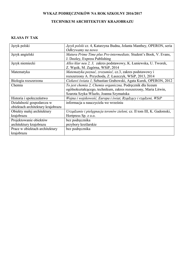 WYKAZ PODRĘCZNIKÓW NA ROK SZKOLNY 2016/2017 TECHNIKUM ARCHITEKTURY KRAJOBRAZU KLASA IV TAK Język polski Język angielski Język niemiecki Matematyka Biologia rozszerzona Chemia Historia i społeczeństwo Działalność gospodarcza w obiektach architektury krajobrazu Obiekty małej architektury krajobrazu Projektowanie obiektów architektury krajobrazu Prace w obiektach architektury krajobrazu Język polski cz. 4, Katarzyna Budna, Jolanta Manthey, OPERON, seria Odkrywamy na nowo Matura Prime Time plus Pre-intermediate, Student’s Book, V. Evans, J. Dooley, Express Publishing Alles klar neu 2, 3, zakres podstawowy, K. Łuniewska, U. Tworek, Z. Wąsik, M. Zagórna, WSiP, 2014 Matematyka poznać, zrozumieć, cz.3, zakres podstawowy i rozszerzony A. Przychoda, Z. Łaszczyk, WSiP, 2013, 2014 Ciekawi świata 1, Sebastian Grabowski, Agata Kurek, OPERON, 2012 To jest chemia 2, Chemia organiczna, Podręcznik dla liceum ogólnokształcącego, technikum, zakres rozszerzony, Maria Litwin, Szarota Szyka-Wlazło, Joanna Szymańska Wojna i wojskowość, Europa i świat, Rządzący i rządzeni, WSiP informacja u nauczyciela we wrześniu Urządzanie i pielęgnacja terenów zieleni, cz. II tom III, K. Gadomski, Hortpress Sp. z o.o. bez podręcznika przybory kreślarskie bez podręcznika
