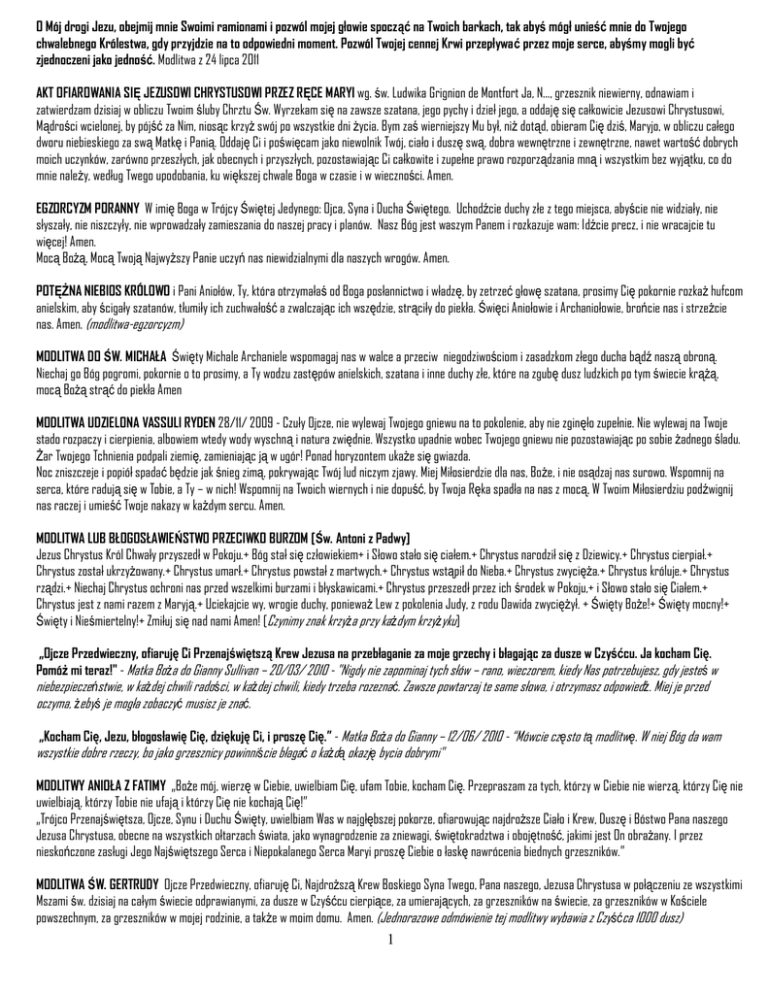 O Mój drogi Jezu, obejmij mnie Swoimi ramionami i pozwól mojej głowie spocząć na Twoich barkach, tak abyś mógł unieść mnie do Twojego chwalebnego Królestwa, gdy przyjdzie na to odpowiedni moment. Pozwól Twojej cennej Krwi przepływać przez moje serce, abyśmy mogli być zjednoczeni jako jedność. Modlitwa z 24 lipca 2011 AKT OFIAROWANIA SIĘ JEZUSOWI CHRYSTUSOWI PRZEZ RĘCE MARYI wg. św. Ludwika Grignion de Montfort Ja, N..., grzesznik niewierny, odnawiam i zatwierdzam dzisiaj w obliczu Twoim śluby Chrztu Św. Wyrzekam się na zawsze szatana, jego pychy i dzieł jego, a oddaję się całkowicie Jezusowi Chrystusowi, Mądrości wcielonej, by pójść za Nim, niosąc krzyż swój po wszystkie dni życia. Bym zaś wierniejszy Mu był, niż dotąd, obieram Cię dziś, Maryjo, w obliczu całego dworu niebieskiego za swą Matkę i Panią. Oddaję Ci i poświęcam jako niewolnik Twój, ciało i duszę swą, dobra wewnętrzne i zewnętrzne, nawet wartość dobrych moich uczynków, zarówno przeszłych, jak obecnych i przyszłych, pozostawiając Ci całkowite i zupełne prawo rozporządzania mną i wszystkim bez wyjątku, co do mnie należy, według Twego upodobania, ku większej chwale Boga w czasie i w wieczności. Amen. EGZORCYZM PORANNY W imię Boga w Trójcy Świętej Jedynego: Ojca, Syna i Ducha Świętego. Uchodźcie duchy złe z tego miejsca, abyście nie widziały, nie słyszały, nie niszczyły, nie wprowadzały zamieszania do naszej pracy i planów. Nasz Bóg jest waszym Panem i rozkazuje wam: Idźcie precz, i nie wracajcie tu więcej! Amen. Mocą Bożą, Mocą Twoją Najwyższy Panie uczyń nas niewidzialnymi dla naszych wrogów. Amen. POTĘŻNA NIEBIOS KRÓLOWO i Pani Aniołów, Ty, która otrzymałaś od Boga posłannictwo i władzę, by zetrzeć głowę szatana, prosimy Cię pokornie rozkaż hufcom anielskim, aby ścigały szatanów, tłumiły ich zuchwałość a zwalczając ich wszędzie, strąciły do piekła. Święci Aniołowie i Archaniołowie, brońcie nas i strzeżcie nas. Amen. (modlitwa-egzorcyzm) MODLITWA DO ŚW. MICHAŁA Święty Michale Archaniele wspomagaj nas w walce a przeciw niegodziwościom i zasadzkom złego ducha bądź naszą obroną. Niechaj go Bóg pogromi, pokornie o to prosimy, a Ty wodzu zastępów anielskich, szatana i inne duchy złe, które na zgubę dusz ludzkich po tym świecie krążą, mocą Bożą strąć do piekła Amen MODLITWA UDZIELONA VASSULI RYDEN 28/11/ 2009 - Czuły Ojcze, nie wylewaj Twojego gniewu na to pokolenie, aby nie zginęło zupełnie. Nie wylewaj na Twoje stado rozpaczy i cierpienia, albowiem wtedy wody wyschną i natura zwiędnie. Wszystko upadnie wobec Twojego gniewu nie pozostawiając po sobie żadnego śladu. Żar Twojego Tchnienia podpali ziemię, zamieniając ją w ugór! Ponad horyzontem ukaże się gwiazda. Noc zniszczeje i popiół spadać będzie jak śnieg zimą, pokrywając Twój lud niczym zjawy. Miej Miłosierdzie dla nas, Boże, i nie osądzaj nas surowo. Wspomnij na serca, które radują się w Tobie, a Ty – w nich! Wspomnij na Twoich wiernych i nie dopuść, by Twoja Ręka spadła na nas z mocą, W Twoim Miłosierdziu podźwignij nas raczej i umieść Twoje nakazy w każdym sercu. Amen. MODLITWA LUB BŁOGOSŁAWIEŃSTWO PRZECIWKO BURZOM [Św. Antoni z Padwy] Jezus Chrystus Król Chwały przyszedł w Pokoju.+ Bóg stał się człowiekiem+ i Słowo stało się ciałem.+ Chrystus narodził się z Dziewicy.+ Chrystus cierpiał.+ Chrystus został ukrzyżowany.+ Chrystus umarł.+ Chrystus powstał z martwych.+ Chrystus wstąpił do Nieba.+ Chrystus zwycięża.+ Chrystus króluje.+ Chrystus rządzi.+ Niechaj Chrystus ochroni nas przed wszelkimi burzami i błyskawicami.+ Chrystus przeszedł przez ich środek w Pokoju,+ i Słowo stało się Ciałem.+ Chrystus jest z nami razem z Maryją.+ Uciekajcie wy, wrogie duchy, ponieważ Lew z pokolenia Judy, z rodu Dawida zwyciężył. + Święty Boże!+ Święty mocny!+ Święty i Nieśmiertelny!+ Zmiłuj się nad nami Amen! [Czynimy znak krzyża przy każdym krzyżyku] „Ojcze Przedwieczny, ofiaruję Ci Przenajświętszą Krew Jezusa na przebłaganie za moje grzechy i błagając za dusze w Czyśćcu. Ja kocham Cię. Pomóż mi teraz!" - Matka Boża do Gianny Sullivan – 20/03/ 2010 - "Nigdy nie zapominaj tych słów – rano, wieczorem, kiedy Nas potrzebujesz, gdy jesteś w niebezpieczeństwie, w każdej chwili radości, w każdej chwili, kiedy trzeba rozeznać. Zawsze powtarzaj te same słowa, i otrzymasz odpowiedź. Miej je przed oczyma, żebyś je mogła zobaczyć musisz je znać. „Kocham Cię, Jezu, błogosławię Cię, dziękuję Ci, i proszę Cię.” - Matka Boża do Gianny – 12/06/ 2010 - “Mówcie często tą modlitwę. W niej Bóg da wam wszystkie dobre rzeczy, bo jako grzesznicy powinniście błagać o każdą okazję bycia dobrymi" MODLITWY ANIOŁA Z FATIMY „Boże mój, wierzę w Ciebie, uwielbiam Cię, ufam Tobie, kocham Cię. Przepraszam za tych, którzy w Ciebie nie wierzą, którzy Cię nie uwielbiają, którzy Tobie nie ufają i którzy Cię nie kochają Cię!” „Trójco Przenajświętsza, Ojcze, Synu i Duchu Święty, uwielbiam Was w najgłębszej pokorze, ofiarowując najdroższe Ciało i Krew, Duszę i Bóstwo Pana naszego Jezusa Chrystusa, obecne na wszystkich ołtarzach świata, jako wynagrodzenie za zniewagi, świętokradztwa i obojętność, jakimi jest On obrażany. I przez nieskończone zasługi Jego Najświętszego Serca i Niepokalanego Serca Maryi proszę Ciebie o łaskę nawrócenia biednych grzeszników.” MODLITWA ŚW. GERTRUDY Ojcze Przedwieczny, ofiaruję Ci, Najdroższą Krew Boskiego Syna Twego, Pana naszego, Jezusa Chrystusa w połączeniu ze wszystkimi Mszami św. dzisiaj na całym świecie odprawianymi, za dusze w Czyśćcu cierpiące, za umierających, za grzeszników na świecie, za grzeszników w Kościele powszechnym, za grzeszników w mojej rodzinie, a także w moim domu. Amen. (Jednorazowe odmówienie tej mod