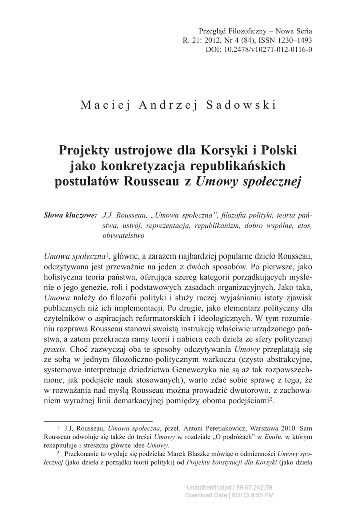 Przegląd Filozoficzny – Nowa Seria R. 21: 2012, Nr 4 (84), ISSN 1230–1493 DOI: 10.2478/v10271-012-0116-0 Maciej Andrzej Sadowski Projekty ustrojowe dla Korsyki i Polski jako konkretyzacja republikańskich postulatów Rousseau z Umowy społecznej Słowa kluczowe: J.J. Rousseau, „Umowa społeczna”, filozofia polityki, teoria państwa, ustrój, reprezentacja, republikanizm, dobro wspólne, etos, obywatelstwo Umowa społeczna1, główne, a zarazem najbardziej popularne dzieło Rousseau, odczytywana jest przeważnie na jeden z dwóch sposobów. Po pierwsze, jako holistyczna teoria państwa, oferująca szereg kategorii porządkujących myślenie o jego genezie, roli i podstawowych zasadach organizacyjnych. Jako taka, Umowa należy do filozofii polityki i służy raczej wyjaśnianiu istoty zjawisk publicznych niż ich implementacji. Po drugie, jako elementarz polityczny dla czytelników o aspiracjach reformatorskich i ideologicznych. W tym rozumieniu rozprawa Rousseau stanowi swoistą instrukcję właściwie urządzonego państwa, a zatem przekracza ramy teorii i nabiera cech dzieła ze sfery politycznej praxis. Choć zazwyczaj oba te sposoby odczytywania Umowy przeplatają się ze sobą w jednym filozoficzno-politycznym warkoczu (czysto abstrakcyjne, systemowe interpretacje dziedzictwa Genewczyka nie są aż tak rozpowszechnione, jak podejście nauk stosowanych), warto zdać sobie sprawę z tego, że w rozważania nad myślą Rousseau można prowadzić dwutorowo, z zachowaniem wyraźnej linii demarkacyjnej pomiędzy oboma podejściami2. 1 J.J. Rousseau, Umowa społeczna, przeł. Antoni Peretiakowicz, Warszawa 2010. Sam Rousseau odwołuje się także do treści Umowy w rozdziale „O podróżach” w Emilu, w którym rekapituluje i streszcza główne idee Umowy. 2 Przekonanie to wydaje się podzielać Marek Blaszke mówiąc o odmienności Umowy społecznej (jako dzieła z porządku teorii polityki) od Projektu konstytucji dla Korsyki (jako dzieła Unauthenticated | 89.67.242.59 Download Date | 6/2/13 8:55 PM 282 Maciej Andrzej Sadowski Potrzeba odczytywania Umowy w kontekście praktycznym nie powinna dziwić. Dzieło dostarcza systematycznego uzasadnienia dla nabierających rozpędu w epoce Oświecenia ruchów emancypacyjnych, antymonarchicznych i republikańskich. Skojarzenie z samym autorem, już za życia cieszącym się znaczną rozpoznawalnością i estymą, nadawało tym nurtom splendoru i powagi w sporach intelektualnym trzech ostatnich stuleci. Kariera tego wyjątkowego traktatu spowodowała, że w obiegu akademickim pojawiło się wiele często sprzecznych ze sobą interpretacji przedstawionych w nim abstrakcyjnych konstrukcji. Różne rozumienia podstawowych kategorii prowadziły do jeszcze bardziej odległych od siebie wniosków. Szansą na rozwiązanie przynajmniej niektórych wątpliwości interpretacyjnych może okazać się analiza dwóch politycznych traktatów mistrza, Projektu konstytucji dla Korsyki i Uwag nad rządem Polski3. Przypuszczalnie taka analiza, biorąc za swój przedmiot konkretne rozwiązania ze sfery praktyki politycznej, pozwoli spojrzeć z innej strony na główne figury teoretyczne Umowy społecznej. Takie zadanie może wydać się ważne temu czytelnikowi, który uważa, że filozofowie (a nawet jeśli nie oni, to tezy będące efektem ich namysłu) mają zobowiązania społeczne. Że (w szczególności) argumentacje przez nich przedstawiane i wnioski na ich podstawie wywiedzione nie powinny być pozostawione same sobie, lecz służyć społeczeństwu w budowie lepszego ładu. Przychylnym takiej analizie może być również czytelnik, który nie podziela tego zdania, ale z innych powodów pasjonuje się wpływem myśli politycznej Oświecenia na ewolucję instytucji politycznych. Z pewnością zaś zbadanie projektów reformatorskich filozofa może wydać się wartościowe każdemu, kto mimo lektury Umowy społecznej nadal nie może w pełni uchwycić stanowiska Jana Jakuba na państwo. Niewykluczone, że przedstawicieli trzeciej grupy będzie najwięcej. W realizacji tego zadania posłużymy się prostą metodą: najpierw wskażemy te idee Jana Jakuba pochodzące z Umowy społecznej, które wydają się węzłowe dla republikanizmu. Następnie odnajdziemy uszczegółowienie tych idei we wspomnianych pismach politycznych Rousseau, żeby – w ostatnim kroku – móc ocenić, czy zostały one przez autora podtrzymane, w większym lub mniejszym stopniu skorygowane, czy też zupełnie odrzucone. Naszym celem jest więc w po pierwsze selekcja spośród całokształtu idei politycznych Rousseau idei republikańskich. Utrwaliło się przekonanie, że Umowa społeczna jest źródłem nie tylko postulatów republikańskich, ale także demokratyczdoktrynalnego), por. M. Blaszke, Projekt konstytucji dla Korsyki J.J. Rousseau – aktualizacja idei w dobie Rewolucji Francuskiej, Zamość 2005, s. 57, 61. 3 J.J. Rousseau, Projekt konstytucji dla Korsyki, przeł. Marek Blaszke, Warszawa 2009; Uwagi nad rządem Polski, przeł. Maciej Starzewski, Kraków 1924. Unauthenticated | 89.67.242.59 Download Date | 6/2/13 8:55 PM Projekty ustrojowe dla Korsyki i Polski… 283 nych, a nawet socjalistycznych4. Choć zaproponowana metoda pozwoliłaby – jak sądzę – przyjrzeć się, w jaki sposób rozwinięciu ulegają pozarepublikańskie elementy teorii Genewczyka, jest rzeczą wyboru pozostawienie ich na marginesie niniejszych rozważań. Zawężając w ten sposób obszar rozważań, nie opowiadam się w żadnym stopniu za którąkolwiek ze stron w dyskusji, do której nowożytnej ideologii filozofii Rousseau jest najbliżej, albo który nurt najchętniej odwoływał się do jego dorobku. Wracając do samej metody, możliwe jest wskazanie przynajmniej dwóch słabych jej punktów. Po pierwsze – ktoś mógłby powiedzieć – Umowa społeczna jest konstrukcją ściśle abstrakcyjną i jako takiej nie można jej na drodze prostego odniesienia wcielić w życie. Projekt 