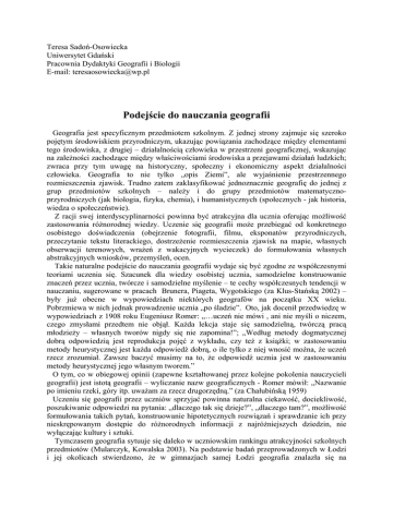 Teresa Sadoń-Osowiecka Uniwersytet Gdański Pracownia Dydaktyki Geografii i Biologii E-mail: [email protected] Podejście do nauczania geografii Geografia jest specyficznym przedmiotem szkolnym. Z jednej strony zajmuje się szeroko pojętym środowiskiem przyrodniczym, ukazując powiązania zachodzące między elementami tego środowiska, z drugiej – działalnością człowieka w przestrzeni geograficznej, wskazując na zależności zachodzące między właściwościami środowiska a przejawami działań ludzkich; zwraca przy tym uwagę na historyczny, społeczny i ekonomiczny aspekt działalności człowieka. Geografia to nie tylko „opis Ziemi”, ale wyjaśnienie przestrzennego rozmieszczenia zjawisk. Trudno zatem zaklasyfikować jednoznacznie geografię do jednej z grup przedmiotów szkolnych – należy i do grupy przedmiotów matematycznoprzyrodniczych (jak biologia, fizyka, chemia), i humanistycznych (społecznych - jak historia, wiedza o społeczeństwie). Z racji swej interdyscyplinarności powinna być atrakcyjna dla ucznia oferując możliwość zastosowania różnorodnej wiedzy. Uczenie się geografii może przebiegać od konkretnego osobistego doświadczenia (obejrzenie fotografii, filmu, eksponatów przyrodniczych, przeczytanie tekstu literackiego, dostrzeżenie rozmieszczenia zjawisk na mapie, własnych obserwacji terenowych, wrażeń z wakacyjnych wycieczek) do formułowania własnych abstrakcyjnych wniosków, przemyśleń, ocen. Takie naturalne podejście do nauczania geografii wydaje się być zgodne ze współczesnymi teoriami uczenia się. Szacunek dla wiedzy osobistej ucznia, samodzielne konstruowanie znaczeń przez ucznia, twórcze i samodzielne myślenie – te cechy współczesnych tendencji w nauczaniu, sugerowane w pracach Brunera, Piageta, Wygotskiego (za Klus-Stańską 2002) – były już obecne w wypowiedziach niektórych geografów na początku XX wieku. Pobrzmiewa w nich jednak prowadzenie ucznia „po śladzie”. Oto, jak docenił przedwiedzę w wypowiedziach z 1908 roku Eugeniusz Romer: „…uczeń nie mówi , ani nie myśli o niczem, czego zmysłami przedtem nie objął. Każda lekcja staje się samodzielną, twórczą pracą młodzieży – własnych tworów nigdy się nie zapomina!”; „Według metody dogmatycznej dobrą odpowiedzią jest reprodukcja pojęć z wykładu, czy też z książki; w zastosowaniu metody heurystycznej jest każda odpowiedź dobrą, o ile tylko z niej wnosić można, że uczeń rzecz zrozumiał. Zawsze baczyć musimy na to, że odpowiedź ucznia jest w zastosowaniu metody heurystycznej jego własnym tworem.” O tym, co w obiegowej opinii (zapewne kształtowanej przez kolejne pokolenia nauczycieli geografii) jest istotą geografii – wyliczanie nazw geograficznych - Romer mówił: „Nazwanie po imieniu rzeki, góry itp. uważam za rzecz drugorzędną.” (za Chałubińską 1959) Uczeniu się geografii przez uczniów sprzyjać powinna naturalna ciekawość, dociekliwość, poszukiwanie odpowiedzi na pytania: „dlaczego tak się dzieje?”, „dlaczego tam?”, możliwość formułowania takich pytań, konstruowanie hipotetycznych rozwiązań i sprawdzanie ich przy nieskrępowanym dostępie do różnorodnych informacji z najróżniejszych dziedzin, nie wyłączając kultury i sztuki. Tymczasem geografia sytuuje się daleko w uczniowskim rankingu atrakcyjności szkolnych przedmiotów (Mularczyk, Kowalska 2003). Na podstawie badań przeprowadzonych w Łodzi i jej okolicach stwierdzono, że w gimnazjach samej Łodzi geografia znalazła się na trzynastym miejscu w grupie czternastu przedmiotów, a biorąc pod uwagę gimnazja z mniejszych miast i ze wsi – na dziesiątym miejscu. Powstała zatem sprzeczność między głównym celem edukacyjnym nauczania geografii – „rozbudzaniem zainteresowania szeroko rozumianą przestrzenią geograficzną (…) oraz przygotowaniem do swobodnego poruszania się w niej”(Podstawa programowa kształcenia ogólnego) a rzeczywistym zainteresowaniem uczniów geografią jako przedmiotem szkolnym. Szukając przyczyn takiego stanu rzeczy zanalizowałam funkcjonującą Podstawę programową kształcenia ogólnego, programy wykorzystywane przez nauczycieli, poradniki metodyczne i podręczniki dydaktyki geografii. Podstawa programowa kształcenia ogólnego Podstawa programowa sugeruje aktywne nauczanie geografii, podkreślając rolę własnych obserwacji terenowych, nakładając zadanie stworzenia przez szkołę warunków do „korzystania z możliwie różnorodnych źródeł informacji.” Układ treści jest spójny i logiczny. Podejście od przyczyn do skutków (od miejsca Ziemi we Wszechświecie poprzez środowisko przyrodnicze, wynikające z usytuowania naszej planety do przejawów działalności człowieka w środowisku i przemian gospodarczych, społecznych, kulturowych i politycznych) sprzyjać powinno problemowym metodom nauczania. Duży stopień uogólnienia pozwala na różnorodną interpretację i praktycznie nieograniczony wybór zjawisk występujących we współczesnym świecie. Wykaz osiągnięć ucznia wskazuje, że uczeń będzie umiał zastosować wiedzę geograficzną w życiu, będzie także i po zakończeniu nauki potrafił wyszukiwać informacje oraz będzie pojmował Ziemię jako system powiązań, przewidując skutki zmian w przyrodzie i w otoczeniu społecznym. Będzie postrzegać środowisko społeczno – przyrodnicze jako układ dynamiczny, podlegający ciągłym zmianom w czasie i przestrzeni. A umiejętność korzystania z różnych źródeł informacji i oceny ich rzetelności uodporni na demagogiczne hasła. Takie ujęcie Podstawy programowej powinno, przynajmniej teoretycznie, zapobiegać autorytaryzmowi dydaktycznemu i sprzyjać wykorzystywaniu wiedzy osobistej ucznia. Programy nauczania geografii. O ile Podstawa nie ujmuje szczegółowo treści kształcenia, pozwalając na dowolność ich interpretacji, w konkretnych programach nauczania treści ujęte są