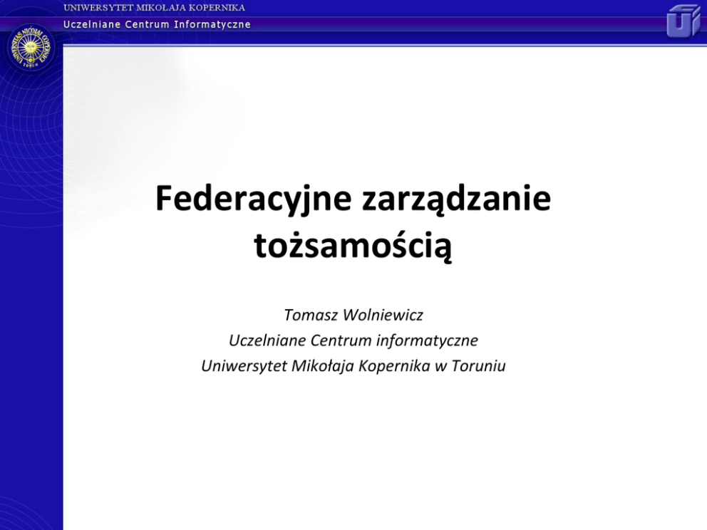 Federacyjne zarządzanie tożsamością Tomasz Wolniewicz Uczelniane Centrum informatyczne Uniwersytet Mikołaja Kopernika w Toruniu Korzystanie z usług zewnętrznych (typowy scenariusz) • czasopisma elektroniczne – kontrola dostępu po IP – rozszerzenia poprzez proxy lub VPN • wirtualne organizacje (np. projekty badawcze) – dedykowane systemy kont • mobilnośd studentów (proces bolooski) – koniecznośd tworzenia kont dla studentów obcych • wspólne platformy e-learningowe – ??? Warszawa, 8.07.2009, Workshop MUCI , "Zarządzanie tożsamością" Problemy modelu tradycyjnego • Czasopisma elektroniczne – skomplikowane administrowanie • koniecznośd określania zakresu uprawnionych IP) – trudny dostęp spoza uczelni • wymaga proxy lub VPN-a • zaburza zbieranie statystyk – brak możliwości tworzenia specyficznych licencji • np. dostępnośd pewnych funkcji tylko dla określonej grupy osób) • Wirtualne organizacje – utrudnione zarządzanie uprawnieniami • na ogół wymaga przepływu informacji poza systemem – koniecznośd tworzenia systemów kont – przetwarzanie danych osobowych • Mobilnośd studentów i platformy e-learningowe – koniecznośd przekazywania dokumentów • instytucja macierzysta deleguje studenta – koniecznośd tworzenia kont • student musi mied konto (w celu uwierzytelnienia, dostępu do Internetu – np. w DS.) Warszawa, 8.07.2009, Workshop MUCI , "Zarządzanie tożsamością" Model dostępu do usługi poprzez zdalne uwierzytelnianie i autoryzację • Usługodawca (Service Provider) – dysponent zasobu np. portalu WWW • Instytucja uwierzytelniająca (Identity Provider) – instytucja, która „zna” użytkownika i może za niego ręczyd, może nadawad uprawnienia • Model korzystania z usługi – – – – – użytkownik – mam uprawnienie do zasobu i chcę z niego skorzystad usługodawca – kto może to potwierdzid? użytkownik – potwierdzid może moja instytucja X usługodawca – zaloguj się w swojej instytucji, a ona wyśle potwierdzenie inst. uwierz. – potwierdzam poprawnośd tożsamości i przekazuję identyfikator użytkownika (12cb23a8901287daf) – usługodawca – czy użytkownik 12cb23a8901287daf to pracownik, czy student? – inst. uwierz. - student – usługodawca – otwiera dostęp do usługi Warszawa, 8.07.2009, Workshop MUCI , "Zarządzanie tożsamością" Wszystkie problemy rozwiązane !!! • Czasopisma elektroniczne – – – – – • logowanie poprzez własną instytucję dostęp z dowolnego miejsca możliwośd tworzenia własnego profilu anonimowośd względem usługodawcy możliwośd ograniczania usługi ze względu na grupę użytkowników Wirtualne organizacje – logowanie poprzez własną instytucję – możliwośd zarządzania uprawnieniami poprzez instytucję własną (ale zarządzenie na poziomie WO jest nadal możliwe) – możliwośd uniknięcia przetwarzania danych osobowych przez WO • Mobilnośd studentów i platformy e-learningowe – brak konieczności tworzenia kont na potrzeby uwierzytelnienia – możliwośd zautomatyzowania procesu kierowania studenta do innej uczelni – możliwośd automatyzacji procesu przekazywania dokumentacji Warszawa, 8.07.2009, Workshop MUCI , "Zarządzanie tożsamością" No, może niezupełnie…. • Wiarygodnośd instytucji uwierzytelniającej – usługodawca musi mied pewnośd, że otrzymał potwierdzenie od instytucji, z którą podpisał umowę • Ochrona danych użytkownika – instytucja uwierzytelniająca nie może przekazad danych na temat użytkownika każdemu, kto o nie poprosi – użytkownik powinien mied świadomośd jakie dane są komu przekazywane – identyfikator użytkownika nie powinien zdradzad jego tożsamości i nie powinien się powtarzad przy dostępie do różnych usługodawców • Wspólny język – protokół – uzgodnienie atrybutów i ich znaczenia Warszawa, 8.07.2009, Workshop MUCI , "Zarządzanie tożsamością" Federacja • Umowa instytucji w sprawie stosowania wspólnych standardów – protokół komunikacyjny – atrybuty i ich znaczenie – wiarygodnośd • Udzielenie delegacji w sprawie uzgodnieo technicznych z usługodawcami – federacja przedstawia założenia techniczne i formalne – federacja może negocjowad warunki finansowe, ale nie jest to niezbędne (może byd poza obszarem działania federacji) • Prowadzenie katalogu instytucji uwierzytelniających i zaufanych usługodawców (metadane) Warszawa, 8.07.2009, Workshop MUCI , "Zarządzanie tożsamością" Korzyści z udziału w federacji • Uproszczenie procedur zawierania umów z usługodawcami • Możliwośd stosowania systemów Single-Sign-On w odniesieniu do wielu usługodawców • Możliwośd tworzenia wspólnych systemów informatycznych Warszawa, 8.07.2009, Workshop MUCI , "Zarządzanie tożsamością" Mobilnośd studenta (model przykładowej implementacji) • Uczelnia macierzysta X deleguje studenta do uczelni Y – w USOS wpisywane są niezbędne dane • okres na jaki student jest delegowany • parametry uczelni Y • wymagania • Student pojawia się w uczelni Y – loguje się do systemu uczelni Y wskazując, ze pochodzi z uczelni X – system Y prosi X o potwierdzenie delegacji i okresu ważności – po potwierdzeniu, zakładane jest konto lokalne, działające w oparciu o uwierzytelnienie w uczelni macierzystej – student może korzystad z niektórych uwierzytelnionych systemów w Y • dostęp do sieci • biblioteka • czasopisma elektroniczne • Dziekanat Y – ma już w swoim systemie podstawowe dane studenta – pobiera z X niezbędne dane dodatkowe – ustawia parametry przypisania do własnego toku studiów Warszawa, 8.07.2009, Workshop MUCI , "Zarządzanie tożsamością" eduroam jako przykład federacji • • eduroam pozwala na wzajemne umożliwianie dostępu do sieci pracownikom i studentom instytucja macierzysta „odpowiada” za swojego pracownika, studenta – odnotowywane są uwierzy