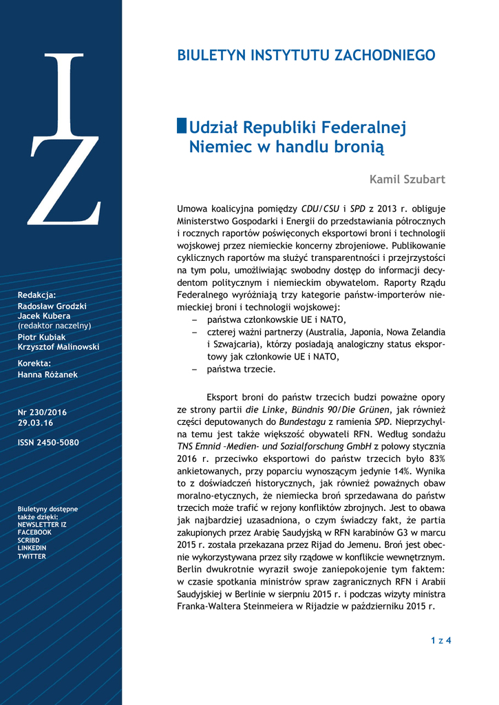 BIULETYN INSTYTUTU ZACHODNIEGO Udział Republiki Federalnej Niemiec w handlu bronią Kamil Szubart Redakcja: Radosław Grodzki Jacek Kubera (redaktor naczelny) Piotr Kubiak Krzysztof Malinowski Korekta: Hanna Różanek Nr 230/2016 29.03.16 ISSN 2450-5080 Biuletyny dostępne także dzięki: NEWSLETTER IZ FACEBOOK SCRIBD LINKEDIN TWITTER Umowa koalicyjna pomiędzy CDU/CSU i SPD z 2013 r. obliguje Ministerstwo Gospodarki i Energii do przedstawiania półrocznych i rocznych raportów poświęconych eksportowi broni i technologii wojskowej przez niemieckie koncerny zbrojeniowe. Publikowanie cyklicznych raportów ma służyć transparentności i przejrzystości na tym polu, umożliwiając swobodny dostęp do informacji decydentom politycznym i niemieckim obywatelom. Raporty Rządu Federalnego wyróżniają trzy kategorie państw-importerów niemieckiej broni i technologii wojskowej: – państwa członkowskie UE i NATO, – czterej ważni partnerzy (Australia, Japonia, Nowa Zelandia i Szwajcaria), którzy posiadają analogiczny status eksportowy jak członkowie UE i NATO, – państwa trzecie. Eksport broni do państw trzecich budzi poważne opory ze strony partii die Linke, Bündnis 90/Die Grünen, jak również części deputowanych do Bundestagu z ramienia SPD. Nieprzychylna temu jest także większość obywateli RFN. Według sondażu TNS Emnid –Medien- und Sozialforschung GmbH z połowy stycznia 2016 r. przeciwko eksportowi do państw trzecich było 83% ankietowanych, przy poparciu wynoszącym jedynie 14%. Wynika to z doświadczeń historycznych, jak również poważnych obaw moralno-etycznych, że niemiecka broń sprzedawana do państw trzecich może trafić w rejony konfliktów zbrojnych. Jest to obawa jak najbardziej uzasadniona, o czym świadczy fakt, że partia zakupionych przez Arabię Saudyjską w RFN karabinów G3 w marcu 2015 r. została przekazana przez Rijad do Jemenu. Broń jest obecnie wykorzystywana przez siły rządowe w konflikcie wewnętrznym. Berlin dwukrotnie wyraził swoje zaniepokojenie tym faktem: w czasie spotkania ministrów spraw zagranicznych RFN i Arabii Saudyjskiej w Berlinie w sierpniu 2015 r. i podczas wizyty ministra Franka-Waltera Steinmeiera w Rijadzie w październiku 2015 r. 1z4 Wartość niemieckiego eksportu i kluczowe kierunki sprzedaży W dniu 19 lutego 2016 r. wicekanclerz i minister gospodarki Sigmar Gabriel przedstawił wstępne dane o eksporcie produktów niemieckiego przemysłu obronnego w 2015 r. Była to zapowiedź kompleksowego raportu rocznego, który zostanie opublikowany na przełomie II i III kwartału 2016 r. Niemiecki udział w handlu bronią w ujęciu globalnym przedstawiono również w raporcie SIPRI za lata 2011-2015, opublikowanym 22 lutego 2016 r. Według danych SIPRI liderami pozostają USA z 33% i Federacja Rosyjska z 25% udziałem w rynku. Na dalszych miejscach znalazły się: ChRL (5,9%), Francja (5,6%) i RFN (4,7%). Choć RFN uplasowała się dopiero na 5. miejscu w zestawieniu, to miniony rok był rekordowy pod względem przychodów niemieckich koncernów, które uzyskały z eksportu broni i technologii wojskowej 7,86 mld euro. Z kolei w 2014 r. uzyskano jedynie 3,97 mld euro, co było najniższą kwotą od 2007 r., kiedy to przychód wyniósł 3,67 mld euro. Niemiecka broń i technologia wojskowa w 2015 r. zostały wyeksportowane do 57 państw. Do największych odbiorców niemieckiego uzbrojenia wśród państw UE i NATO należały: Wielka Brytania, USA i Francja. Z kolei najwięksi odbiorcy wśród państw trzecich to: Katar, Korea Płd., Izrael, Arabia Saudyjska, Algieria, Indie i Kuwejt. Największym kontraktem zbrojeniowym była dostawa przez Krauss-Maffei Wegmann GmbH 62 czołgów Leopard 2 A7+ i 24 haubic samobieżnych PzH 2000 do Kataru o wartość 1,67 mld euro. Drugim najwyższym kontraktem była sprzedaż 4 powietrznych tankowców Airbus A330 MRTT do Wielkiej Brytanii za kwotę 1,161 mld euro. Z kolei do Korei Południowej niemiecko-szwedzki koncern TAURUS Systems GmbH sprzedał pociski manewrujące typu powietrze-ziemia KEPD 350 do myśliwców F-15K za kwotę 500 mln euro. Izrael otrzymał ukończony przez ThyssenKrupp Marine Systems GmbH okręt podwodny typu Dolphin II, który wszedł do służby jako INS Rahav. Wartość transakcji to 375 mln euro, z czego 1/3 została sfinansowana przez Berlin. Pomimo że 51,5% eksportu niemieckiej broni i technologii wojskowej trafiło do państw członkowskich UE, NATO oraz czterech ważnych partnerów (Australia, Japonia, Nowa Zelandia i Szwajcaria), to jednak systematycznie rośnie rola importerów wśród państw trzecich. Jest to konsekwencja niskich wydatków na cele obronne europejskich członków NATO, co wpływa na poszukiwanie nowych rynków zbytu przez niemieckie koncerny. Szczególna uwaga niemieckiej branży zbrojeniowej jest skupiona na państwach Bliskiego Wschodu i Azji Południowo-Wschodniej, które systematycznie zwiększają swoje wydatki na cele militarne. Należy zatem oczekiwać, że wielkość eksportu niemieckiego uzbrojenia i technologii wojskowej do państw trzecich w najbliższych latach będzie systematycznie rosnąć pomimo deklarowanych przez SPD w kampanii wyborczej do Bundestagu w 2013 r. działań na rzecz jego zmniejszenia. Były to jednak zabiegi obliczone na pozyskanie części elektoratu tradycyjnie głosującego na die Linke i Bündnis 90/Die Grünen. Głównymi odbiorcami niemieckiego uzbrojenia pozostaną kraje Bliskiego Wschodu z Katarem i Arabią Saudyjską na czele, które wyrażają dalsze zainteresowanie zakupami broni pancernej i artyleryjskiej: czołgi Leopard 2 A7+ i haubice PzH 2000. Kluczowym impulsem do kontynuowania zakupów niemieckiego uzbrojenia będą 2z4 działania Iranu skoncentrowane na wzmocnieniu swojej pozycji w regionie jako efekt zniesienia międzynarodowych sankcji. Intensyfikacja takich działań przez Teheran może skutkować kolejnym wyścigiem zbrojeń w regionie. Na rynku europejskim kluczowym graczem będz