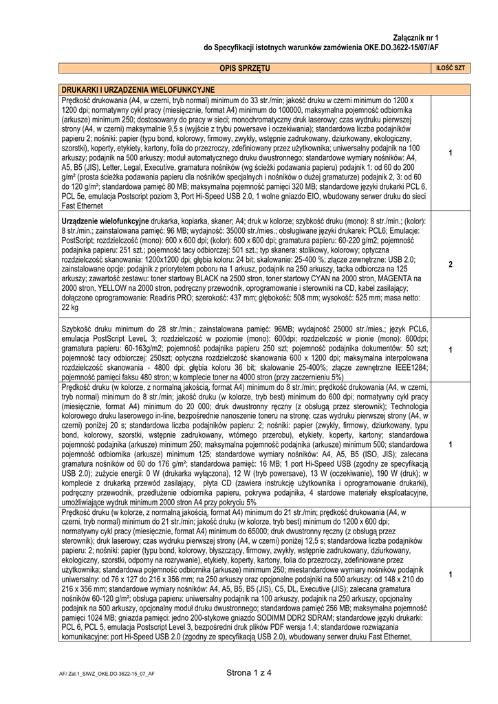 Załącznik nr 1 do Specyfikacji istotnych warunków zamówienia OKE.DO.3622-15/07/AF OPIS SPRZĘTU DRUKARKI I URZĄDZENIA WIELOFUNKCYJNE Prędkość drukowania (A4, w czerni, tryb normal) minimum do 33 str./min; jakość druku w czerni minimum do 1200 x 1200 dpi; normatywny cykl pracy (miesięcznie, format A4) minimum do 100000, maksymalna pojemność odbiornika (arkusze) minimum 250; dostosowany do pracy w sieci; monochromatyczny druk laserowy; czas wydruku pierwszej strony (A4, w czerni) maksymalnie 9,5 s (wyjście z trybu powersave i oczekiwania); standardowa liczba podajników papieru 2; nośniki: papier (typu bond, kolorowy, firmowy, zwykły, wstępnie zadrukowany, dziurkowany, ekologiczny, szorstki), koperty, etykiety, kartony, folia do przezroczy, zdefiniowany przez użytkownika; uniwersalny podajnik na 100 arkuszy; podajnik na 500 arkuszy; moduł automatycznego druku dwustronnego; standardowe wymiary nośników: A4, A5, B5 (JIS), Letter, Legal, Executive, gramatura nośników (wg ścieżki podawania papieru) podajnik 1: od 60 do 200 g/m² (prosta ścieżka podawania papieru dla nośników specjalnych i nośników o dużej gramaturze) podajnik 2, 3: od 60 do 120 g/m²; standardowa pamięć 80 MB; maksymalna pojemność pamięci 320 MB; standardowe języki drukarki PCL 6, PCL 5e, emulacja Postscript poziom 3, Port Hi-Speed USB 2.0, 1 wolne gniazdo EIO, wbudowany serwer druku do sieci Fast Ethernet Urządzenie wielofunkcyjne drukarka, kopiarka, skaner; A4; druk w kolorze; szybkość druku (mono): 8 str./min.; (kolor): 8 str./min.; zainstalowana pamięć: 96 MB; wydajność: 35000 str./mies.; obsługiwane języki drukarek: PCL6; Emulacje: PostScript; rozdzielczość (mono): 600 x 600 dpi; (kolor): 600 x 600 dpi; gramatura papieru: 60-220 g/m2; pojemność podajnika papieru: 251 szt.; pojemność tacy odbiorczej: 501 szt.; typ skanera: stolikowy, kolorowy; optyczna rozdzielczość skanowania: 1200x1200 dpi; głębia koloru: 24 bit; skalowanie: 25-400 %; złącze zewnętrzne: USB 2.0; zainstalowane opcje: podajnik z priorytetem poboru na 1 arkusz, podajnik na 250 arkuszy, tacka odbiorcza na 125 arkuszy; zawartość zestawu: toner startowy BLACK na 2500 stron, toner startowy CYAN na 2000 stron, MAGENTA na 2000 stron, YELLOW na 2000 stron, podręczny przewodnik, oprogramowanie i sterowniki na CD, kabel zasilający; dołączone oprogramowanie: Readiris PRO; szerokość: 437 mm; głębokość: 508 mm; wysokość: 525 mm; masa netto: 22 kg Szybkość druku minimum do 28 str./min.; zainstalowana pamięć: 96MB; wydajność 25000 str./mies.; język PCL6, emulacja PostScript LeveL 3; rozdzielczość w poziomie (mono): 600dpi; rozdzielczość w pionie (mono): 600dpi; gramatura papieru: 60-163g/m2; pojemność podajnika papieru 250 szt; pojemność podajnika dokumentów: 50 szt; pojemność tacy odbiorczej: 250szt; optyczna rozdzielczość skanowania 600 x 1200 dpi; maksymalna interpolowana rozdzielczość skanowania - 4800 dpi; głębia koloru 36 bit; skalowanie 25-400%; złącze zewnętrzne IEEE1284; pojemność pamięci faksu 480 stron; w komplecie toner na 4000 stron (przy zaczernieniu 5%) Prędkość druku (w kolorze, z normalną jakością, format A4) minimum do 8 str./min; prędkość drukowania (A4, w czerni, tryb normal) minimum do 8 str./min; jakość druku (w kolorze, tryb best) minimum do 600 dpi; normatywny cykl pracy (miesięcznie, format A4) minimum do 20 000; druk dwustronny ręczny (z obsługą przez sterownik); Technologia kolorowego druku laserowego in-line, bezpośrednie nanoszenie toneru na stronę; czas wydruku pierwszej strony (A4, w czerni) poniżej 20 s; standardowa liczba podajników papieru: 2; nośniki: papier (zwykły, firmowy, dziurkowany, typu bond, kolorowy, szorstki, wstępnie zadrukowany, wtórnego przerobu), etykiety, koperty, kartony; standardowa pojemność podajnika (arkusze) minimum 250; maksymalna pojemność podajnika (arkusze) minimum 500; standardowa pojemność odbiornika (arkusze) minimum 125; standardowe wymiary nośników: A4, A5, B5 (ISO, JIS); zalecana gramatura nośników od 60 do 176 g/m²; standardowa pamięć: 16 MB; 1 port Hi-Speed USB (zgodny ze specyfikacją USB 2.0); zużycie energii: 0 W (drukarka wyłączona), 12 W (tryb powersave), 13 W (oczekiwanie), 190 W (druk); w komplecie z drukarką przewód zasilający, płyta CD (zawiera instrukcję użytkownika i oprogramowanie drukarki), podręczny przewodnik, przedłużenie odbiornika papieru, pokrywa podajnika, 4 stardowe materiały eksploatacyjne, umożliwiające wydruk minimum 2000 stron A4 przy pokryciu 5% Prędkość druku (w kolorze, z normalną jakością, format A4) minimum do 21 str./min; prędkość drukowania (A4, w czerni, tryb normal) minimum do 21 str./min; jakość druku (w kolorze, tryb best) minimum do 1200 x 600 dpi; normatywny cykl pracy (miesięcznie, format A4) minimum do 65000; druk dwustronny ręczny (z obsługą przez sterownik); druk laserowy; czas wydruku pierwszej strony (A4, w czerni) poniżej 12,5 s; standardowa liczba podajników papieru: 2; nośniki: papier (typu bond, kolorowy, błyszczący, firmowy, zwykły, wstępnie zadrukowany, dziurkowany, ekologiczny, szorstki, odporny na rozrywanie), etykiety, koperty, kartony, folia do przezroczy, zdefiniowane przez użytkownika; standardowa pojemność odbiornika (arkusze) minimum 250; miestandardowe wymiary nośników podajnik uniwersalny: od 76 x 127 do 216 x 356 mm; na 250 arkuszy oraz opcjonalne podajniki na 500 arkuszy: od 148 x 210 do 216 x 356 mm; standardowe wymiary nośników: A4, A5, B5, B5 (JIS), C5, DL, Executive (JIS); zalecana gramatura nośników 60-120 g/m²; obsługa papieru: uniwersalny podajnik na 100 arkuszy, podajnik na 250 arkuszy, opcjonalny podajnik na 500 arkuszy, opcjonalny moduł druku dwustronnego; standardowa pamięć 256 MB; maksymalna pojemność pamięci 1024 MB; gniazda pamięci: jedno 200-stykowe gniazdo SODIMM DDR2 SDRAM; standardowe języki drukarki: PCL 6, PCL 5, emulacja Postscrip