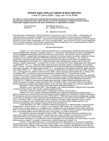 WYROK SĄDU APELACYJNEGO W BIAŁYMSTOKU z dnia 27 marca 2008 r. Sygn. akt I A Ca 55/08 Art. 228 ust. 4 prawa własności przemysłowej przewiduje domniemanie prawne prawdziwości powszechnej znajomości treści opinii. Zarzut, że ochrona wynikająca z zarejestrowanych znaków towarowych wygasła powinien być zatem podniesiony w odpowiedzi na pozew. Przewodniczący Sędziowie : : SSA Elżbieta Borowska SA Jadwiga Chojnowska (spr.) : SA Magdalena Pankowiec Sąd Apelacyjny w Białymstoku I Wydział Cywilny po rozpoznaniu w dniu 13 marca 2008 r. w Białymstoku na rozprawie sprawy z powództwa "Gaspol" S.A. w W. przeciwko Stanisławowi S. prowadzącemu działalność gospodarczą pod firmą PHU „ALKAST” o zaniechanie naruszeń prawa do znaków towarowych na skutek apelacji powódki od wyroku Sądu Okręgowego w B. z dnia 10 grudnia 2007 r. sygn. akt VII GC 101/07 uchyla zaskarżony wyrok i sprawę przekazuje do ponownego rozpoznania Sądowi Okręgowemu w B., pozostawiając temu Sądowi rozstrzygnięcie o kosztach postępowania odwoławczego. UZASADNIENIE „Gaspol” S.A. w W. wniosła o nakazanie Stanisławowi S. prowadzącemu działalność gospodarczą pod firmą Przedsiębiorstwo Handlowo -Usługowe „Alkast" w J. zaniechania wprowadzania do obrotu w jakiejkolwiek formie prawnej jedenastokilogramowych butli stalowych na gaz płynny, oznaczonych znakami towarowymi: słownym GASPOL, zestawieniem kolorystycznym: niebieski z czerwonym pasem lub samym niebieskim kolorem na płaszczu butli, znakiem graficznym PRIMAGAZ (dwuczęściowy biały rzut sześcianu - tzw. logotyp A), napełnionych uprzednio gazem płynnym propan-butanem lub pochodnymi mieszaninami z propanem przez innego przedsiębiorcę niż „Gaspol” S.A., nakazanie trzykrotnego opublikowania na jego koszt w dzienniku lokalnym „Gazeta Współczesna", nie dalej niż na 3 stronie, w formacie 20% strony następującej treści ogłoszenia: „Ja Stanisław S. zam. w J., właściciel zakładu dystrybucji gazu płynnego „Alkast", oświadczam, że od kwietnia 2005 r. do dnia... (wydania wyroku lub innej ustalonej daty) na terenie województwa podlaskiego wbrew dobrym zwyczajom kupieckim - bez zgody spółki „Gaspol" S.A. - sprzedawałem butle gazowe napełnione gazem płynnym przez spółki „Barter" S.A. i „J&S Energy" S.A. oznaczone zarejestrowanym znakiem towarowym spółki „Gaspol" S.A., co jest sprzeczne z ustawą z dnia 30 czerwca 2000 r. prawo własności przemysłowej oraz z ustawą z dnia 16 kwietnia 1993 r. o zwalczaniu nieuczciwej konkurencji. Przepraszam P.T. Konsumentów za takie wprowadzenie w błąd, co do pochodzenia towaru." W uzasadnieniu żądania podała, że pozwany, jako pośrednik hurtowy, co najmniej od kwietnia 2005 r. bezprawnie wprowadza do obrotu detalicznego gaz płynny propan-butan w butlach oznaczonych znakami towarowymi, na które powodowa Spółka uzyskała świadectwa ochronne nr 77939, 96174 i 118900 dla oznaczenia sprzedaży gazu płynnego w butlach jedenastokilogramowych oraz zawarła ze spółką „Primagaz" umowę licencyjną z dnia 10 kwietnia 1995 r. na używanie znaku towarowego w formie graficznej dwuczęściowego białego (logotyp A) lub czerwono-niebieskiego rzutu sześcianu (logotyp B). Stanisław S. wniósł o odrzucenie pozwu ewentualnie oddalenie powództwa. (...) Wyrokiem z dnia 10 grudnia 2007 r. Sąd Okręgowy w B. oddalił powództwo i nakazał zwrócić powódce ze Skarbu Państwa kwotę 100 zł tytułem niewykorzystanej zaliczki. Powyższe orzeczenie zostało oparte o następujące ustalenia i ocenę prawną. „Gaspol” S.A. w W. prowadzi działalność gospodarczą w zakresie sprzedaży gazu propan-butan w butlach oznaczonych znakami towarowymi kolorystyczno-słowno-graficznymi. Uzyskała w Urzędzie Patentowym RP świadectwa ochronne oznaczone numerami 77939, 96174 i 118900 dotyczące kolorów niebieskiego, białego i czerwonego na butlach gazowych stalowych jedenastokilogramowych oraz nazwy słownej GASPOL. Zawarła też w dniu 10 kwietnia 1995 r. z Compagnie Des Gaz De Petrole „Primagaz” Spółką Akcyjną w Paryżu umowę licencyjną na używanie znaku towarowego w formie graficznej dwuczęściowego białego (logotyp A) lub czerwono-niebieskiego rzutu sześcianu (logotyp B) na okres dziesięciu lat. Z kolei Stanisław S. od 1995 r. prowadzi działalność gospodarczą w zakresie handlu i dystrybucji gazu. Współpracuje z firmami „Barter" z B. i „Progaz" z M. (wcześniej „J&S Energy" z M.), od których kupuje gaz propan-butan w butlach stalowych 11-kilogramowych i następnie gaz ten sprzedaje klientom, którzy przynoszą butle na wymianę. Wśród butli są także butle oznaczone kolorami i znakiem słownym powódki. Pozwanego nie łączy z powodową Spółką umowa dystrybucji gazu i korzystania z jej znaków towarowych. Prowadzone przeciwko pozwanemu w latach 1999 - 2005 dochodzenia dotyczące posługiwania się przez niego znakami towarowymi powódki, zostały umorzone, wobec ustalenia, że zarzucane mu czyny nie zawierały znamion czynu zabronionego, a te który trafiły do rozpoznania przez Sądy zakończyły się uniewinnieniem Stanisława S. od popełnienia czynów polegających na wprowadzeniu do obrotu towaru w postaci butli gazowych o wadze 11 kg każda z zastrzeżonym znakiem towarowym „Gaspol” S.A. W 2005 r. Prokuratura Rejonowa w Ł. prowadziła przeciwko Stanisławowi S. dochodzenie dotyczące wprowadzenia przez niego do obrotu w dniu 24 czerwca 2005 r. w Ł. 97 pełnych butli gazowych z podrobionym znakiem towarowym powódki i uczynienia sobie z tego stałego źródła dochodu, wprowadzania przez niego do obrotu w dniu 24 czerwca 2005 r. w J. 396 pełnych butli gazowych z podrobionym znakiem towarowym powódki i uczynienia sobie z tego stałego źródła dochodu oraz utrudniania w okresie od 24 czerwca do 6 września 2005 r. w Ł. postępowania karnego poprzez usunięcie zabezpieczonych w toku przeszukania w dniu 24 czerwca 2005 r