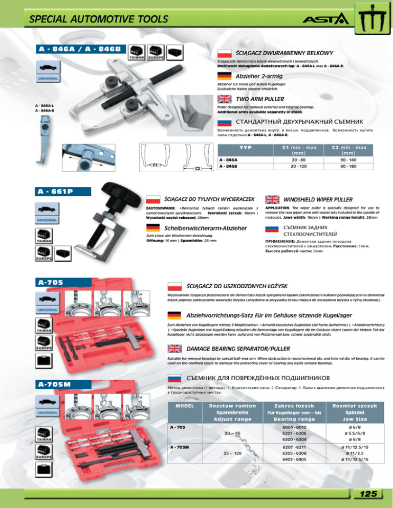 SPECIAL AUTOMOTIVE TOOLS A - 846A / A - 846B ŚCIĄGACZ DWURAMIENNY BELKOWY Ściągaczdo demontażu łożysk wewnętrznych i zewnętrznych. Możliwość dokupienia dodatkowych łap: A - 846A-L oraz A - 846A-R. Abzieher 2-armig Abzieher für Innen und Außen Kugellager. Zusätzliche Haken separat erhältlich. TWO ARM PULLER A - 846A-L A - 846A-R Puller designed for removal external and internal bearings. Additional arms available separatly in stock. СТАНДАРТНЫЙ ДВУХРЫЧАЖНЫЙ СЪЕМНИК Возможность демонтажа внутр. и внешн. подшипников. Возможность купить лапы отдельно:A - 846A-L, A - 846A-R. TYP C1 C2 C1 min - max (mm) C2 min - max (mm) A - 846A 20 - 80 90 - 140 A - 846B 20 - 120 90 - 180 A - 437B 661P ŚCIĄGACZ DO TYLNYCH WYCIERACZEK ZASTOSOWANIE: •Demontaż tylnych ramion wycieraczek z zamontowanymi spryskiwaczami. Szerokość szczęk: 16mm | Wysokość części roboczej: 28mm Scheibenwischerarm-Abzieher Zum Lösen der Wischerarm-Verzahnung. Öffnung: 16 mm | Spannhöhe: 28 mm A-705 WINDSHIELD WIPER PULLER APPLICATION: The wiper puller is specially designed for use to remove the rear wiper arms with water jets included in the spindle of motocars. Jaws width: 16mm | Working range height: 28mm СЪЁМНИК ЗАДНИХ СТЕКЛООЧИСТИТЕЛЕЙ ПРИМЕНЕНИЕ: Демонтаж задних поводков стеклоочистителей с омывателем. Расстояние: 16мм. Высота рабочей части: 28мм ŚCIĄGACZ DO USZKODZONYCH ŁOŻYSK Wyposażenie ściągacza przeznaczone do demontażu łożysk specjalnymi łapami zakończonymi kulkami pozwalającymi na demontaż łożysk poprzez zakleszczenie wewnątrz łożyska (przydatne w przypadku braku miejsca do zaczepienia łożyska o tylną obudowę). Abziehvorrichtungs-Satz für im Gehäuse sitzende Kugellager Zum Abziehen von Kugellagern mittels 3 Möglichkeiten: •Anhand klassischer Zugbolzen (einfache Aufnahme) | •Abziehvorrichtung | •Spezielle Zugbolzen mit Kugel-Endung erlauben die Demontage von Kugellagern die im Gehäuse sitzen (wenn der hintere Teil der Kugellager nicht abgezogen werden kann, aufgrund von Platzmangel bzw. schwer zugänglich sind). DAMAGE BEARING SEPARATOR/PULLER Suitable for removal bearings by special ball- end arm. When obstruction is round external dia. and internal dia. of bearing, it can be used on the confined space to damage the protecting cover of bearing and easily remove bearings. A-705M СЪЕМНИК ДЛЯ ПОВРЕЖДЁННЫХ ПОДШИПНИКОВ Метод демонтажа (3 методы) : 1. Классические лапы. 2. Сепаратор. 3. Лапы с шапиком-демонтаж подшипников в труднодоступных местах. MODEL Rozstaw ramion Spannbreite Adjust range Für Kugellager von – bis Bearing range Rozmiar szczęk Spindel Jaw Size 20 ~ 95 6004 - 6010 6201 - 6206 6300 - 6304 ø 6/8 ø 5.5/6/8 ø 6/8 35 ~ 120 6207 -6211 6305 - 6308 6403 - 6405 ø 11/12.5/15 ø 11/2.5 ø 11/12.5/15 A - 705 A - 705M Zakres łożysk 125 NARZĘDZIA SPECJALISTYCZNE AH - EK 1208A / AH - EK 1208B ŚCIĄGACZ ZE SPRĘŻYNĄ POWROTNĄ PULLER WITH RETURN SPRING Abzieher mit Haltefeder СЪЕМНИК 2-Х ЛАПЫЙАВТОМАТИЧЕСКИЙ ЗАЖИМ C P (mm) (mm) AH - EK 1208A 0 - 35 40 AH - EK 1208B 0 - 45 60 TYP C P A - 446A-80/150/200 P AH - EK 1213/1214/1215 T C ŚCIĄGACZE Z 2 ŁAPAMI CIENKIMI - KOMPAKT Kompakter Abzieher 2-armig mit Haltefeder C ZASTOSOWANIE: •Do ściągania zacisków z czopów biegunowych akumulatora. Ściągacz z samonastawnymi łapami - sprężyna nastawna. Kompakter Abzieher 3-armig mit Haltefeder Mit schlanken Abzughaken für die Demontage von Batterieklemmen. Mit schlanken Abzughaken für die Demontage von Batterieklemmen. PULLER WITH 2 THIN CLAWS – COMPACT PULLER WITH THREE THIN CLAWS – COMPACT APPLICATION: •Puller with self-adjustable claws designed for removal external bearingsadjustable spring. СЪЕМНИК 2-Х ЛАПЫЙ С ТОНКИМИ ЗАХВАТАМИ-КОМПАКТНОЙ ПРИМЕНЕНИЕ: Возможность демонтажа внутр. подшипников. 6kątne (mm) T ŚCIĄGACZE Z 3 ŁAPAMI CIENKIMI - KOMPAKT ZASTOSOWANIE: •Ściągacz z samonastawnymi łapami do łożysk zewnętrznych- sprężyna nastawna. TYP P C P (mm) (mm) MASA (kg) A-446A-80 10 80 90 0.60 A-446A-150 10 150 160 0.65 A-446A-200 13 200 220 0.90 APPLICATION: •For removal of connectors from battery terminals - adjustable spring СЪЕМНИК 3-Х ЛАПЫЙ С ТОНКИМИ ЗАХВАТАМИ-КОМПАКТНОЙ ПРИМЕНЕНИЕ: Съемник клеммы аккумулятора с 3 захватами. TYP Ø (mm) 6 kątne (mm) C P (mm) (mm) T T max użytkowa (kN) (kN) MASA (kg) AH - EK 1213 12 10 80 90 15 11 0.65 AH - EK 1214 12 10 150 150 15 11 0.67 AH - EK 1215 10 13 200 200 24 17 1.5 A - 9000/9005/9015 ODKLEJACZ DO ŁOŻYSK ZASTOSOWANIE: •Do ściągania łożysk w miejscach gdzie łapy ściągacza mają ograniczony dostęp np. skrzynie biegów, czopy wałków. Lagertrennvorrichtung Bei der Demontage von Kugellager. Das Spannen der Lagertrennvorrichtung erfolgt durch gleichmäßiges Anziehen der Muttern auf den Seitenbolzen. BEARING REMOVER APPLICATION: •For removal of bearings in places presenting limited access to the puller. TYP A - 9000 D min - max (mm) 30 - 50 A - 9005 50 - 75 A - 9015 75 - 105 126 СЕПАРАТОР ПРИМЕНЕНИЕ: Для отделения и съема шариковых и роликовых подшипников, втулок, колес и других плотно посаженных деталей, которых не возможно снять с ромощью съемника. SPECIAL AUTOMOTIVE TOOLS AH - EF 2129 ŚCIĄGACZ z 3 KRÓTKIMI ŁAPAMI •Śruba bezpieczeństwa z ogranicznikiem momentu: ścinanie koł