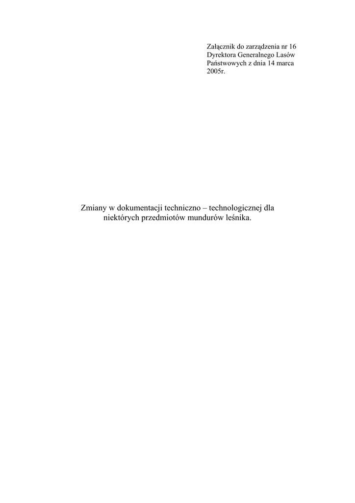 Załącznik do zarządzenia nr 16 Dyrektora Generalnego Lasów Państwowych z dnia 14 marca 2005r. Zmiany w dokumentacji techniczno – technologicznej dla niektórych przedmiotów mundurów leśnika. 1. Mundur wyjściowy męski leśnika – dodać: Dopuszcza się szycie munduru przy zachowaniu zgodności ze wzorcem z tkaniny o parametrach: - kolor oliwkowo-zielony wg zatwierdzonego wzoru - surowiec – 44 % wełna, 54 % poliester, 2 % lycra - masa powierzchniowa – 200 g/m2 ± 5 g/m2 - trwałość kolorów wg PN-ISO 105- nie mniej niż 4 stopnie - kurczliwość wg PN-EN 25077 do 2 % - wytrzymałość na rozciąganie wg PN-93/P-04968 w kierunku wzdłużnym min. 48,5 daN w kierunku poprzecznym min. 40 daN - odporność na piling wg PN-91/P-04619 min. 4 stopnie 2. Mundur wyjściowy damski leśnika – dodać: Dopuszcza się szycie munduru przy zachowaniu zgodności ze wzorcem z tkaniny o parametrach: - kolor oliwkowo-zielony wg zatwierdzonego wzoru - surowiec – 44 % wełna, 54 % poliester, 2 % lycra - masa powierzchniowa – 200 g/m2 ± 5 g/m2 - trwałość kolorów wg PN-ISO 105- nie mniej niż 4 stopnie - kurczliwość wg PN-EN 25077 do 2 % - wytrzymałość na rozciąganie wg PN-93/P-04968 w kierunku wzdłużnym min. 48,5 daN w kierunku poprzecznym min. 40 daN - odporność na piling wg PN-91/P-04619 min. 4 stopnie 3. Krawat do munduru wyjściowego i codziennego zmienić: a/ strona tytułowa - jest: krawat gładki - winno być: krawat gładki lub splot fantazyjny apretura BO b/ strona 5 a - jest: krawat gładki – splot satyna - winno być: krawat gładki lub splot fantazyjny c/ strona 5 b pkt 3.1. - jest: typ wykończenia – naturalny - winno być: typ wykończenia – naturalny lub apretura BO 4. Szalik – dodać nowy opis o treści: Szalik wykonany z tkaniny łatwo wracającej do pierwotnego wyglądu po zgnieceniach lub zmoknięciu, o wysokim stopniu odporności na piling. Kolor zielony nieco ciemniejszy od płaszcza, w tej samej tonacji co kapelusz. Wymiar: 140 cm x 25 cm Tkanina zasadnicza: - kolor zielony wg zatwierdzonego wzoru - surowiec – 65 % wełna, 15 % kaszmir, 20 % nylon - masa powierzchniowa – 390 g/m2 ±16 g/m2 - trwałość kolorów wg PN-ISO 105- nie mniej niż 3 stopnie - kurczliwość po praniu w 40 oC wg PN-EN 25077 od 3 do 4 % - wytrzymałość na rozciąganie wg PN-93/P-04968 min. 18 daN w obu kierunkach 5. Półbuty do munduru wyjściowego – dodać nowy opis o treści: Opis Obuwie męskie wykonane całkowicie ze skór naturalnych w kolorze brązowym. Wierzchy skóra bydlęca gr. 1,4 – 1,6 mm. Podeszwy poliuretanowe, oczka do sznurowadeł po trzy pary na sztukę w postaci otworów lub z ciemnego mosiądzu. Sznurowadło brązowe o długości 80 cm. Części składowe: Wierzchy - wierzchy ze skóry bydlęcej Buffalo w kolorze brązowym o grubości 1,4-1,6 mm - podszewka z dwoiny świńskiej (welurowa międlona) w kolorze beżowym o grubości 0,8-0,9 mm lub sztucznej włókniny - podszewka przyszwy (wkład obuwiowy bawełniany CIS 45420/150/L40) w kolorze beżowym - wypełnienie obłożyny z pianki lateksowej bez kleju o grubości 5 mm - wypełnienie języka z pianki lateksowej bez kleju o grubości 5 mm - międzypodszewka z tkaniny z klejem - podnosek : tuflex Spody - podszewka poliuretanowa w kolorze brązowym - podpodeszwa z włókniny texon w kolorze beżowym - podkówka z włókniny texon o grubości 1,25 mm - zakładka ze sztucznej skóry (zakładkowa formowana) - wyściółka z dwoiny świńskiej w kolorze beżowym o grubości 0,8-0,9 mm - wypełnienie wyściółki : pianka lateksowa z klejem Materiały pomocnicze - wszywka wyściółki w kolorze beżowym - oczka do sznurowadeł z ciemnego mosiądzu – sztuk 6 - nici brązowe o grubości 0,4 mm - nici maszynowe brązowe o grubości 1,2 mm - sznurowadła w kolorze brązowym o grubości 7 mm Załącznik – zdjęcie półbuta i wzór skóry wierzchniej 6. Bluza z polaru do munduru codziennego – dodać nowy opis o treści: Opis ogólny Bluza zapinana na zamek błyskawiczny kostkowy. Na przodach odszyte trzy kieszenie w ramkach z tkaniny wodoodpornej oddychającej zamykane kostkowymi zamkami błyskawicznymi. Na karczki przodów i tyłu naszyte są łaty z tkaniny wodoodpornej, oddychającej. Rękawy jednoczęściowe w podwinięciu wszyta guma do ściągnięcia. Dół bluzy ściągnięty sznurkiem – gumą z możliwością regulacji obwodu stoperami dwufunkcyjnymi. Wykaz surowców użytych do produkcji bluzy: Dzianina odzieżowa antypilingowa typu polar - kolor wg zatwierdzonego wzoru - surowiec – 100 % poliester - masa powierzchniowa wg PN–P- 04613:1997 - 358 g/m2 ±10 g/m2 - rodzaj wykończenia prawej i lewej strony – welur - odporność wybarwień w praniu wg PN-ISO 105-C 6 min. 3 stopnie - opór na przenikanie ciepła wg EN 31092 – 160 Rct (10-3m2 K/W) - przepuszczalność pary wodnej wg EN 31092-15Ret (m2Pa/W) - kurczliwość wg PN-P-04797 max 5 % - wodoodporność wg ISO 4920 – min. 4 stopnie - przepuszczalność powietrza wg EN ISO 9237 800 l/m2.S - wytrzymałość na rozciąganie wg ISO 13983-2 - 200 kPa - odporność na piling wg PN-P-04663 min. 4 stopień Tkanina wodoodporna-oddychająca - kolor khaki wg wzoru - surowiec – 100 % poliester + laminat - laminat – wodoodporna membrana przepuszczająca parę wodną - masa powierzchniowa tkaniny zasadniczej – 150 g/m2 ± 10 g/m2 - trwałość kolorów wg PN-ISO 105 – nie mniej niż 3 stopnie - kurczliwość po praniu w 40 oC wg PN – EN 25077 – max 2 % w obu kierunkach - wytrzymałość na rozciąganie wg PN-93/P-04968 – min. 45 daN w obu kierunkach - wodoszczelność tkaniny zasadniczej wg PN-EN 20811, PN-ISO 811 przed użytkowaniem – min. 10000 mm po 10 praniach wg PN-EN 25077 min 10000 mm - opór przechodzenia pary wodnej wg PN-EN 31092, PN-ISO 11092-Ret (model skóra) < 14 m2 x Pa/w Dopuszcza się stosowanie dzianiny typu – co najmniej jak Polartec serii 300, artykuł 7330 w kolorze 37 E3. 7. Kurtka do munduru co