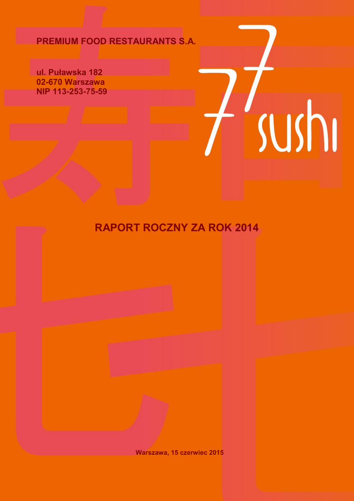RAPORT ROCZNY SPÓŁKI PREMIUM FOOD RESTAURANTS S.A. za rok zakończony 31 grudnia 2013 roku PREMIUM FOOD RESTAURANTS S.A. ul. Puławska 182 02-670 Warszawa NIP 113-253-75-59 RAPORT ROCZNY ZA ROK 2014 Warszawa, 15 czerwiec 2015 Bilans należy analizować łącznie z informacją dodatkową, maj 2014która rokustanowi integralną część sprawozdania finansowego ROCZNY RAPORT PREMIUM FOOD RESTAURANTS S.A. za rok zakończony 31 grudnia 2014 roku SPIS TREŚCI A. LIST PREZESA ZARZĄDU EMITENTA DO AKCJONARIUSZY ............................................................ 3 B. WYBRANE DANE FINANSOWE............................................................................................................. 4 C. SPRAWOZDANIE FINANSOWE............................................................................................................. 5 I. WPROWADZENIE DO SPRAWOZDANIA FINANSOWEGO .................................................................. 5 II BILANS .................................................................................................................................................. 12 III. RACHUNEK ZYSKÓW I STRAT (WARIANT PORÓWNAWCZY) ................................................................... 14 IV. ZESTAWIENIE ZMIAN W KAPITALE WŁASNYM ................................................................................. 15 V. RACHUNEK PRZEPŁYWÓW PIENIĘŻNYCH (METODA POŚREDNIA)...................................................... 16 VI. DODATKOWE INFORMACJE I OBIAŚNIENIA ...................................................................................... 17 D. SPRAWOZDANIE ZARZĄDU Z DZIAŁALNOŚCI SPÓŁKI ZA ROK 2014. .......................................... 31 E. RAPORT W PRZEDMIOCIE STOSOWANIA ZASAD ŁADU KORPORACYJNEGO ........................... 36 F. OŚWIADCZENIA ZARZĄDU EMITENTA.............................................................................................. 41 2 ROCZNY RAPORT PREMIUM FOOD RESTAURANTS S.A. za rok zakończony 31 grudnia 2014 roku A. LIST PREZESA ZARZĄDU EMITENTA DO AKCJONARIUSZY Szanowni Państwo! Przekazujemy Państwu raport roczny Premium Food Restaurants S.A. za rok 2014. Rok 2014 był kolejnym rokiem, który przyniósł zysk. Rentowność sprzedaży netto wyniosła 2,4% procent. Kuchnia japońska stała się bardzo popularna, klienci restauracji sushi w coraz większym stopniu przywiązują się do marki i w dużo większym stopniu, niż w latach ubiegłych, są w stanie ocenić jakość serwowanych potraw. W 2015 r. jak i w kolejnych latach, te dwa czynniki powinny pozytywnie wpłynąć na wyniki naszej Spółki. Podobnie jak w poprzednich trzech latach (2014, 2013 i 2012) będziemy dążyć do optymalizacji kosztowej, a także do zwiększenia udziału w rynku poprzez otwarcie nowych placówek. Dziękuję wszystkim pracownikom za zaangażowanie i dopinguję do dalszej ciężkiej pracy w budowaniu naszej firmy. Dziękuje akcjonariuszom, w tym mojemu mężowi, za dane mi zaufanie. Z poważaniem, Aleksandra Tymińska Prezes Zarządu 3 ROCZNY RAPORT PREMIUM FOOD RESTAURANTS S.A. za rok zakończony 31 grudnia 2014 roku B. WYBRANE DANE FINANSOWE Dane bilansowe przeliczono według średniego kursu ogłoszonego przez Prezesa NBP na dzień sporządzenia sprawozdania finansowego, który na dzień bilansowy wynosił: na dzień 31/12/2013- 4,1472 zł/ EUR, na dzień 31/12/2014- 4,2623 zł/ EUR. Dane rachunku zysków i strat oraz rachunku przepływów pieniężnych przeliczono na EURO według kursu ustalonego jako średnia arytmetyczna średnich kursów ogłaszanych przez Prezesa NBP na ostatni dzień każdego miesiąca roku: za rok 2013- 4,2110 zł/ EUR, za rok 2014- 4,1893 zł/ EUR RACHUNEK ZYSKÓW I STRAT Przychody netto ze sprzedaży 2014 zł 2013 zł EUR EUR 15 588 703 3 721 076 15 559 293 3 694 916 Zysk (strata) z działalności operacyjnej 544 469 129 967 401 989 95 462 Zysk (strata) brutto 527 010 125 799 455 228 108 104 Zysk (strata) netto 377 030 89 998 352 310 83 664 5 650 001 5 650 001 5 650 001 5 650 001 0,07 0,02 0,06 0,01 Liczba akcji (w tys. szt) Zysk (strata) na jedną akcję zwykłą RACHUNEK PRZEPŁYWÓW PIENIĘŻNYCH Przepływy pieniężne netto z działalności operacyjnej Przepływy pieniężne netto z działalności inwestycyjnej Przepływy pieniężne netto z działalności finansowej Przepływy pieniężne netto 2014 zł 2013 EUR zł 928 936 221 740 1 120 674 266 130 -1 088 922 -259 929 -1 343 051 -318 939 -21 831 -5 211 -11 032 -2 620 -181 817 -43 400 -233 409 -55 428 31.12.2014 Bilans EUR zł 31.12.2013 EUR zł EUR Aktywa trwałe 4 330 656 1 016 037 2 232 647 538 350 Aktywa obrotowe 1 224 677 287 328 2 927 292 705 848 Aktywa razem 5 555 333 1 303 365 5 159 939 1 244 198 Kapitał własny 2 184 383 512 489 1 807 353 435 801 565 000 132 558 565 000 136 236 3 370 950 790 876 3 352 586 808 398 48 836 11 458 1 013 457 244 371 Zobowiązania krótkoterminowe 3 306 243 775 695 2 324 129 560 409 Pasywa razem 5 555 333 1 303 365 5 159 939 1 244 198 Kapitał zakładowy Zobowiązania i rezerwy Zobowiazania długoterminowe i rezerwy 4 ROCZNY RAPORT PREMIUM FOOD RESTAURANTS S.A. za rok zakończony 31 grudnia 2014 roku C. SPRAWOZDANIE FINANSOWE I. WPROWADZENIE DO SPRAWOZDANIA FINANSOWEGO 1. Informacje ogólne a) Premium Food Restaurants SA powstała w wyniku przekształcenia Premium Food Restauracje Sp. z o.o. Przekształcenie to zostało zarejestrowane w dniu 1 kwietnia 2008 roku. Premium Food Restauracje Sp. z o.o. została utworzona aktem notarialnym z dnia 12 listopada 2003 r. nr Rep. A 9081/2003. Siedziba Spółki mieści się w Warszawie przy ulicy Puławskiej 182. Do października 2005 r. spółka nosiła nazwę Tsubame Dystrybucja Sp. z o.o. W dniu 07 października 2005 r., Nadzwyczajne Zgromadzenie Wspólników podjęło uchwałę w sprawie zmiany nazwy Spółki na „Premium Food Restauracje”. b) Spółka wpisana jest do Rejestru Przedsiębiorców prowadzonego przez Sąd Rejonowy dla Miasta Stołe