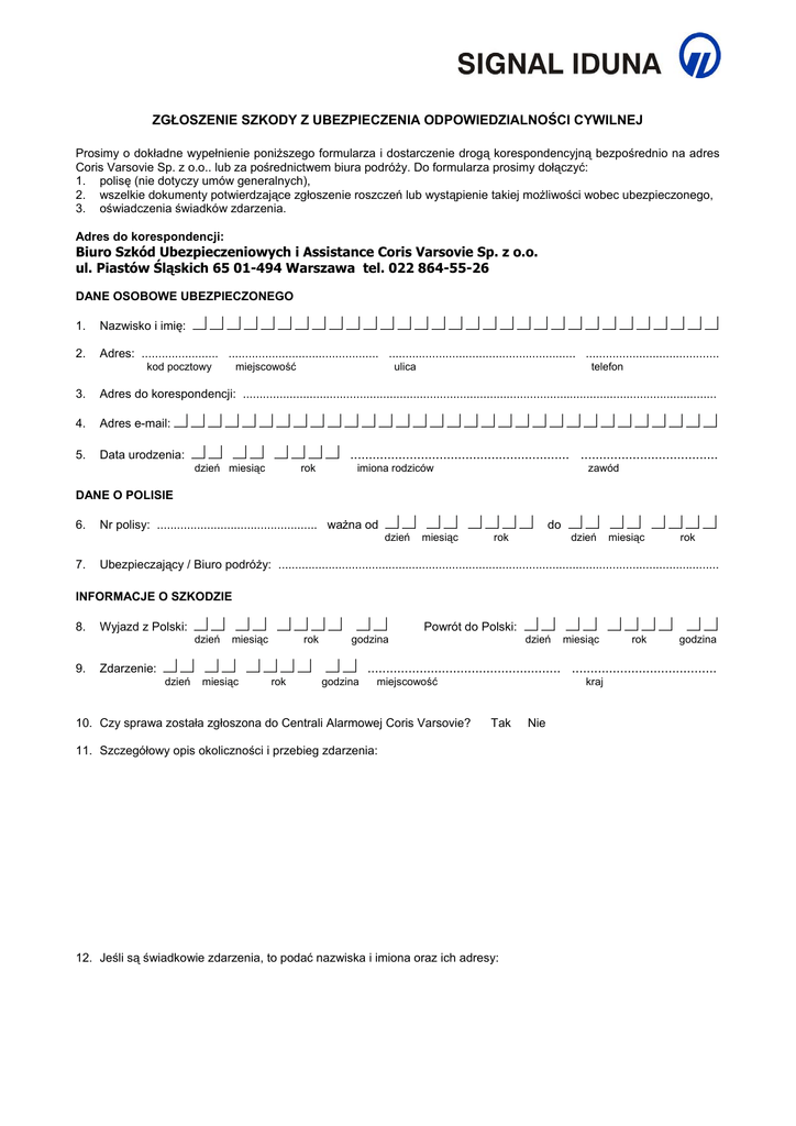 ZGŁOSZENIE SZKODY Z UBEZPIECZENIA ODPOWIEDZIALNOŚCI CYWILNEJ Prosimy o dokładne wypełnienie poniższego formularza i dostarczenie drogą korespondencyjną bezpośrednio na adres Coris Varsovie Sp. z o.o.. lub za pośrednictwem biura podróży. Do formularza prosimy dołączyć: 1. polisę (nie dotyczy umów generalnych), 2. wszelkie dokumenty potwierdzające zgłoszenie roszczeń lub wystąpienie takiej możliwości wobec ubezpieczonego, 3. oświadczenia świadków zdarzenia. Adres do korespondencji: Biuro Szkód Ubezpieczeniowych i Assistance Coris Varsovie Sp. z o.o. ul. Piastów Śląskich 65 01-494 Warszawa tel. 022 864-55-26 DANE OSOBOWE UBEZPIECZONEGO 1. Nazwisko i imię: d d d d d d d d d d d d d d d d d d d d d d d d d d d d d d d 2. Adres: ....................... ............................................. ........................................................ ........................................ kod pocztowy miejscowość ulica telefon 3. Adres do korespondencji: .............................................................................................................................................. 4. Adres e-mail: d d d d d d d d d d d d d d d d d d d d d d d d d d d d d d d d 5. Data urodzenia: d d d d d d d d ........................................................... ..................................... dzień miesiąc rok imiona rodziców zawód DANE O POLISIE 6. Nr polisy: ................................................ ważna od d d d d d d d d dzień 7. miesiąc rok do d d d d d d d d dzień miesiąc rok Ubezpieczający / Biuro podróży: .................................................................................................................................... INFORMACJE O SZKODZIE 8. Wyjazd z Polski: d d d d d d d d dzień 9. miesiąc rok Zdarzenie: d d d d d d d d dzień miesiąc rok dd godzina Powrót do Polski: d d d d d d d d dzień miesiąc rok dd godzina d d .................................................... ....................................... godzina miejscowość 10. Czy sprawa została zgłoszona do Centrali Alarmowej Coris Varsovie? kraj Tak 11. Szczegółowy opis okoliczności i przebieg zdarzenia: 12. Jeśli są świadkowie zdarzenia, to podać nazwiska i imiona oraz ich adresy: Nie 13. Czy wszczęto postępowanie karne i przeciw komu? 14. Podać imiona i nazwiska oraz adresy zamieszkania osób poszkodowanych w wyniku zdarzenia 15. Przybliżona wielkość strat 16. Czy posiada Pan / Pani inną polisę obejmującą ochroną ubezpieczeniową to zdarzenie? Tak Nie Jeśli tak, to prosimy podać: nazwę zakładu ubezpieczeń ....................................... nr polisy ...................................... OŚWIADCZENIE Oświadczam, że powyższe informacje zostały przeze mnie udzielone zgodnie z prawdą i według najlepszej wiedzy. FORMA WYPŁATY ODSZKODOWANIA Należne odszkodowanie należy przekazać złotowe konto bankowe nr: dd dddd dddd dddd dddd dddd dddd Nazwa i nr oddziału banku: .................................................................................................................................... Nazwisko i imię właściciela konta bankowego: ...................................................................................................... ................................................................. Data i podpis ubezpieczającego/ /pracownika biura podróży ................................................................ Data i podpis ubezpieczonego Warszawa dnia 08.04.2008 Szanowni Państwo, Z dniem 01 maja 2008 Signal Iduna wprowadza zmiany organizacyjne dotyczące sposobu likwidacji szkód . Signal Iduna na zasadach wyłączności powierza Coris Varsovie obsługę wszystkich świadczeń assistance oraz likwidację wszystkich szkód z umów ubezpieczeń turystycznych zawartych przez SIGNAL IDUNA Coris Varsovie będzie również odpowiedzialny za obsługę informacyjną dotyczącą szkód ( udzielanie informacji osobom uprawnionym w formie pisemnej , telefonicznej, elektronicznej lub bezpośredniej ). Do dyspozycji ubezpieczonych w SIGNAL IDUNA, oddana zostaje przez CORIS telefoniczna Centrala Alarmowa CORIS w Warszawie, działająca 24 godziny na dobę, przez siedem dni w tygodniu, obsługująca klientów w języku polskim, angielskim i francuskim. Operator Centrali Alarmowej pod numerem 0048 22-864-55-26 zgłasza się: „ Centrala Alarmowa SIGNAL IDUNA”. Pod numerem 0048 22-864-55-26 dla Signal Iduna dedykowano 10 linii telefonicznych Linia dedykowana specjalnie dla Egiptu: +48-22-568-98-26 Pozostałe numery telefonów Coris Varsovie : Tel ogólny +48-22-864-55-22 Fax.: +48-22-864-55-23 Nr. sms +48-508-399-440 Email: [email protected] Druki szkód i wszelkie dokumenty dotyczące odszkodowań Signal Iduna należy przesyłać na adres: Biuro Szkód Ubezpieczeniowych i Assistance Coris Varsovie Sp. z o.o. ul. Piastów Śląskich 65 01-494 Warszawa W związku ze zmianami organizacyjnymi zwracamy się do Państwa z prośbą o przekazywanie wszystkim klientom informacji o konieczności zgłaszania szkód bezpośrednio do Coris Varsovie. Informujemy również , że od dnia 01 maja 2008 na drukach Zgłoszenia Szkód Signal Iduna będzie wskazany adres Coris Varsovie jako Centrali przyjmującej wszystkie zgłoszenia szkód w zakresie ubezpieczeń turystycznych Korzystając z okazji życzymy Państwu udanego sezonu letniego 2008 Pozdrawiam serdecznie Katarzyna Szepczyńska Dyrektor Departamentu Ubezpieczeń Turystycznych 1