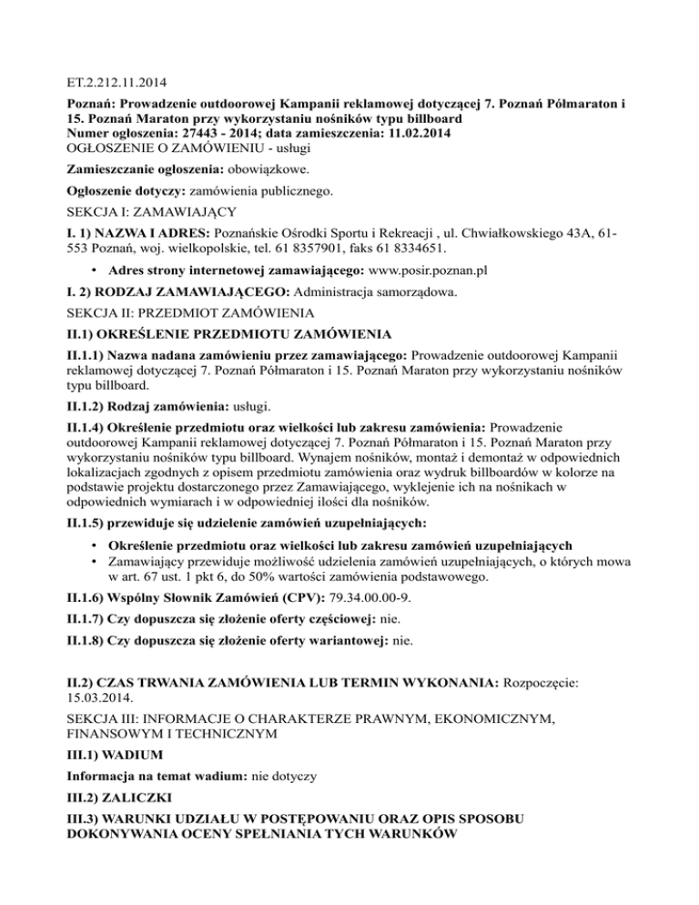 ET.2.212.11.2014 Poznań: Prowadzenie outdoorowej Kampanii reklamowej dotyczącej 7. Poznań Półmaraton i 15. Poznań Maraton przy wykorzystaniu nośników typu billboard Numer ogłoszenia: 27443 - 2014; data zamieszczenia: 11.02.2014 OGŁOSZENIE O ZAMÓWIENIU - usługi Zamieszczanie ogłoszenia: obowiązkowe. Ogłoszenie dotyczy: zamówienia publicznego. SEKCJA I: ZAMAWIAJĄCY I. 1) NAZWA I ADRES: Poznańskie Ośrodki Sportu i Rekreacji , ul. Chwiałkowskiego 43A, 61553 Poznań, woj. wielkopolskie, tel. 61 8357901, faks 61 8334651. • Adres strony internetowej zamawiającego: www.posir.poznan.pl I. 2) RODZAJ ZAMAWIAJĄCEGO: Administracja samorządowa. SEKCJA II: PRZEDMIOT ZAMÓWIENIA II.1) OKREŚLENIE PRZEDMIOTU ZAMÓWIENIA II.1.1) Nazwa nadana zamówieniu przez zamawiającego: Prowadzenie outdoorowej Kampanii reklamowej dotyczącej 7. Poznań Półmaraton i 15. Poznań Maraton przy wykorzystaniu nośników typu billboard. II.1.2) Rodzaj zamówienia: usługi. II.1.4) Określenie przedmiotu oraz wielkości lub zakresu zamówienia: Prowadzenie outdoorowej Kampanii reklamowej dotyczącej 7. Poznań Półmaraton i 15. Poznań Maraton przy wykorzystaniu nośników typu billboard. Wynajem nośników, montaż i demontaż w odpowiednich lokalizacjach zgodnych z opisem przedmiotu zamówienia oraz wydruk billboardów w kolorze na podstawie projektu dostarczonego przez Zamawiającego, wyklejenie ich na nośnikach w odpowiednich wymiarach i w odpowiedniej ilości dla nośników. II.1.5) przewiduje się udzielenie zamówień uzupełniających: • Określenie przedmiotu oraz wielkości lub zakresu zamówień uzupełniających • Zamawiający przewiduje możliwość udzielenia zamówień uzupełniających, o których mowa w art. 67 ust. 1 pkt 6, do 50% wartości zamówienia podstawowego. II.1.6) Wspólny Słownik Zamówień (CPV): 79.34.00.00-9. II.1.7) Czy dopuszcza się złożenie oferty częściowej: nie. II.1.8) Czy dopuszcza się złożenie oferty wariantowej: nie. II.2) CZAS TRWANIA ZAMÓWIENIA LUB TERMIN WYKONANIA: Rozpoczęcie: 15.03.2014. SEKCJA III: INFORMACJE O CHARAKTERZE PRAWNYM, EKONOMICZNYM, FINANSOWYM I TECHNICZNYM III.1) WADIUM Informacja na temat wadium: nie dotyczy III.2) ZALICZKI III.3) WARUNKI UDZIAŁU W POSTĘPOWANIU ORAZ OPIS SPOSOBU DOKONYWANIA OCENY SPEŁNIANIA TYCH WARUNKÓW • III. 3.1) Uprawnienia do wykonywania określonej działalności lub czynności, jeżeli przepisy prawa nakładają obowiązek ich posiadania Opis sposobu dokonywania oceny spełniania tego warunku • Zamawiający nie opisuje szczegółowo tego warunku • III.3.2) Wiedza i doświadczenie Opis sposobu dokonywania oceny spełniania tego warunku • Zamawiający nie opisuje szczegółowo tego warunku • III.3.3) Potencjał techniczny Opis sposobu dokonywania oceny spełniania tego warunku • Zamawiający nie opisuje szczegółowo tego warunku • III.3.4) Osoby zdolne do wykonania zamówienia Opis sposobu dokonywania oceny spełniania tego warunku • Zamawiający nie opisuje szczegółowo tego warunku • III.3.5) Sytuacja ekonomiczna i finansowa Opis sposobu dokonywania oceny spełniania tego warunku • Zamawiający nie opisuje szczegółowo tego warunku III.4) INFORMACJA O OŚWIADCZENIACH LUB DOKUMENTACH, JAKIE MAJĄ DOSTARCZYĆ WYKONAWCY W CELU POTWIERDZENIA SPEŁNIANIA WARUNKÓW UDZIAŁU W POSTĘPOWANIU ORAZ NIEPODLEGANIA WYKLUCZENIU NA PODSTAWIE ART. 24 UST. 1 USTAWY III.4.1) W zakresie wykazania spełniania przez wykonawcę warunków, o których mowa w art. 22 ust. 1 ustawy, oprócz oświadczenia o spełnianiu warunków udziału w postępowaniu należy przedłożyć: III.4.2) W zakresie potwierdzenia niepodlegania wykluczeniu na podstawie art. 24 ust. 1 ustawy, należy przedłożyć: • oświadczenie o braku podstaw do wykluczenia; • aktualny odpis z właściwego rejestru lub z centralnej ewidencji i informacji o działalności gospodarczej, jeżeli odrębne przepisy wymagają wpisu do rejestru lub ewidencji, w celu wykazania braku podstaw do wykluczenia w oparciu o art. 24 ust. 1 pkt 2 ustawy, wystawiony nie wcześniej niż 6 miesięcy przed upływem terminu składania wniosków o dopuszczenie do udziału w postępowaniu o udzielenie zamówienia albo składania ofert; III.4.3) Dokumenty podmiotów zagranicznych Jeżeli wykonawca ma siedzibę lub miejsce zamieszkania poza terytorium Rzeczypospolitej Polskiej, przedkłada: III.4.3.1) dokument wystawiony w kraju, w którym ma siedzibę lub miejsce zamieszkania potwierdzający, że: • nie otwarto jego likwidacji ani nie ogłoszono upadłości - wystawiony nie wcześniej niż 6 miesięcy przed upływem terminu składania wniosków o dopuszczenie do udziału w postępowaniu o udzielenie zamówienia albo składania ofert; III.4.4) Dokumenty dotyczące przynależności do tej samej grupy kapitałowej • lista podmiotów należących do tej samej grupy kapitałowej w rozumieniu ustawy z dnia 16 lutego 2007 r. o ochronie konkurencji i konsumentów albo informacji o tym, że nie należy do grupy kapitałowej; SEKCJA IV: PROCEDURA IV.1) TRYB UDZIELENIA ZAMÓWIENIA IV.1.1) Tryb udzielenia zamówienia: przetarg nieograniczony. IV.2) KRYTERIA OCENY OFERT IV.2.1) Kryteria oceny ofert: najniższa cena. IV.3) ZMIANA UMOWY przewiduje się istotne zmiany postanowień zawartej umowy w stosunku do treści oferty, na podstawie której dokonano wyboru wykonawcy: Dopuszczalne zmiany postanowień umowy oraz określenie warunków zmian Zamawiający przewiduje możliwość zmiany wynagrodzenia, o którym mowa w ust. 2 w przypadku zmiany stawki podatku VAT, na usługi będące przedmiotem niniejszej umowy, jeśli zmiana nastąpi w czasie trwania umowy. Zmiana stawek podatku VAT spowoduje zmianę kwot podatku VAT i ceny brutto wynikającej z umowy, cena netto pozostanie niezmienna IV.4) INFORMACJE ADMINISTRACYJNE IV.4.1) Adres strony internetowej, na której jest dostępna specyfikacja istotnych warunków zamówienia: www.posir.poznan.pl Specyfikację istotnych