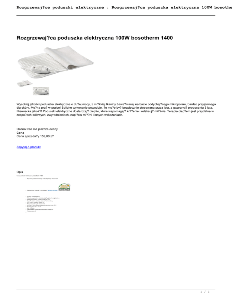 Rozgrzewaj?ce poduszki elektryczne : Rozgrzewaj?ca poduszka elektryczna 100W bosothe Rozgrzewaj?ca poduszka elektryczna 100W bosotherm 1400 Wysokiej jako?ci poduszka elektryczna o du?ej mocy, z mi?kkiej tkaniny bawe?nianej na bazie oddychaj?cego mikropolaru, bardzo przyjemnego dla skóry. Mo?na pra? w pralce! Solidne wykonanie powoduje, ?e mo?e by? bezpiecznie stosowana przez lata, z gwarancj? producenta 3 lata. Niemiecka jako??! Poduszki elektryczne dostarczaj? ciep?o, które wspomagaj? kr??enie i relaksuj? mi??nie. Terapia ciep?em jest przydatna w zespo?ach bólowych, zwyrodnieniach, napi?ciu mi??ni i innych wskazaniach. Ocena: Nie ma jeszcze oceny Cena Cena sprzeda?y 159,00 z? Zapytaj o produkt Opis Cechy poduszki elektrycznej bosotherm 1400: Wykonany z bawe?nianego oddychaj?cego mikropolaru "Bezpieczny" materia? z certfikatem Textiles Vertrauen Szybkie podgrzewanie Wbudowany system zabezpieczaj?cy przed przegrzaniem Automatyczny wy??cznik po max.90 min. 3 pod?wietlone zakresy ustawie? temperatury Od??czany przewód zasilaj?cy Pilot przewodowy do sterowania Mo?liwo?? prania w pralce automatycznej przy 40°C Wymiary max 33 x 44 cm Moc 100 Wat Zdejmowana dodatkowa poszewka z bawe?ny. 3 lata gwarancji 1 / 1 Powered by TCPDF (www.tcpdf.org)