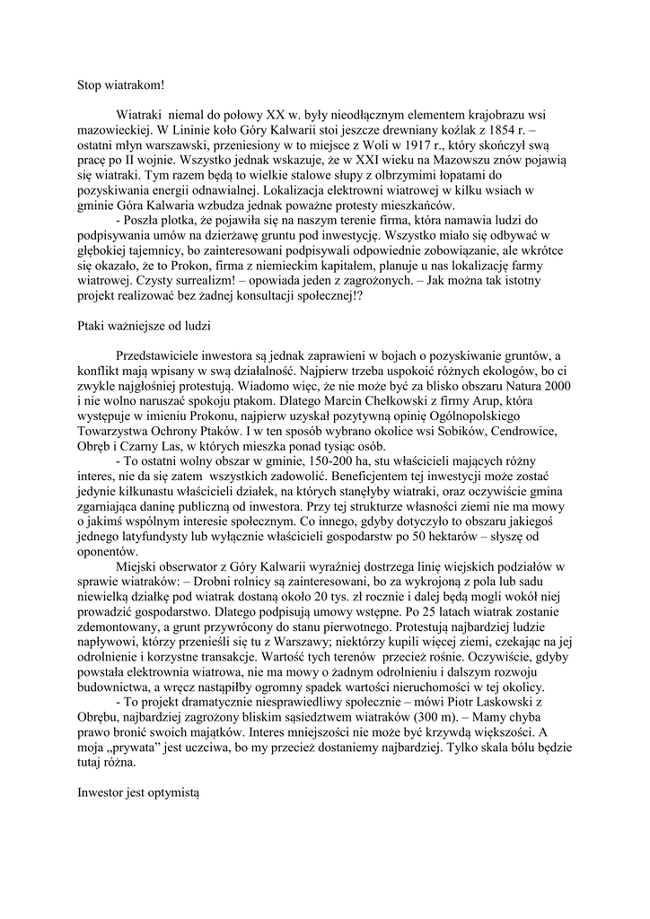 Stop wiatrakom! Wiatraki niemal do połowy XX w. były nieodłącznym elementem krajobrazu wsi mazowieckiej. W Lininie koło Góry Kalwarii stoi jeszcze drewniany koźlak z 1854 r. – ostatni młyn warszawski, przeniesiony w to miejsce z Woli w 1917 r., który skończył swą pracę po II wojnie. Wszystko jednak wskazuje, że w XXI wieku na Mazowszu znów pojawią się wiatraki. Tym razem będą to wielkie stalowe słupy z olbrzymimi łopatami do pozyskiwania energii odnawialnej. Lokalizacja elektrowni wiatrowej w kilku wsiach w gminie Góra Kalwaria wzbudza jednak poważne protesty mieszkańców. - Poszła plotka, że pojawiła się na naszym terenie firma, która namawia ludzi do podpisywania umów na dzierżawę gruntu pod inwestycję. Wszystko miało się odbywać w głębokiej tajemnicy, bo zainteresowani podpisywali odpowiednie zobowiązanie, ale wkrótce się okazało, że to Prokon, firma z niemieckim kapitałem, planuje u nas lokalizację farmy wiatrowej. Czysty surrealizm! – opowiada jeden z zagrożonych. – Jak można tak istotny projekt realizować bez żadnej konsultacji społecznej!? Ptaki ważniejsze od ludzi Przedstawiciele inwestora są jednak zaprawieni w bojach o pozyskiwanie gruntów, a konflikt mają wpisany w swą działalność. Najpierw trzeba uspokoić różnych ekologów, bo ci zwykle najgłośniej protestują. Wiadomo więc, że nie może być za blisko obszaru Natura 2000 i nie wolno naruszać spokoju ptakom. Dlatego Marcin Chełkowski z firmy Arup, która występuje w imieniu Prokonu, najpierw uzyskał pozytywną opinię Ogólnopolskiego Towarzystwa Ochrony Ptaków. I w ten sposób wybrano okolice wsi Sobików, Cendrowice, Obręb i Czarny Las, w których mieszka ponad tysiąc osób. - To ostatni wolny obszar w gminie, 150-200 ha, stu właścicieli mających różny interes, nie da się zatem wszystkich zadowolić. Beneficjentem tej inwestycji może zostać jedynie kilkunastu właścicieli działek, na których stanęłyby wiatraki, oraz oczywiście gmina zgarniająca daninę publiczną od inwestora. Przy tej strukturze własności ziemi nie ma mowy o jakimś wspólnym interesie społecznym. Co innego, gdyby dotyczyło to obszaru jakiegoś jednego latyfundysty lub wyłącznie właścicieli gospodarstw po 50 hektarów – słyszę od oponentów. Miejski obserwator z Góry Kalwarii wyraźniej dostrzega linię wiejskich podziałów w sprawie wiatraków: – Drobni rolnicy są zainteresowani, bo za wykrojoną z pola lub sadu niewielką działkę pod wiatrak dostaną około 20 tys. zł rocznie i dalej będą mogli wokół niej prowadzić gospodarstwo. Dlatego podpisują umowy wstępne. Po 25 latach wiatrak zostanie zdemontowany, a grunt przywrócony do stanu pierwotnego. Protestują najbardziej ludzie napływowi, którzy przenieśli się tu z Warszawy; niektórzy kupili więcej ziemi, czekając na jej odrolnienie i korzystne transakcje. Wartość tych terenów przecież rośnie. Oczywiście, gdyby powstała elektrownia wiatrowa, nie ma mowy o żadnym odrolnieniu i dalszym rozwoju budownictwa, a wręcz nastąpiłby ogromny spadek wartości nieruchomości w tej okolicy. - To projekt dramatycznie niesprawiedliwy społecznie – mówi Piotr Laskowski z Obrębu, najbardziej zagrożony bliskim sąsiedztwem wiatraków (300 m). – Mamy chyba prawo bronić swoich majątków. Interes mniejszości nie może być krzywdą większości. A moja „prywata” jest uczciwa, bo my przecież dostaniemy najbardziej. Tylko skala bólu będzie tutaj różna. Inwestor jest optymistą Laskowscy kupili tu w 2002 r. kilka hektarów, wystawili z dala od szosy chyba najokazalszy tutejszy dom i żyli jak u Pana Boga za piecem: mazowieckie wierzby, Lasy Chojnowskie (Park Krajobrazowy!), bażanty na polach, a stolica blisko, ale w odpowiedniej odległości. Niestety, wiatraki spowodowały, że teraz żyją jakby w zawieszeniu, a raczej w permanentnym zagrożeniu, bo nie wiadomo, czy wkrótce nie trzeba będzie się stąd wynieść. Mimo że obowiązujące obecnie studium uwarunkowania i kierunków zagospodarowania przestrzennego przewiduje zakaz sytuowania „uciążliwych i terenochłonnych obiektów produkcyjnych, rzemieślniczych, składowych i transportowych” m.in. we wsi Obręb. Przedstawiciele inwestora spotkali się wcześniej z burmistrz Góry Kalwarii Barbarą Samborską. „Powiedziałam, że jako samorząd nie mamy terenów, które moglibyśmy im udostępnić. Ale jeśli znajdą prywatne grunty, uzyskają pozwolenie na budowę, to niech wiatraki stawiają” – doniosły lokalne media. Z Prokonu dotarła po pewnym czasie informacja: „Dotychczasowe rozmowy z mieszkańcami gminy zainteresowanymi długoletnim wynajmem pod zabudowę siłowni pozwalają nam z optymizmem myśleć o dalszej współpracy”. Jako realny termin uruchomienia farmy wiatrowej podano lata 2011-2013. Artykuł w dwutygodniku „Nad Wisłą” wywołał poruszenie wśród sąsiadów projektowanej inwestycji; był też program w telewizji regionalnej. Jesienią ub. r. do szkoły w Cendrowicach na spotkanie w sprawie wiatraków przyszło około 200 osób. – Nie pamiętam takiej frekwencji na żadnym zebraniu wiejskim – mówi Joanna Laskowska. W rezultacie mieszkańcy czterech wsi zagrożonych lokalizacją elektrowni wiatrowej utworzyli Społeczny Komitet Protestacyjny. W spotkaniu wzięli udział burmistrz Barbara Samborska i wiceburmistrz Dariusz Zieliński. Wedle relacji w prasie lokalnej zgodnie stwierdzili, że w Obrębie czy Sobikowie żaden wiatrak nie stanie bez zgody samorządu, bo ani studium uwarunkowań i kierunków zagospodarowania przestrzennego gminy, ani plan zagospodarowania na to nie pozwalają. Wiceburmistrz Zieliński wręcz oświadczył, że jego zdaniem ta okolica absolutnie nie spełnia warunków dla farmy wiatrowej. Stanowisko pierwszej gospodyni gminy było mniej zdecydowane. „W obecnej sytuacji tylko nierozważny burmistrz sprzeciwiałby się takim inwestycjom, jeśli inwestoro