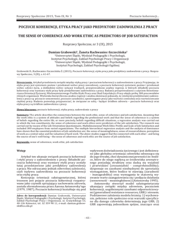 Rozprawy Społeczne 2015, Tom IX, Nr 3 Poczucie koherencji... POCZUCIE KOHERENCJI, ETYKA PRACY JAKO PREDYKTORY ZADOWOLENIA Z PRACY THE SENSE OF COHERENCE AND WORK ETHIC AS PREDICTORS OF JOB SATISFACTION Rozprawy Społeczne, nr 3 (IX), 2015 Damian Grabowski1, Żaneta Rachwaniec-Szczecińska2 Uniwersytet Śląski, Wydział Pedagogiki i Psychologii, Instytut Psychologii, Zakład Psychologii Pracy i Organizacji 2 Uniwersytet Śląski, Wydział Pedagogiki i Psychologii, Instytut Psychologii, Zakład Psychologii Ogólnej 1 Grabowski D., Rachwaniec-Szczecińska Ż. (2015), Poczucie koherencji, etyka pracy jako predyktory zadowolenia z pracy. Rozprawy Społeczne, 3 (IX), s. 61-67. Streszczenie. Artykuł przedstawia związki między etyką pracy i poczuciem koherencji a zadowoleniem z pracy. Przyjmując, że etyka pracy jest systemem postaw i przekonań wobec pracy zawodowej, a poczucie koherencji systemem postaw i przekonań wobec całości życia, a dokładniej wobec sytuacji trudnych, przeprowadzono analizy regresji, w których składniki poczucia koherencji oraz wymiary etyki pracy były predyktorami zadowolenia z pracy. Badania przeprowadzone z użyciem Kwestionariusza Orientacji Życiowej, Wielowymiarowego Pro�ilu Etyki Pracy oraz Skali Satysfakcji z Pracy objęły próbę 300 pracowników różnych organizacji. Wieloraka hierarchiczna analiza regresji i analiza dominacji pokazały, że istotnymi predyktorami zadowolenia z pracy są: poczucie sensowności, poczucie zaradności, spostrzeganie pracy jako wartości centralnej oraz wartościowanie ciężkiej pracy. Badania pozwalają przypuszczać, że związane ze sobą - będące źródłem zdrowia – poczucie koherencji oraz etyka pracy są źródłem zadowolenia z pracy. Słowa kluczowe: poczucie koherencji, etyka pracy, zadowolenie z pracy Summary: The article describes the connections between the work ethic, sense of coherence and job satisfaction. Assuming that the work ethic is a system of attitudes and beliefs regarding the professional work and that the sense of coherence is a system of beliefs regarding the entire life, or more precisely, beliefs regarding dif�icult situations, a regression analysis was carried out in which the two constituents; the sense of coherence and work ethics were predictors of the job satisfaction. The research was carried out by means of the Life Orientation Questionnaire, Multidimensional Work Ethic Pro�ile and Scale of Job Satisfaction and included 300 employees from varied organizations. The multiple hierarchical regression analysis and the analysis of dominance have shown that the essential predictors of job satisfaction are: the sense of meaningfulness, sense of resourcefulness, perception of work as a central value and the valuation of hard work. The above studies suggest that the connected with each other - and being the source of one’s well-being – the sense of coherence and work ethic are the source of job satisfaction. Keywords: sense of coherence, work ethic, job satisfaction Wstęp Artykuł ten ukazuje związek poczucia koherencji i etyki pracy z zadowoleniem z pracy. Składniki poczucia koherencji oraz wymiary etyki pracy zostały tutaj przedstawione jako predyktory zadowolenia z pracy. Nie odrzucamy jednak odwrotnej zależności, czyli wpływu zadowolenia na poczucie koherencji oraz etykę pracy. Koncepcja orientacji salutogenetycznej, której trzonem jest pojęcie poczucia koherencji rozpatrywane jako czynnik sprzyjający zachowaniu zdrowia, została sformułowana przez Aarona Antonovsky’ego (1979, 1987). Poczucie koherencji kształtuje się pod Adres do korespondencji: Damian Grabowski, Uniwersytet Śląski, Wydział Pedagogiki i Psychologii, Instytut Psychologii, Zakład Psychologii Pracy i Organizacji, ul. Grażyńskiego 53, 40-126 Katowice, tel. 32 359 98 11, e-mail: [email protected] wpływem doświadczenia życiowego i jest de�iniowane jako globalna orientacja człowieka odnosząca się do jego trwałej, choć dynamicznej pewności że: bodźce, które do niego napłyną ze środowiska zewnętrznego posiadają strukturę oraz dadzą się wyjaśnić i przewidzieć (zrozumiałość - comprehensibility); dysponuje on zasobami niezbędnymi do sprostania wymaganiom, które bodźce te stawiają (zaradność - manageability) oraz wymagania te stanowią wyzwanie warte zaangażowania się i podjęcia działania (sensowność - meaningfulness) (Antonovsky 1995). Antonovsky stworzył model salutogenetyczny ukazujący związki między zdrowiem, poczuciem koherencji, uogólnionymi zasobami odpornościowymi (generalised resistance resources, GRR) i stresem. Podstawowe założenia modelu brzmią: 1) wychowanie, pełnione role społeczne oraz warunki specy�iczne dla danego człowieka determinują jego GRR; 2) GRR zapewniają jednostkom spójne, znaczące oraz - 61 - Rozprawy Społeczne 2015, Tom IX, Nr 3 Poczucie koherencji... sensowne doświadczenia życiowe; 3) poczucie koherencji kształtuje się pod wpływem doświadczeń życiowych; 4) stresory powodują u ludzi stan napięcia; 5) silne poczucie koherencji sprawia, że napływające bodźce nie są rozpatrywane w kategorii stresorów, a jeśli istnieje konieczność, człowiek mobilizuje ogólne zasoby odpornościowe którymi dysponuje; 6) GRR nie pozwalają na powstawanie stresu; 7) skuteczne poradzenie sobie z napięciem wzmacnia poczucie koherencji; 8) opanowanie napięcia utrzymuje człowieka w pobliżu bieguna zdrowia na kontinuum zdrowie-choroba (Antonovsky 1987). Orientacja salutogenetycza ma szerokie konsekwencje praktyczne w zakresie przewidywania długości życia człowieka, jego choroby lub zdrowia oraz radzenia sobie z trudnymi sytuacjami. Prowadzone badania udowodniły m.in. że wysoki poziom poczucia koherencji wiąże się z lepszym funkcjonowaniem w zawodzie nauczyciela (Tzenova 1997) oraz zapobiega wypaleniu zawodowemu u pielęgniarek (Basińska i in. 2011). Poziom poczucia koherencji pozostaje więc w związkach