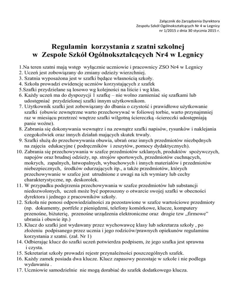 Załącznik do Zarządzenia Dyrektora Zespołu Szkół Ogólnokształcących Nr 4 w Legnicy nr 1/2015 z dnia 30 stycznia 2015 r. Regulamin korzystania z szatni szkolnej w Zespole Szkół Ogólnokształcących Nr4 w Legnicy 1.Na teren szatni mają wstęp wyłącznie uczniowie i pracownicy ZSO Nr4 w Legnicy 2. Uczeń jest zobowiązany do zmiany odzieży wierzchniej. 3. Szatnia wyposażona jest w szafki będące własnością szkoły. 4. Szkoła prowadzi ewidencję uczniów korzystających z szafek 5.Szafki przydzielane są losowo wg kolejności na liście i wg klas. 6. Każdy uczeń ma do dyspozycji 1 szafkę – nie wolno zamieniać się szafkami lub udostępniać przydzielonej szafki innym użytkownikom. 7. Użytkownik szafki jest zobowiązany do dbania o czystość i prawidłowe użytkowanie szafki (obuwie zewnętrzne warto przechowywać w foliowej torbie, warto przynajmniej raz w miesiącu przetrzeć wnętrze szafki wilgotną ściereczką -ściereczki udostępniają panie woźne). 8. Zabrania się dokonywania wewnątrz i na zewnątrz szafki napisów, rysunków i naklejania czegokolwiek oraz innych działań mających skutek trwały. 9. Szafki służą do przechowywania obuwia, ubrań oraz innych przedmiotów niezbędnych na zajęcia edukacyjne ( podręczników i zeszytów, pomocy dydaktycznych). 10. Zabrania się przechowywania w szafce przedmiotów szklanych, produktów spożywczych, napojów oraz brudnej odzieży, np. strojów sportowych, przedmiotów cuchnących, mokrych, zapalnych, łatwopalnych, wybuchowych i innych materiałów i przedmiotów niebezpiecznych, środków odurzających itp., a także przedmiotów, których przechowywanie w szafce jest utrudnione z uwagi na ich wymiary lub cechy charakterystyczne, np. deskorolek. 11. W przypadku podejrzenia przechowywania w szafce przedmiotów lub substancji niedozwolonych, uczeń może być poproszony o otwarcie swojej szafki w obecności dyrektora i jednego z pracowników szkoły. 12. Szkoła nie ponosi odpowiedzialności za pozostawione w szafce wartościowe przedmioty (np. dokumenty, portfele z pieniędzmi, telefony komórkowe, klucze, komputery przenośne, biżuterię, przenośne urządzenia elektroniczne oraz drogie tzw „firmowe” ubrania i obuwie itp.) 13. Klucz do szafki jest wydawany przez wychowawcę klasy lub sekretarza szkoły , po złożeniu podpisanego przez ucznia i jego rodziców/prawnych opiekunów regulaminu korzystania z szatni. (zał. Nr 1) 14. Odbierając klucz do szafki uczeń potwierdza podpisem, że jego szafka jest sprawna i czysta. 15. Sekretariat szkoły prowadzi rejestr przynależności poszczególnych szafek. 16. Każdy zamek posiada dwa klucze. Klucz zapasowy pozostaje w szkole i nie podlega wydawaniu . 17. Uczniowie samodzielnie nie mogą dorabiać do szafek dodatkowego klucza. 18. W przypadku zgubienia klucza do szafki uczeń zgłasza się do sekretariatu szkoły, szafka jest otwierana przez pracownika szkoły kluczem zapasowym . Koszt wymiany klucza – 15 zł 19. Za szkody i zniszczenia szafki powstałe z winy ucznia odpowiadają materialnie jego rodzice lub prawni opiekunowie. W przypadku stwierdzenia zniszczeń, uczniowie są zobligowani do ich naprawienia, a jeżeli jest to niemożliwe – są obciążani kosztami – ( koszt wymiany zamka – 50 zł, koszt 1szafki = 150 zł) 20. Uczeń jest zobowiązany do niezwłocznego zgłoszenia w sekretariacie szkoły kradzieży, zniszczenia lub innych problemów związanych z użytkowaniem szafki. 21. Uczniowi nie wolno próbować otwierania szafek innych uczniów, gdyż czyn ten może zostać zakwalifikowany jako usiłowanie włamania. 22. Kradzieże zgłaszane są na policję a w przypadku wykrycia sprawcy stosowany jest system kar określonych w statucie szkoły. 23. Przed zakończeniem roku szkolnego wychowawca dokonuje w obecności ucznia przeglądu szafek. W przypadku stwierdzenia zniszczeń, uczniowie wraz z rodzicami/ opiekunami prawnymi są zobligowani do ich naprawienia , a jeżeli jest to niemożliwe – są obciążani kosztami naprawy lub wymiany. 24. Raz w miesiącu wychowawca w obecności ucznia ma prawo do przeprowadzenia kontroli szafki pod kontem jej czystości jak i stanu zużycia. 25. Przed zakończeniem roku szkolnego uczeń zobowiązany jest do opróżnienia i posprzątania szafki oraz zwrotu kluczyka. Uczeń rozlicza się z użytkowania szafki na karcie obiegowej. 26. Uczeń oraz jego rodzic własnoręcznym podpisem przyjmują do wiadomości i stosowania niniejszy Regulamin 27. Dyrektor Zespołu Szkół Ogólnokształcących Nr4 w Legnicy zastrzega sobie prawo do zmian niniejszego Regulaminu. Zmieniony Regulamin będzie podany do wiadomości publicznej na tablicy ogłoszeń i będzie dostępny na szkolnej stronie internetowej. Sprawy nieobjęte regulaminem będą indywidualnie rozpatrywane przez Dyrektora Szkoły. 28. Regulamin wchodzi w życie z dniem 1 lutego 2015 r. Załącznik nr 1 do Regulamin korzystania z szatni szkolnej w Zespole Szkół Ogólnokształcących Nr4 w Legnicy Legnica dnia. ………………….. OŚWIADCZENIE Ja ……………………………………………… oświadczam, że zapoznałem/zapoznałam się z Regulaminem korzystania z szatni szkolnej w Zespole Szkół Ogólnokształcących Nr4 w Legnicy i zobowiązuję się do jego przestrzegania. Oświadczam, że zobowiązuję się ponosić koszty nieprawidłowego użytkowania szafki. ……………………………………….. Podpis rodzica/prawnego opiekuna ……………………………………… Podpis ucznia