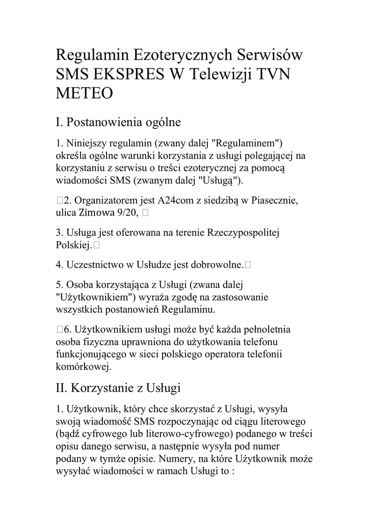 Regulamin Ezoterycznych Serwisów SMS EKSPRES W Telewizji TVN METEO I. Postanowienia ogólne 1. Niniejszy regulamin (zwany dalej "Regulaminem") okreś la ogólne warunki korzystania z usługi polegającej na korzystaniu z serwisu o treś ci ezoterycznej za pomocą wiadomoś ci SMS (zwanym dalej "Usługą"). 2. Organizatorem jest A24com z siedzibą w Piasecznie, ulica Zimowa 9/20, 3. Usługa jest oferowana na terenie Rzeczypospolitej Polskiej. 4. Uczestnictwo w Usłudze jest dobrowolne. 5. Osoba korzystająca z Usługi (zwana dalej "Uż ytkownikiem") wyraż a zgodę na zastosowanie wszystkich postanowień Regulaminu. 6. Uż ytkownikiem usługi moż e być każ da pełnoletnia osoba fizyczna uprawniona do uż ytkowania telefonu funkcjonującego w sieci polskiego operatora telefonii komórkowej. II. Korzystanie z Usługi 1. Uż ytkownik, który chce skorzystać z Usługi, wysyła swoją wiadomoś ć SMS rozpoczynając od ciągu literowego (bądź cyfrowego lub literowo-cyfrowego) podanego w treś ci opisu danego serwisu, a następnie wysyła pod numer podany w tymż e opisie. Numery, na które Użytkownik może wysyłać wiadomości w ramach Usługi to : 92514 (25,00 zl netto/ 30,75 zl brutto) 2. Treś ć SMS nie powinna przekroczyć 159 znaków uwzględniając spacje. 3. W treś ci SMS nie należ y uż ywać polskich znaków diakrytycznych. 4. Po wysłaniu wiadomoś ci SMS na wskazany numer Uż ytkownik zostaje zalogowany na czat o charakterze ezoterycznym. 5. Usługa polega na zadaniu przez Uż ytkownika pytania wróż kom, ktore prowadzą program Spotkanie z Wróżbami na antenie Telewizji TVNMETEO 6. Wróżki prowadzące program niezwłocznie odpowiadaja na pytanie otrzymane poprzez sms z numerów 92514 7. Jeżeli w trakcie trwania programu, z powodów okreslonych przez scenariusz programu, wróżka nie odpowie osobiscie i natychmiast na pytanie zadane poprzez sms z numeru 92514, odpowiedz na takie pytanie zostanie udzielona przez doradcow duchowych, ktorzy w tym samym czasie obslugują zgłoszenia SMS do programu Spotkanie z Wróżbami w TVN METEO 8. W trakcie trwania rozmowy Uż ytkownik pozostaje anonimowy, a jedynym elementem identyfikującym umoż liwiającym korzystanie z Usługi jest numer jego telefonu. Uż ytkownik nie jest zobowiązany do podawania jakichkolwiek swoich danych mogących go zidentyfikować ; podając w trakcie rozmowy jakiekolwiek informacje o w/w charakterze czyni to dobrowolnie i na własną odpowiedzialnoś ć. 9. Uż ytkownik ma prawo w każ dym czasie przerwać korzystanie z Usługi, bądź rozpocząć korzystanie z niej na nowo. 10. Organizator zastrzega sobie prawo do zablokowania dostępu do Usługi Uż ytkownikowi, który narusza postanowienia niniejszego Regulaminu, obowiązujące prawo, ogólnie przyjęte normy moralne lub też z innych istotnych przyczyn. III. Postanowienia końcowe 1. Usługa jest dostępna w sieciach polskich operatorów telefonii komórkowej (Era, Plus GSM, Orange, P4), zarówno w systemie prepaid, jak i postpaid (abonamentowym). Do korzystania z Usługi nie mają zastosowania ulgi dla grup abonentów na opłaty abonamentowe oraz usługi dodatkowe. 2. Organizator dołoż y wszelkich starań w celu zapewnienia prawidłowego działania Usługi. 3. Wysyłając swój SMS Uż ytkownik wyraż a jednocześ nie zgodę na otrzymywanie od Organizatora wiadomoś ci aktywizująco-informacyjnych oraz przetwarzanie jego numeru telefonu (rozumianego jako dana osobowa). 4. Organizator nie ponosi odpowiedzialnoś ci za: a) treś ć wiadomoś ci SMS wysyłanych przez Uż ytkownika w ramach korzystania z Usługi, b) korzystanie z Usługi przez osoby niepełnoletnie oraz osoby nieuprawnione do uż ytkowania telefonu komórkowego, c) szkody spowodowane nieprawidłowym korzystaniem przez Uż ytkownika z Usługi, d) wiadomoś ci SMS, które zostały nadane przez Uż ytkownika w sposób nieprawidłowy, a w szczególnoś ci uniemoż liwiające mu prawidłowe zalogowanie się do wybranego serwisu, e) ewentualny dyskomfort psychicznomoralny, jaki moż e zostać potencjalnie wywołany poprzez treś ci otrzymywane w trakcie rozmowy na czacie, f) za błędy lub przekłamania występujące w trakcie rozmowy, jeś li przyczyną tej sytuacji były błędy lub problemy techniczne leżące po stronie podmiotów trzecich, ze szczególnym uwzględnieniem operatorów telefonii komórkowej, g) korzystanie z Usługi przez Uż ytkowników niezgodnie z postanowieniami niniejszego Regulaminu lub bez zapoznania się z Regulaminem, w tym zwłaszcza wynikające z niewłaś ciwego zrozumienia przez Uż ytkownika charakteru Usługi oraz związanych z tym postanowień regulaminowych, przerwy w ś wiadczeniu Usługi zaistniałe z przyczyn technicznych (np. konserwacja, przegląd, wymiana sprzętu) lub niezależ nych od Organizatora, 5. Informacje otrzymywane przez Uż ytkownika w ramach korzystania z Usługi nie mają charakteru wiąż ących porad, zaś ewentualne stosowanie się do nich jest przez Uż ytkownika dobrowolne. Organizator nie ponosi odpowiedzialnoś ci za sposób, w jaki Uż ytkownik wykorzysta uzyskane informacje lub jakie działania podejmie w rezultacie zapoznania się z nimi. 6. Organizator zastrzega sobie prawo zmiany postanowień Regulaminu w razie zmiany przepisów prawnych lub z innej przyczyny. Regulamin w zmienionej formie obowiązuje od chwili podania do wiadomoś ci Uż ytkowników Usługi. 7. Reklamacje dotyczące Usługi należ y zgłaszać pisemnie pod adresem Zimowa 9/20, 05-500 Piaseczno.