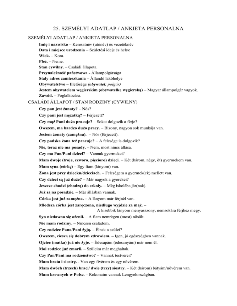 25. SZEMÉLYI ADATLAP / ANKIETA PERSONALNA SZEMÉLYI ADATLAP / ANKIETA PERSONALNA Imię i nazwisko – Keresztnév (utónév) és vezetéknév Data i miejsce urodzenia – Születési ideje és helye Wiek. – Kora. Płeć. – Neme. Stan cywilny. – Családi állapota. Przynależność państwowa - Állampolgársága Stały adres zamieszkania – Állandó lakóhelye Obywatelstwo – Illetősége (obywatel: polgár) Jestem obywatelem węgierskim (obywatelką węgierską) – Magyar állampolgár vagyok. Zawód. – Foglalkozása. CSALÁDI ÁLLAPOT / STAN RODZINY (CYWILNY) Czy pan jest żonaty? – Nős? Czy pani jest mężatką? – Férjezett? Czy mąż Pani dużo pracuje? – Sokat dolgozik a férje? Owszem, ma bardzo dużo pracy. – Bizony, nagyon sok munkája van. Jestem żonaty (zamężna). – Nős (férjezett). Czy pańska żona też pracuje? – A felesége is dolgozik? Nie, teraz nie ma posady. – Nem, most nincs állása. Czy ma Pan/Pani dzieci? – Vannak gyermekei? Mam dwoje (troje, czworo, pięcioro) dzieci. – Két (három, négy, öt) gyermekem van. Mam syna (córkę) – Egy fiam (lányom) van. Żona jest przy dziecku/dzieciach. – Feleségem a gyermek(ek) mellett van. Czy dzieci są już duże? – Már nagyok a gyerekei? Jeszcze chodzi (chodzą) do szkoły. – Még iskolába jár(nak). Już są na posadzie. – Már állásban vannak. Córka jest już zamężna. – A lányom már férjnél van. Młodsza córka jest zaręczona, niedługo wyjdzie za mąż. – A kisebbik lányom menyasszony, nemsokára férjhez megy. Syn niedawno się ożenił. – A fiam nemrégen (most) nősült. Nie mam rodziny. – Nincsen családom. Czy rodzice Pana/Pani żyją. – Élnek a szülei? Owszem, cieszą się dobrym zdrowiem. – Igen, jó egészségben vannak. Ojciec (matka) już nie żyje. – Édesapám (édesanyám) már nem él. Moi rodzice już zmarli. – Szüleim már meghaltak. Czy Pan/Pani ma rodzeństwo? – Vannak testvérei? Mam brata i siostrę. - Van egy fivérem és egy nővérem. Mam dwóch (trzech) braci/ dwie (trzy) siostry. – Két (három) bátyám/nővérem van. Mam krewnych w Polse. – Rokonaim vannak Lengyelországban. Dziadkowie byli Polakami. – Nagyszüleim lengyelek voltak. ÉLETKOR / WIEK Kiedy się Pan(i) urodził(a)? – Mikor született? Urodziłem się w roku tysiąc dziewięćset sześćdziesiątym – 1960-ban születtem. 1.Ile ma Pan/Pani lat? 2. Ile Pan/Pani ma lat? – Hány éves? Ile masz lat? – Hány éves vagy? Mam … X lat. – Most töltöttem az X.-et. Mam dwadzieścia (trzydzieści, czterdzieści pięć) lat – Húsz, harminc, negyvenöt éves vagyok Właśnie skończałam … lat. – Most töltöttem be az X. évet. Jestem młody (młoda). - Fiatal vagyok. Jestem w średnim wieku. – Középkorú/idős vagyok. Nie wygląda Pan/Pani na swój wiek. – Nem látszik annyinak. Jesteśmy rówieśnikami. – Egykorúak vagyunk. Panie zawsze są młode. – A hölgyek mindig fiatalok. Gdzie się pan(i) urodził(a)? – Hol született? ISKOLAI VÉGZETTSÉG / WYKSZTAŁCENIE Skończyłem wyższą uczelnię. – Egyetemet végeztem. Skończyłem wyższą szkołę. – Főiskolát végeztem. Zdałem maturę. – Érettségiztem. Mam wyższwe (średnie) wykształcenie.- Felsőfokú (középfokú) végzettségem van. NYELVTUDÁS / ZNAJMOŚĆ JĘZYKA Czy Pan/Pani mówi po polsku? – Beszél ön lengyelül? Nie umiem po polsku – Nem tudok lengyelül. Nie mówię po polsku. – Nem beszélek lengyelül. Tylko … pan/pani mówi po polsku. – Csak … úr/asszony beszél lengyelül. Bardzo mało umiem po polsku. – Nagyon keveset tudok lengyelül. Teraz uczę się języka poslkiego. – Most tanulok lengyelül. Gdzie się Pan/Pani uczył(a) się po polsku? – Hol tanult lengyelül? W Instytucie Polskich w Budapeszcie. – A Budapesti Lengyel Intézetben. Uczyłem (uczyłam) się prywatnie. – Magánúton tanultam. Uczę się polskiego od dwóch (trzech) miesięcy. – Két (három) hónapja tanulok lengyelül. Uczyłem się polskiego pół roku (rok czasu, dwa lata). – Félévig (egy évig, két évig) tanultam lengyelül. Chciał(a)bym dobrze nauczyć się języka polskiego. – Szeretnék jól megtanulni lengyelül. Jak Pan/Pani sądzi, jak szybko mogę nauczyć się po polsku? – Mit gondol, milyen gyorsan tanulhatnék meg lengyelül? Czy Pan/Pani mówi po węgiersku? – Beszél ön magyarul? Nie umiem po węgiersku – Nem tudok magyarul. Jakim obcym językiem Pan/Pani włada? – Milyen idegen nyelvet beszél? Jakimi obcymi językami Pan/Pani włada? – Milyen idegen nyelveken beszél? Umiem po francusku (po niemiecku, po angielsku, po rosyjsku, po czesku). – Tudok franciául (németül, angolul, oroszul, csehül). Nie mam zdolności do języków. – Nincs tehetségem a nyelvekhez. Czy Pan/Pani mnie rozumie? – Ért engem? Czy Pan/Pani rozumie, co ja mówię? – Érti, amit mondok? Nie rozumiem. – Nem értem. Bardzo żałuję, ale nie rozumiem. – Nagyon sajnálom, de nem értem. Proszę mówić wolno/wolniej. – Kérem, beszéljen lassabban. Co oznacza to słowo? – Mit jelent ez a szó? Co znaczy to słowo? – Mit jelent ez a szó? Jak trzeba wymawiać to słowo? – Hogyan kell kiejteni ezt a szót? Jak się wymawia to słowo? – Hogyan kell kiejteni ezt a szót? Jak się to mówi po polsku? – Hogy mondják lengyelül? Jak to się mówi po polsku? – Hogy mondják lengyelül? Jak to jest po polsku? – Hogy mondják lengyelül? Proszę powtórzyć. – Kérem, ismételje meg. Wymowa polskich słów jest trudna. – A lengyel szavak kiejtése nehéz. Jak to napisać po polsku? – Hogy írják ezt lengyelül? Wszystko zrozumiałem (zrozumiałam). – Mindent megértettem. Rozumiem Pana (Panią) dobrze, ale mówić jeszcze nie potrafię. – Jól értem Önt, de beszélni még nem tudok. Skąd Pan/Pani pochodzi? – Hová valósi? Czy Pan/Pani stąd pochodzi? – Ön idevalósi? Jestem obcokrajowcem. – Külf