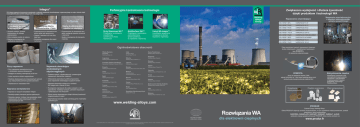 Integra TM Hardplate Hardlite Tuffplate Trudnościeralne blachy napawane do pracy w surowych warunkach Ultracienkie blachy trudnościeralne < 5mm Blachy trudnościeralne odporne na uderzanie • Grubość podłoża i powłoki dostosowana do danego zastosowania • Kilka rodzajów powłok do wyboru • Zalecane rozwiązanie dla wydłużenia żywotności • Przeznaczone do stosowania tam, gdzie ciężar jest ograniczony • Lżejsze i twardsze niż inne płyty tego typu • Korzystne rozwiązanie dla części ruchomych • Przeznaczone do stosowania tam, gdzie występuje zjawisko ścierania i uderzania • Idealne rozwiązanie dla transportu materiału Zwiększona wydajność i dłuższa żywotność dzięki produktom i technologii WA Perfekcyjnie kontrolowana technologia WA Integra zapewnia innowacyjne rozwiązania w zakresie napawania utwardzającego i regeneracyjnego na całym świecie dzięki naszej globalnej sieci centrów usługowych oraz usług in-situ. Napawanie utwardzające Druty Rdzeniowe WA™ MultiSurfacer WA™ Usługi WA Integra™ Projektujemy i produkujemy wszystkie typy spawalniczych drutów rdzeniowych Projektujemy i produkujemy zautomatyzowany sprzęt spawalniczy do napawania i regeneracji Innowacyjne, spawalnicze rozwiązania w zakresie napawania i regeneracji Ogólnoświatowa obecność Rury napawane • Rury napawane wewnętrznie do pracy w środowisku wysoce abrazywnym • Dostępne w średnicy wewnętrznej od 50 mm Napawanie utwardzające średniobieżnych młynów węglowych • Łatwo wymienne kolana segmentowe • Dostawa nowych, udoskonalonych i prewencyjnie napawanych elementów mielących • Średnice dostosowane do indywidualnych potrzeb przy maksymalnej ochronie przed ścieraniem • Odtworzenie pierwotnych profili komponentów przez napawanie utwardzające zużytych warstw • Wytwarzane w warsztatach WA • Naprawa elementów mielących w centrach WA Integra lub u Klienta (in-situ) Naprawa wentylatorów • Naprawa w naszych warsztatach Integra • Bardziej wydajny transport gazów spalinowych • Redukcja napraw i krótszy czas przestojów dzięki zastosowaniu drutów rdzeniowych i blach trudnościeralnych WA • Rozwiązania naprawcze dla części zużytych, w tym separatorów, instalacji rurowych, pierścieni dyszowych i spiętrzających oraz korpusów • Niższe koszty eksploatacyjne dzięki dłuższej żywotności zregenerowanych części • Optymalizacja kosztów dzięki szerokiej gamie materiałów spawalniczych Wielka Brytania Indie Korea Południowa (Centrala) Welding Alloys Ltd Welding Alloys South Asia Pvt Ltd Welding Alloys Korea Ltd Argentyna Włochy Welding Alloys Argentina S.A. Welding Alloys Italiana s.r.l. Australia (Partner Handlowy) Japonia Specialised Welding Products Pty Ltd Welding Alloys Japan Brazylia Malezja Welding Alloys Brasil Ltda Welding Alloys (Far East) Sdn. Bhd. Chiny Meksyk Welding Alloys China Ltd Welding Alloys Panamericana S.A. de C.V. Egipt Welding Alloys Egypt Maroko Welding Alloys Maroc Sàrl Finlandia Welding Alloys Finland Oy Polska Welding Alloys Polska Sp. z o.o. Francja Welding Alloys France SAS Rosja ZAO Welding Alloys Niemcy Welding Alloys Deutschland GmbH Republika Południowej Afryki WASA (PTY) Ltd EN 14700 T ZFe HARDFACE FC-O EN 14700 T Fe15 HARDFACE HC-O EN 14700 T Fe15 HARDFACE CN-O EN 14700 T Fe16 HARDFACE CV-O EN 14700 T Fe16 HARDFACE CNV-O EN 14700 T Fe20 HARDFACE STEELBCARBW EN 14700 T Ni20 HARDFACE NiCARBW EN 14700 T Fe8 HARDFACE TIC-O EN 14700 T Fe10 HARDFACE 19 9 6 Napawanie przeciwkorozyjne z użyciem automatycznego sprzętu spawalniczego Pełen asortyment naszych zgrzewanych laserowo drutów rdzeniowych z wypełnieniem topnikowym typu ROBOFIL do spawania połączeniowego Hiszpania Welding Alloys España Szwecja Welding Alloys Sweden Tajwan Welding Alloys Taiwan Co. Tajlandia Welding Alloys (Thailand) Co. Ltd Natryskiwanie cieplne ROBOFIL Turcja druty do spawania stopów CrMo więcej informacji na : http://www.welding-alloys.com/ products-services/promotional-material.html Welding Alloys Limited Şirketi Ukraina Welding Alloys Ukraine Zjednoczone Emiraty Arabskie Wydłużenie żywotności oraz oszczędność energii poprzez napawanie i natryskiwanie z zastosowaniem maszyn, produktów i technologii Welding Alloys. Welding Alloys Middle East FZC Wypełnienie międzywarstwowe USA Welding Alloys (USA) Inc. Powłoki ceramiczne Płyty kompozytowe Wietnam Welding Alloys Vietnam Co. Ltd. Grecja Welding Alloys Hellas EPE www.welding-alloys.com PRODUR Rozwiązania WA dla elektrowni cieplnych Grupa Welding Alloys 2013. Znaki handlowe i zastrzeżone oraz loga Drutów Rdzeniowych WA, Speedmet, SpeedAl, WA Integra, 3-DCarb, Hardlite, Hardplate, Tuffplate oraz MultiSurfacer WA są wyłączną własnością Grupy Welding Alloys. Członek Grupy Welding Alloys Oferta PRODUR obejmuje produkty trudnościeralne, w tym wypełnienia międzywarstwowe, powłoki ceramiczne i płyty kompozytowe DURSTEEL, DURAPLATE, DURCAST, DURHART, DURZALT, ALDUR - polecamy naszą specjalną broszurę PRODUR, którą można zamówić na www.produr.fr Młotki Zsypy Korpus młyna średniobieżnego Tarcze Hot Zsypy gas ring Misa i rolki Misa młyna węglowego Rozdzielacz paliwa Kolana instalacji rurowej Ekrany po napawaniu Natryskiwanie ekranów kotłowych Ściana cyklonu Podajnik węgla Kocioł Transport Odsiarczanie Zsyp Transformator blokowy Turbina Pompa Chłodnia kominowa Średniobieżny młyn węglowy Usuwanie żużla i popiołu Pompa Kondensator Podajnik węgla Stożek separatora Klatka separatora Rury instalacji paleniskowej Systemy wodzące pierścienia mielącego Ładowarka zgarniakowa Beater Koło bijakowe wheel Króciec Ball racewylotowy mills młyna Dysze pyłowe Zawsze rozwiązania Welding Alloys - od paliwa do energii Przenośnik popiołu Wirnik wentylatora Kołnierze króćca