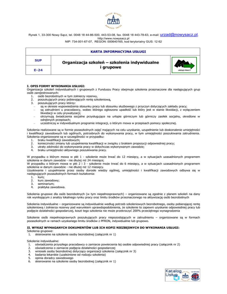 Rynek 1, 33-300 Nowy Sącz, tel. 0048 18 44-86-500, 443-53-08, fax. 0048 18 443-78-63, e-mail: [email protected], http://www.nowysacz.pl NIP: 734-001-67-07, REGON: 000640165, kod terytorialny GUS: 12 62 KARTA INFORMACYJNA USŁUGI SUP E-24 Organizacja szkoleń – szkolenia indywidualne i grupowe URZĄD PRACY I. OPIS FORMY WYKONANIA USŁUGI: Organizacja szkoleń indywidualnych i grupowych z Funduszu Pracy obejmuje szkolenia przeznaczone dla następujących grup osób zarejestrowanych: 1. osób bezrobotnych w tym Ŝołnierzy rezerwy, 2. poszukujących pracy pobierających rentę szkoleniową, 3. poszukujących pracy którzy: – są w okresie wypowiedzenia stosunku pracy lub stosunku słuŜbowego z przyczyn dotyczących zakładu pracy; – są zatrudnieni u pracodawcy, wobec którego ogłoszono upadłość lub który jest w stanie likwidacji, z wyłączeniem likwidacji w celu prywatyzacji; – otrzymują świadczenia socjalne przysługujące na urlopie górniczym lub górniczy zasiłek socjalny, określone w odrębnych przepisach; – uczestniczą w indywidualnym programie integracji, o którym mowa w przepisach pomocy społecznej. Szkolenia realizowane są w formie pozaszkolnych zajęć mających na celu uzyskanie, uzupełnienie lub doskonalenie umiejętności i kwalifikacji zawodowych lub ogólnych, potrzebnych do wykonywania pracy, w tym umiejętności poszukiwania zatrudnienia. Szkolenia organizowane są w szczególności w przypadku: 1. braku kwalifikacji zawodowych; 2. konieczności zmiany lub uzupełnienia kwalifikacji w związku z brakiem propozycji odpowiedniej pracy; 3. utraty zdolności do wykonywania pracy w dotychczas wykonywanym zawodzie; 4. braku umiejętności aktywnego poszukiwania pracy. W przypadku o którym mowa w pkt 1 - szkolenie moŜe trwać do 12 miesięcy, a w sytuacjach uzasadnionych programem szkolenia w danym zawodzie - nie dłuŜej niŜ 24 miesiące; W przypadku o którym mowa w pkt 2 i 3 - szkolenie moŜe trwać do 6 miesięcy, a w sytuacjach uzasadnionych programem szkolenia w danym zawodzie - nie dłuŜej niŜ 12 miesięcy. Uzyskiwanie i uzupełnianie przez osoby dorosłe wiedzy ogólnej, umiejętności i kwalifikacji zawodowych odbywa się w następujących pozaszkolnych formach kształcenia: 1. kurs; 2. kurs zawodowy; 3. seminarium; 4. praktyka zawodowa. Szkolenia grupowe dla osób bezrobotnych (w tym niepełnosprawnych) – organizowane są zgodnie z planem szkoleń na dany rok wynikającym z analizy lokalnego rynku pracy oraz limitu środków przeznaczonego na aktywizację osób bezrobotnych Szkolenia indywidualne – organizowane są indywidualnie według potrzeb szkoleniowych bezrobotnego, osoby pobierającej rentę szkoleniową i Ŝołnierza rezerwy pod warunkiem uprawdopodobnienia, Ŝe szkolenie to zapewni uzyskanie odpowiedniej pracy lub podjęcie działalności gospodarczej, koszt tego szkolenia nie moŜe przekroczyć 200% przeciętnego wynagrodzenia Szkolenie osób niepełnosprawnych poszukujących pracy niepozostających w zatrudnieniu – organizowane są w formach pozaszkolnych w ramach uzyskanego limitu środków z PFRON, indywidualnie lub grupowo. II. WYKAZ WYMAGANYCH DOKUMENTÓW LUB ICH KOPII NIEZBĘDNYCH DO WYKONANIA USŁUGI: Szkolenia grupowe: 1. skierowanie na szkolenie osoby bezrobotnej (załącznik nr 1) Szkolenie indywidualne: 1. oświadczenia przyszłego pracodawcy o zamiarze powierzenia tej osobie odpowiedniej pracy (załącznik nr 2) 2. oświadczenia o zamiarze podjęcia działalności gospodarczej 3. wniosek osoby bezrobotnej dotyczący organizacji szkolenia (załącznik nr 3) 4. badania lekarskie (uzaleŜnione od rodzaju szkolenia) 5. opinia doradcy zawodowego 6. skierowanie na szkolenie osoby bezrobotnej (załącznik nr 1) Rynek 1, 33-300 Nowy Sącz, tel. 0048 18 44-86-500, 443-53-08, fax. 0048 18 443-78-63, e-mail: [email protected], http://www.nowysacz.pl NIP: 734-001-67-07, REGON: 000640165, kod terytorialny GUS: 12 62 Szkolenie osób niepełnosprawnych, poszukujących pracy niepozostających w zatrudnienia: 1. podanie (wniosek) osoby zainteresowanej szkoleniem z uzasadnieniem celowości szkolenia, 2. opinia doradcy zawodowego, 3. kserokopia orzeczenia o stopniu niepełnosprawności (oryginał do wglądu), 4. opinia lekarza dotycząca moŜliwości przeszkolenia, 5. skierowanie na szkolenie osoby niepełnosprawnej Szkolenie osób posiadających rentę szkoleniową: 1. w przypadku posiadania przez osobę renty szkoleniowej – wniosek z Zakładu Ubezpieczeń Społecznych o skierowanie na szkolenie, 2. opinia doradcy zawodowego, 3. opinia lekarza dotycząca moŜliwości przeszkolenia, 4. skierowanie na szkolenie osoby pobierającej rentę szkoleniową III. RODZAJ I WYSOKOŚĆ OPŁAT ZWIĄZANYCH Z WYKONANIEM USŁUGI: − Usługa zwolniona z opłaty skarbowej – ustawa z dnia 9 września 2000 r. o opłacie skarbowej (tekst jednolity: Dz. U. z 2004 r. Nr 253, poz. 2532 z późniejszymi zmianami). IV. INFORMACJA NT. OBOWIĄZKU PRZEDSTAWIENIA DOWODÓW WPŁAT: nie dotyczy − V. INFORMACJA NT. WYMAGANEJ AKTUALNOŚCI ZAŚWIADCZEŃ: − nie dotyczy VI. INFORMACJA NT. TERMINU PRZEDSTAWIENIA WYMAGANYCH DO WGLĄDU DOKUMENTÓW: − w dniu zgłoszenia do SUP VII. INFORMACJA NT. MOśLIWOŚCI SPRAWDZANIA STANU SPRAWY: − Klient moŜe uzyskać informacje w siedzibie SUP VIII. INFORMACJA NT. SPOSOBU ZŁOśENIA DOKUMENTÓW: − osobiście w formie pisemnej w siedzibie SUP IX. INFORMACJA NT. FORMY ODBIORU DOKUMENTU KOŃCZĄCEGO POSTĘPOWANIE: − nie dotyczy X. MAKSYMALNY TERMIN WYKONANIA USŁUGI: Szkolenia grupowe realizowane są zgodnie z planem szkoleń na dany. Szkolenia indywidualne - do 30 dni od dnia złoŜenia wniosku wraz z kompletem wymaganych dokumentów. O rozpatrzeniu wniosku i podjętej decyzji bezrobotny zostanie powiadomiony na piśmie. XI. OPIS TRYBU ODWOŁAWCZEGO: Od decyzji orzekającej o przyznaniu dodatku szkoleniowego lub stypendium na czas odbywania szkolenia przysługuje prawo złoŜenia odwołania do Wojewody Małopolskie