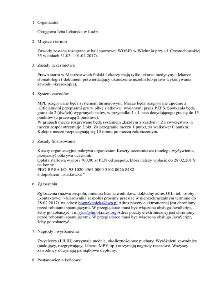 1. Organizator Okręgowa Izba Lekarska w Łodzi 2. Miejsce i termin Zawody zostaną rozegrane w hali sportowej WOSIR w Wieluniu przy ul. Częstochowskiej 35 w dniach 31.03. - 01.04.2017r. 3. Zasady uczestnictwa Prawo startu w Mistrzostwach Polski Lekarzy mają tylko lekarze medycyny i lekarze stomatologii ( dokument potwierdzający ukończenie uczelni lub prawo wykonywania zawodu –kserokopia). 4. System zawodów MPL rozgrywane będą systemem turniejowym. Mecze będą rozgrywane zgodnie z „Oficjalnymi przepisami gry w piłkę siatkową” wydanymi przez PZPS. Spotkania będą grane do 2 (dwóch) wygranych setów, w przypadku 1 : 1, seta decydującego gra się do 15 punktów (z przewagą 2 punktów). W grupach mecze rozgrywane będą systemem „każdym z każdym”. Za zwycięstwo w meczu zespół otrzymuje 2 pkt. Za przegranie meczu 1 punkt, za walkower 0 punktu. Kolejne mecze rozpoczynają się 15 minut po meczu zakończonym. 5. Zasady finansowania Koszty organizacyjne pokrywa organizator. Koszty uczestnictwa (noclegi, wyżywienie, przejazdy) pokrywa uczestnik. Opłata startowa wynosi 700,00 zł PLN od zespołu, która należy wpłacić do 28.02.2017r. na konto: PKO BP SA I/O 95 1020 4564 0000 5102 0026 8482 z dopiskiem „siatkówka ” 6. Zgłoszenia Zgłoszenia (nazwa zespołu, imienna lista zawodników, dokładny adres OIL, tel. osoby „kontaktowej”- kierownika zespołu) prosimy przesłać w nieprzekraczalnym terminie do 28.02.2017r. na adres: [email protected] Adres poczty elektronicznej jest chroniony przed robotami spamującymi. W przeglądarce musi być włączona obsługa JavaScript, żeby go zobaczyć. i [email protected] Adres poczty elektronicznej jest chroniony przed robotami spamującymi. W przeglądarce musi być włączona obsługa JavaScript, żeby go zobaczyć. 7. Nagrody i wyróżnienia Zwycięzcy (I,II,III) otrzymają medale, okolicznościowe puchary. Wyróżnieni zawodnicy (atakujący, rozgrywający, Libero, MPV itp ) otrzymają nagrody rzeczowe. Wszyscy zawodnicy otrzymają pamiątkowe dyplomy. 8. Postanowienia końcowe Ewentualne sprawy sporne rozpatrywane będą na miejscu przez sędziego głównego i organizatora. Organizator zastrzega sobie zmiany w regulaminie MPL. Dodatkowych informacji udziela: Bogna Kanicka tel. 604-94-74-86 [email protected] Adres poczty elektronicznej jest chroniony przed robotami spamującymi. W przeglądarce musi być włączona obsługa JavaScript, żeby go zobaczyć. Mirosław Kanicki tel. 602-516-139 [email protected] Adres poczty elektronicznej jest chroniony przed robotami spamującymi. W przeglądarce musi być włączona obsługa JavaScript, żeby go zobaczyć.