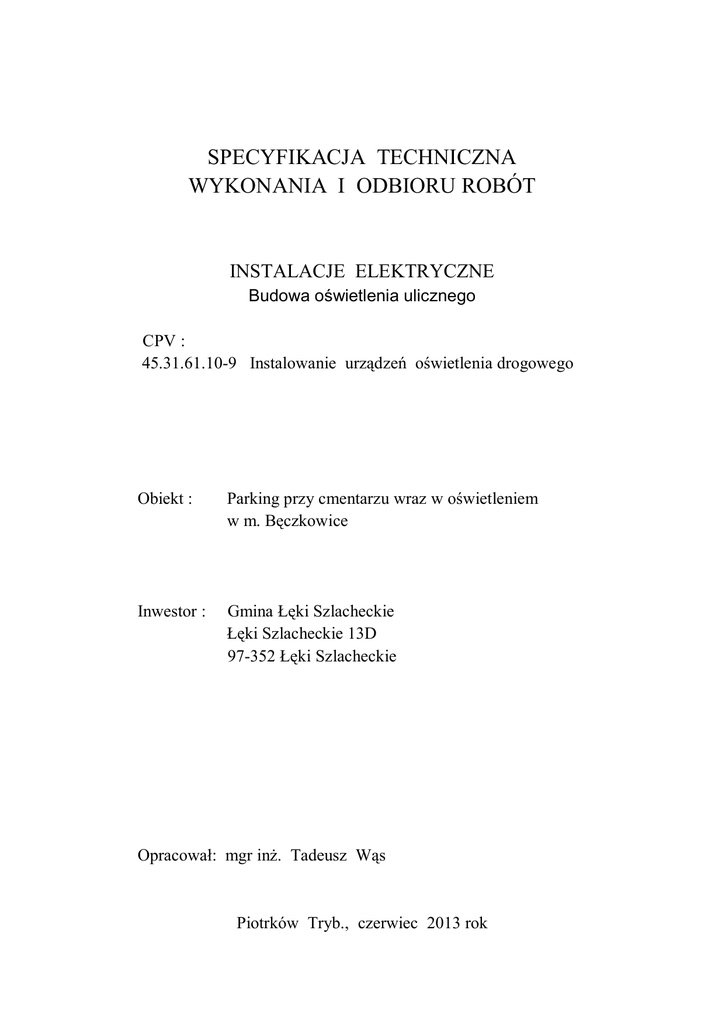 SPECYFIKACJA TECHNICZNA WYKONANIA I ODBIORU ROBÓT INSTALACJE ELEKTRYCZNE Budowa oświetlenia ulicznego CPV : 45.31.61.10-9 Instalowanie urządzeń oświetlenia drogowego Obiekt : Parking przy cmentarzu wraz w oświetleniem w m. Bęczkowice Inwestor : Gmina Łęki Szlacheckie Łęki Szlacheckie 13D 97-352 Łęki Szlacheckie Opracował: mgr inż. Tadeusz Wąs Piotrków Tryb., czerwiec 2013 rok 2 SPIS TREŚCI 1. CZĘŚĆ OGÓLNA 1.1. Nazwa nadana zamówieniu przez zamawiającego 1.2. Przedmiot STWiOR 1.3. Zakres stosowania STWiOR 1.4. Przedmiot i zakres robót objętych STWiOR 1.5. Określenia podstawowe, definicje 1.6. Ogólne wymagania dotyczące robót 1.7. Dokumentacja robót montażowych i prefabrykacyjnych 1.8. Nazwy i kody 2. WYMAGANIA DOTYCZĄCE WŁAŚCIWOŚCI MATERIAŁÓW 3. WYMAGANIA DOTYCZĄCE SPRZĘTU, MASZYN I NARZĘDZI 4. WYMAGANIA DOTYCZĄCE TRANSPORTU 5. WYMAGANIA DOTYCZĄCE WYKONANIA ROBÓT 6. KONTROLA JAKOŚCI ROBÓT 7. WYMAGANIA DOTYCZĄCE PRZEDMIARU I OBMIARU ROBÓT 8. SPOSÓB ODBIORU ROBÓT 9. PODSTAWA ROZLICZENIA ROBÓT 10. DOKUMENTY ODNIESIENIA 1. CZĘŚĆ OGÓLNA. 1.1. Nazwa nadana zamówieniu przez zamawiającego. Budowa oświetlenia parkingu przy cmentarzu w Bęczkowicach w gminie Łęki Szlacheckie. 1.2. Przedmiot STWiOR. Przedmiotem niniejszej specyfikacji technicznej są wymagania dotyczące wykonania i odbioru robót związanych z budową oświetlenia parkingu j.w. 1.3. Zakres stosowania STWiOR. Specyfikacja techniczna jest stosowana jako dokument przetargowy i kontraktowy przy zlecaniu i realizacji robót. 1.4. Przedmiot i zakres robót objętych STWiOR. Ustalenia zawarte w niniejszej specyfikacji dotyczą zasad prowadzenia robót związanych wykonaniem budowy oświetlenia wg zakresu określonego w dokumentacji projektowej. 1.5. Określenia podstawowe 1.5.1. Słup oświetleniowy - konstrukcja wsporcza osadzona w gruncie bezpośrednio lub za pomocą fundamentu służąca do zamocowania oprawy oświetleniowej na wysokości nie większej niż 14m. 1.5.2. Wysięgnik - element profilowy montowany na wierzchołku lub na boku słupa służący do zamocowania i ustawienia oprawy oświetleniowej w pozycji pracy. 1.5.3. Oprawa oświetleniowa - urządzenie służące do rozdziału, filtracji i przekształcania strumienia świetlnego wysyłanego przez źródło światła zawierające wszystkie niezbędne elementy do jej przymocowania. 1.5.4. Fundament - konstrukcja żelbetowa zagłębiona w ziemi, służąca do ustawienia słupa. 3 1.5.5. Moduł fotowoltaiczny – układ ogniw słonecznych połączonych szeregowo lub szeregowo-równolegle. 1.5.6. Akumulator – ogniwo galwaniczne służące do akumulacji energii elektrycznej. 1.5.7. Siłownia wiatrowa – urządzenie przekształcające energię kinetyczną wiatru na energię mechaniczną w postaci ruchu obrotowego wirnika. 1.5.8. Regulator do siłowni wiatrowej – Regulator stosowany do automatycznego sterowania pracą siłowni wiatrowej. 1.5.9. Regulator solarny - Regulator stosowany do automatycznego sterowania pracą panelu fotowoltaicznego. 1.6 Ogólne wymagania dotyczące robót. Wykonawca robót jest odpowiedzialny za jakość ich wykonania oraz za zgodność z Dokumentacją Projektową, Specyfikacją Techniczną i poleceniami Inspektora Nadzoru. 1.7 Dokumentacja robót montażowych i prefabrykacyjnych. Dokumentację robót montażowych budowy oświetlenia ulicznego stanowią - projekt budowlany i wykonawczy - specyfikacje techniczne wykonania i odbioru robót - dokumenty świadczące o dopuszczeniu do obrotu i powszechnego lub jednostkowego zastosowania użytych wyrobów budowlanych, karty techniczne wyrobów lub zalecenia producentów dotyczące stosowania wyrobów, protokoły odbiorów częściowych, końcowych oraz robót zanikających i ulegających zakryciu z załączonymi protokołami z badań kontrolnych, - dokumentacja powykonawcza 1.8 Nazwa i kody. 45.31.61.10-9 Instalowanie urządzeń oświetlenia drogowego 2.0 MATERIAŁY. 2.1 Słup lampy hybrydowej: Słup lampy hybrydowej powinien być stalowy, grubościenny, obustronnie ocynkowany, stal S355. Konstrukcja trzonu słupa powinna być oparta na ośmiokącie foremnym o zmiennym przekroju (ostrosłup zbieżny) zakończony teleskopowo. Wysokość trzonu słupa powinna być nie mniejsza niż 6m. Słup powinien posiadać certyfikat CE dopuszczający do stosowania na terenie UE. Załączyć dokument. Słup przeliczony ( ze względu na wagę systemu oraz powierzchnię zastosowanych paneli fotowoltaicznych i siłowni wiatrowej ) do montażu systemu hybrydowego w I strefie wiatrowej zgodnie z normą PN EN 1991-1-4 ( Vref = 22 m/s , II kategoria terenu) przy montażu na wysokościach do 300 m n.p.m – załączyć dokument potwierdzający. 2.2 Wysięgnik do montażu oprawy oświetleniowej: Wysięgnik powinien być stalowy, obustronnie cynkowany, o długość min.1,0m. Wysięgnik powinien mieć możliwość płynnej zmiany kąta nachylenia ( w zakresie 5° - 25°) względem płaszczyzny podłoża, po montażu oprawy oświetleniowej na wysięgniku i słupie oraz możliwość obrotu wokół pionowej osi słupa - masztu po zamontowaniu oprawy oświetleniowej na wysięgniku i słupie. 4 2.3 Fundament pod słup lampy hybrydowej: Fundament powinien być prefabrykowany przeliczony pod montaż systemu lampy hybrydowej w I strefie wiatrowej na słupie stalowym o wysokości 6m – załączyć obliczenia i dokument potwierdzający. Wymiary minimalne fundamentu: 450mm x 450mm x 1800 mm. Waga fundamentu: minimum 600 kg, zgodny z PN-EN 14991:2010 ( beton C25/30, klasa ekspozycji XF2) – załączyć dokument potwierdzający. 2.4 Akumulator – 2szt. ( parametry dla jednego akumulatora): Akumulator powinien być bezobsługowy głębokiego rozładowania - żelowy. Projektowana żywotność powinna wynosić 12 lat – dostarczyć kartę katalogową potwierdzającą wszystkie wymagane parametry. Pojemność: minimum 220 Ah (C20 – 20 godzinny tryb rozładowania). Wymiary: minimum 50