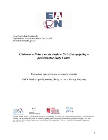 Anna Szukiełojć-Bieńkuńska Departament Pracy i Warunków Życia, GUS [email protected] Ubóstwo w Polsce na tle krajów Unii Europejskiej – podstawowe fakty i dane Ekspertyza przygotowana w ramach projektu EAPN Polska – profesjonalny dialog na rzecz Europy Socjalnej Projekt „EAPN Polska – profesjonalny dialog na rzecz Europy Socjalnej” jest realizowany przy wsparciu udzielonym przez Islandię, Liechtenstein i Norwegię ze środków Mechanizmu Finansowego Europejskiego Obszaru Gospodarczego oraz Norweskiego Mechanizmu Finansowego oraz budżetu Rzeczypospolitej Polskiej w ramach Funduszu dla Organizacji Pozarządowych. 1 Ograniczenie ubóstwa i spójność społeczna to zarówno priorytet ekonomiczny jak i strategiczny cel polityki społecznej Unii Europejskiej realizowanej wspólnie z krajami członkowskim w ramach metody otwartej koordynacji1. Niezbędnym warunkiem programowania i prowadzenia skutecznej kompleksowej polityki zarówno w sferze ekonomicznej jak i społecznej jest odpowiedni system informacji, stąd też zarówno w zaleceniach jak i działaniach Komisji Europejskiej położony został duży nacisk na stałe doskonalenie i harmonizację statystycznych źródeł informacji. Dotyczy to również przyjęcia zestawu wspólnie uzgodnionych wskaźników, które pozwoliłyby w sposób możliwie precyzyjny diagnozować oraz porównywać sytuację w państwach członkowskich Unii, a także monitorować postępy w realizacji przyjętych przez Wspólnotę celów w zakresie przeciwdziałania wykluczeniu społecznemu i walki z ubóstwem Czy obywatele Unii Europejskiej czują się zagrożeni ubóstwem? W 2007 r. na zlecenie Komisji Europejskiej we wszystkich krajach Unii zostało przeprowadzone specjalne badanie ankietowe dotyczące postrzegania przez opinię publiczną zjawiska ubóstwa i społecznego wykluczenia2. Badaniem objęto około 26,5 tys. osób w wieku 15 lat i więcej ( po ok.1000 osób w każdym z krajów, z wyjątkiem Cypru i Malty, gdzie próba liczyła po ok.500 osób). Z badania tego wynika m.in., iż przeciętny mieszkaniec Unii Europejskiej uważa, że w miejscu jego zamieszkania (w najbliższej okolicy) - 39% osób doświadcza sytuacji, które wskazują na to, że żyją one w ubóstwie (w tym co 10 osoba w skrajnym ubóstwie). Jako żyjący w biedzie postrzegani są przede wszystkim mieszkańcy ‘‘nowych krajów członkowskich” (w dwunastu nowych krajach członkowskich - jako doświadczający sytuacji ubóstwa, w tym skrajnego, postrzeganych jest 63% osób, wobec 32% osób - w krajach „starej piętnastki”). Przeciętny Polak sądzi, iż w okolicy w której mieszka, ubóstwem dotkniętych jest 64% osób, w tym skrajnym ubóstwem - 20%. Cytowane dane świadczą o tym, jak bardzo rozpowszechnione jest w świadomości społecznej poczucie zagrożenia biedą i jak duża jest skala tego problemu w Europie (pomimo tego, że w pewnym stopniu, opinie respondentów wynikają jedynie z przypuszczeń, subiektywnych ocen, a nie ze znajomości faktycznych warunków życia osób postrzeganych jako ubogie). Czy subiektywne odczucia dotyczące skali ubóstwa w krajach Unii Europejskiej znajdują potwierdzenie w tak zwanych obiektywnych miarach tego zjawiska? Jak mierzy się poziom ubóstwa obiektywnego w Unii Europejskiej? Według wspólnie uzgodnionej i przyjętej przez Eurostat (Urząd Statystyczny Unii Europejskiej) metodologii, za zagrożone ubóstwem uważa się osoby żyjące w gospodarstwach domowych, których dochód do dyspozycji jest niższy od granicy ubóstwa ustalonej na poziomie 60% mediany dochodu w danym kraju. Przyjęto zatem relatywne podejście do pomiaru ubóstwa3, w którym próg ubóstwa powiązany jest ze standardem 1 Aby z jednej strony uświadomić skalę problemu ubóstwa i wykluczenia społecznego a z drugiej strony upowszechnić i wesprzeć działania Wspólnoty w walce z tymi zjawiskami, zgodnie z Decyzją Parlamentu i Rady UE nr 1098/2008/WE z dnia 22 października 2008 r. rok 2010 ustanowiono Europejskim Rokiem Walki z Ubóstwem i Wykluczeniem Społecznym. Decyzja ta została opublikowana w Dzienniku Urzędowym Unii Europejskiej L 298, w dniu 7.11.2008 r. 2 Metodologia i wyniki tego badania zostały opublikowane w raporcie: Special Eurobarometr, Poverty and social Exclusion, European Commission, September 2007 3 Relatywne podejście do pomiaru ubóstwa uznano w warunkach Unii Europejskiej jako bardziej adekwatne od podejścia absolutnego, przynajmniej z dwu podstawowych powodów. Po pierwsze – kluczowym wyzwaniem stawianym przez UE jest stworzenie możliwości korzystania przez wszystkich jej mieszkańców z przeciętnie wysokiego poziomu dobrobytu w krajach Unii. Po drugie – to, co jest postrzegane jako minimalny akceptowalny 2 życia w poszczególnych krajach. Miara ta określa zatem grupę ludności będącą w każdym z krajów, w relatywnie najtrudniejszej sytuacji dochodowej (bez odniesienia do poziomu dochodów w pozostałych państwach). W ostatnich latach podstawą prowadzenia systematycznych analiz dotyczących zasięgu i społecznego zróżnicowania ubóstwa w Unii Europejskiej są wyniki prowadzonego przez wszystkie kraje członkowskie europejskiego badania dochodów i warunków życia, zwanego w skrócie od angielskiej nazwy EU-SILC (EU Statistics on Income and Living Condition) Jaki jest zasięg ubóstwa relatywnego w Unii Europejskiej?4 Z aktualnie dostępnych szacunków Eurostatu przeprowadzonych na podstawie EU-SILC 2007, w którym to badaniu zbierano informacje o sytuacji dochodowej gospodarstw domowych w 2006 r. wynika, że w sferze ubóstwa relatywnego żyło w tym czasie 16% obywateli Unii Europejskiej (od 10% w Czechach i Niderlandach do 25% w Rumunii). W Polsce wskaźnik zagrożenia ubóstwem relatywnym był zbliżony do średniej Unijnej i wyniósł 17%. Jednocześnie jednak Polska zaliczała się do grona krajów charakteryzujących się najniższym poziomem granic ubóstwa. Wartość granicy ubóstwa d